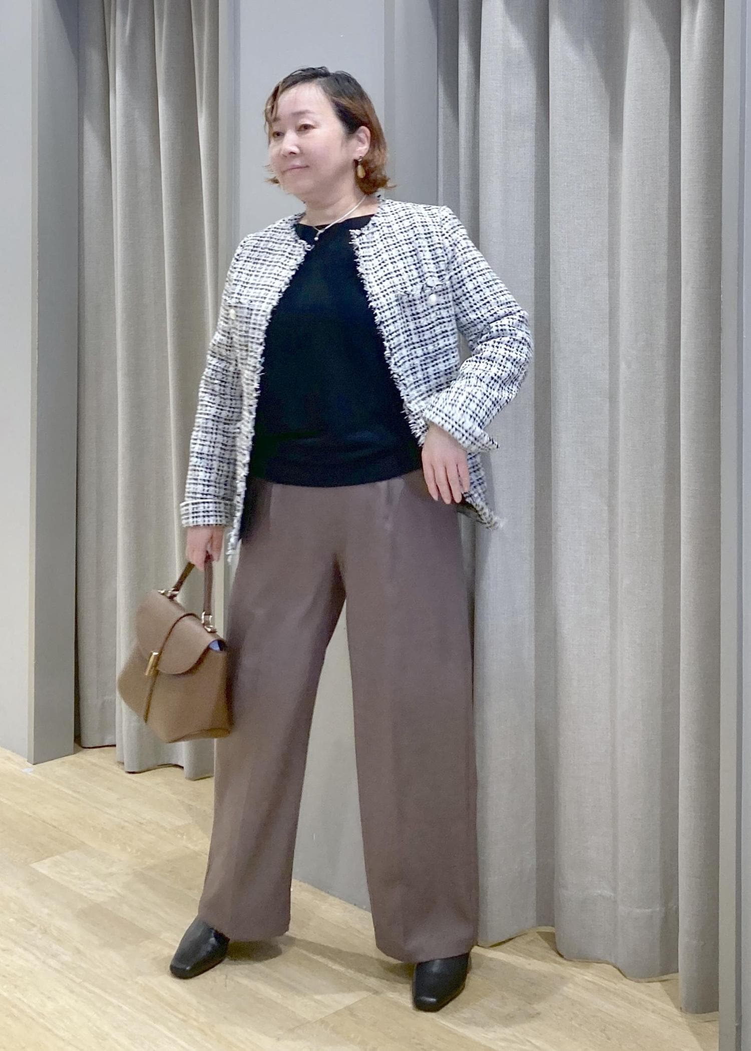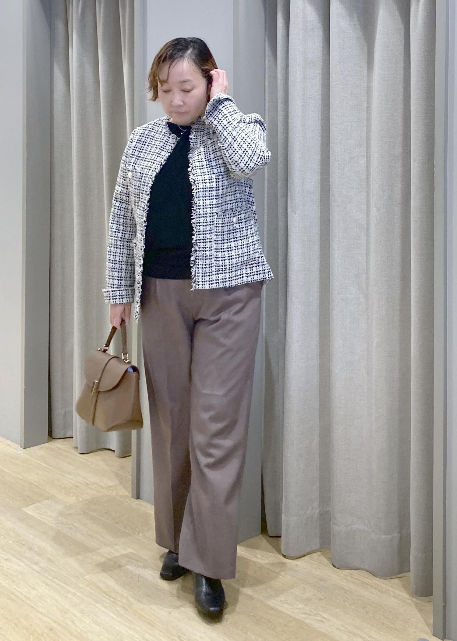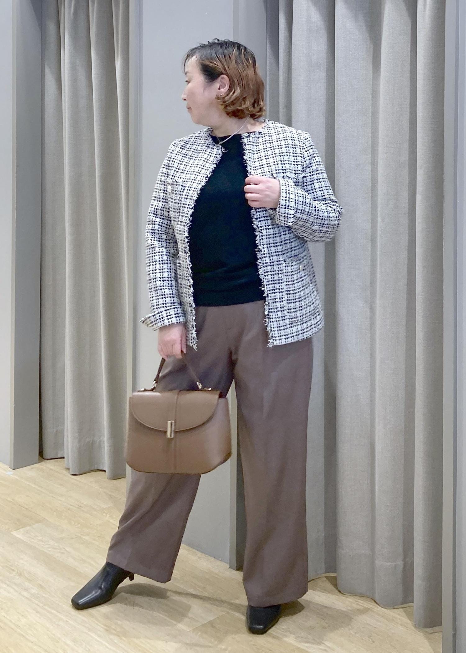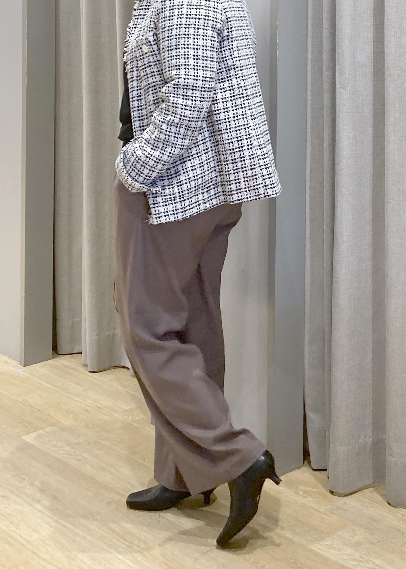 ツイードジャケットで、気になる腰回りをオシャレにカバー。