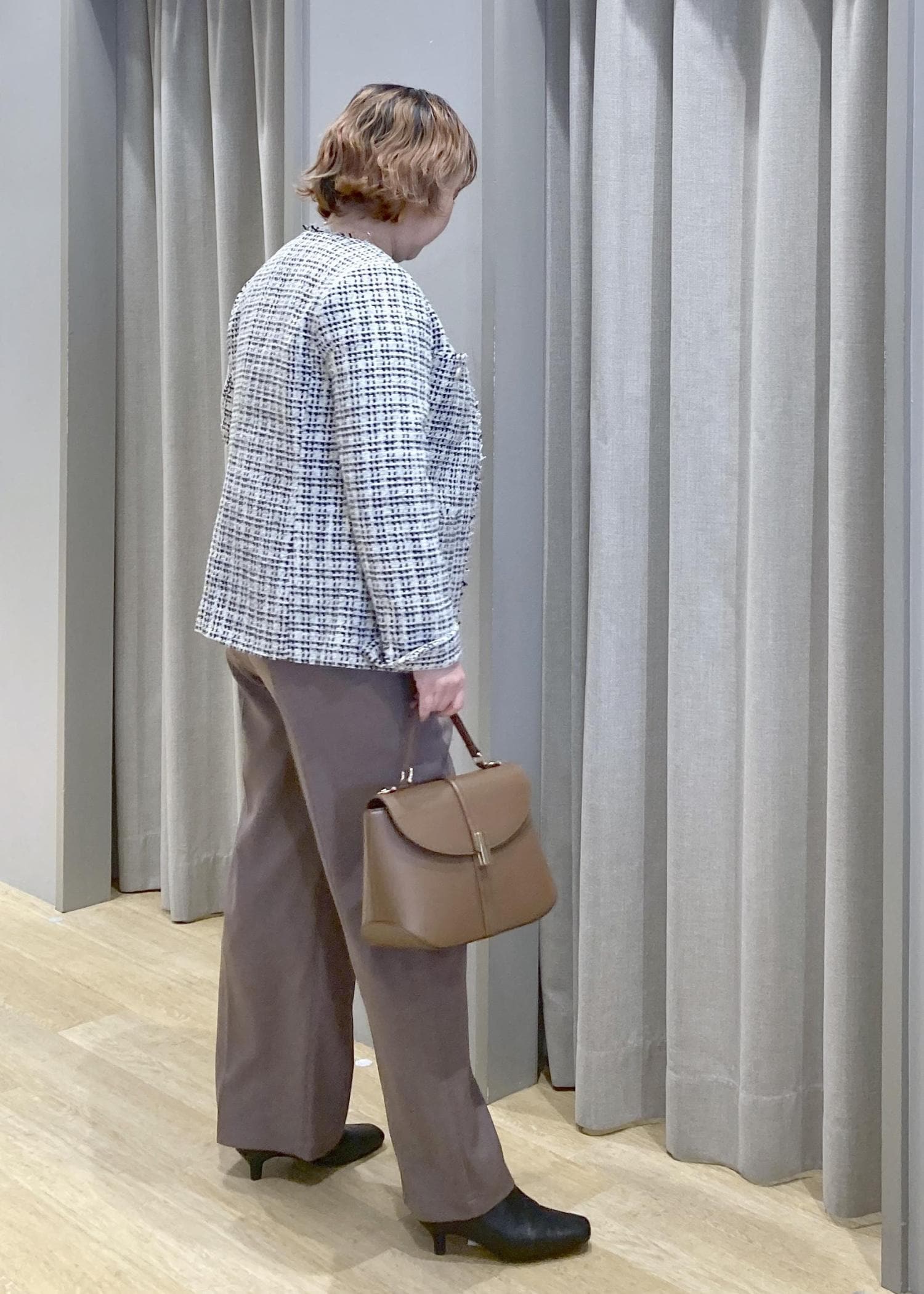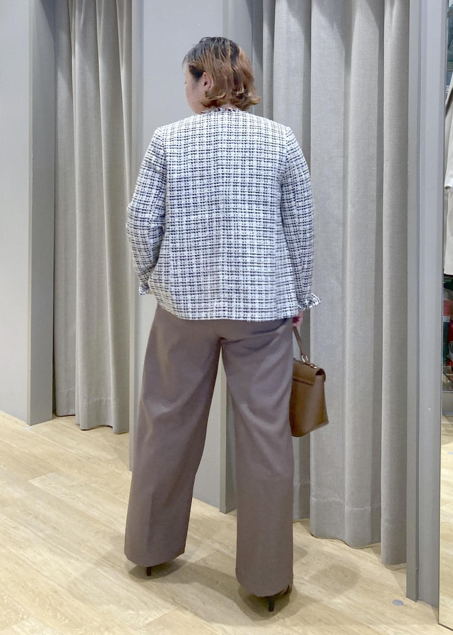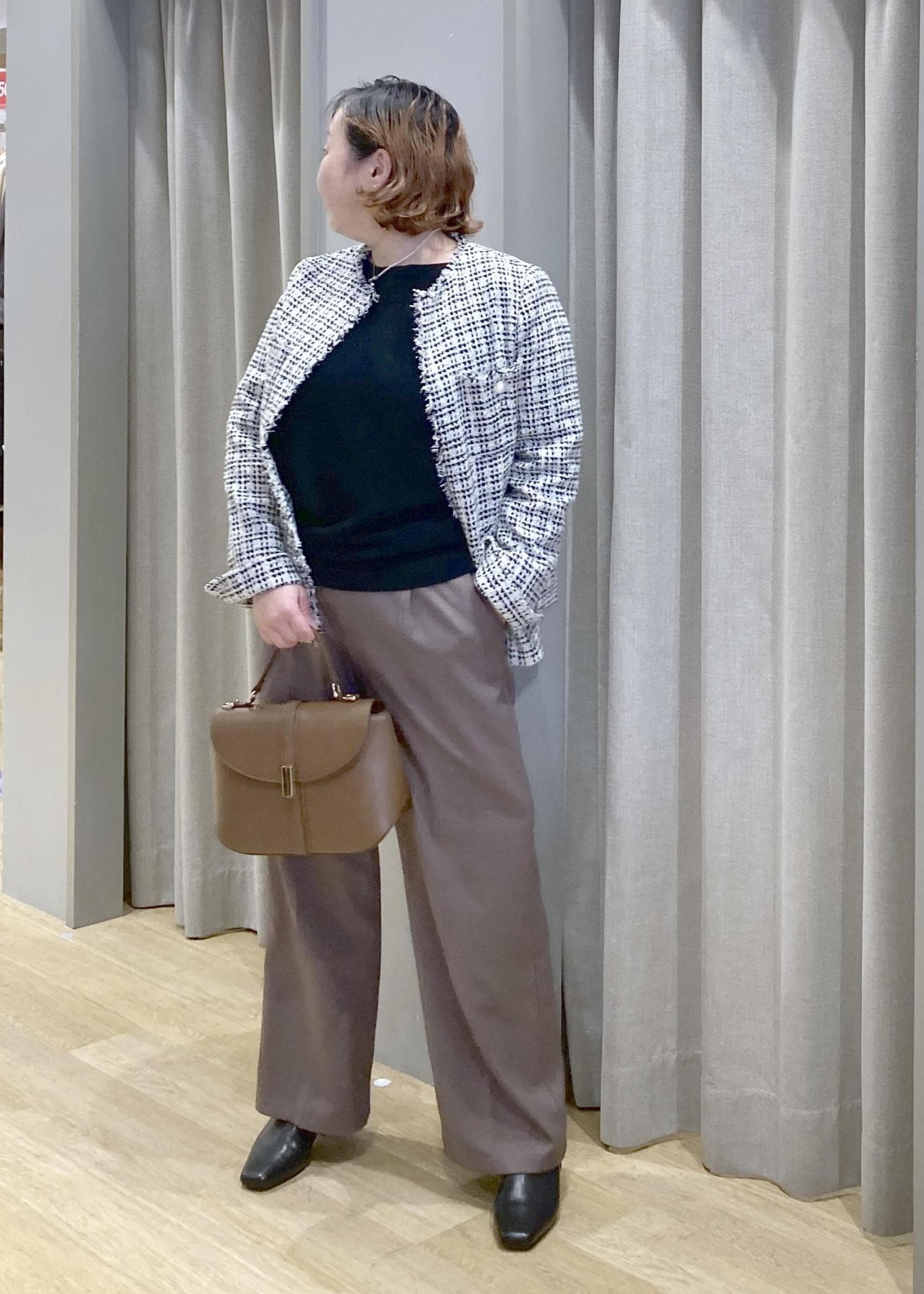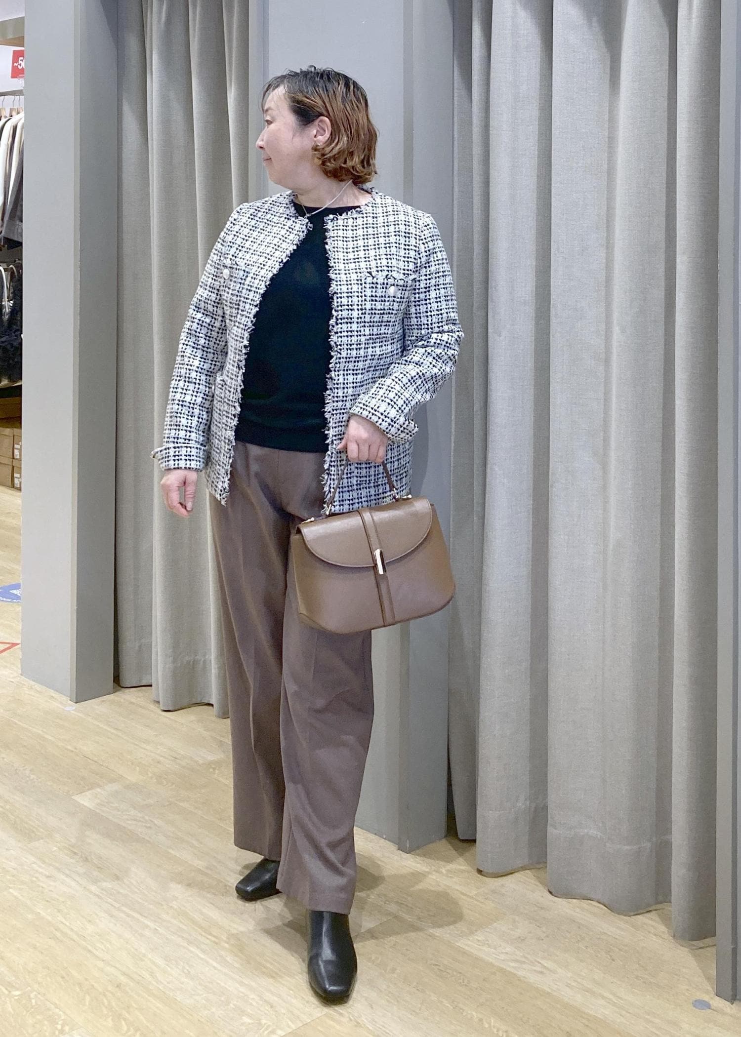 ツイードジャケットで、気になる腰回りをオシャレにカバー。