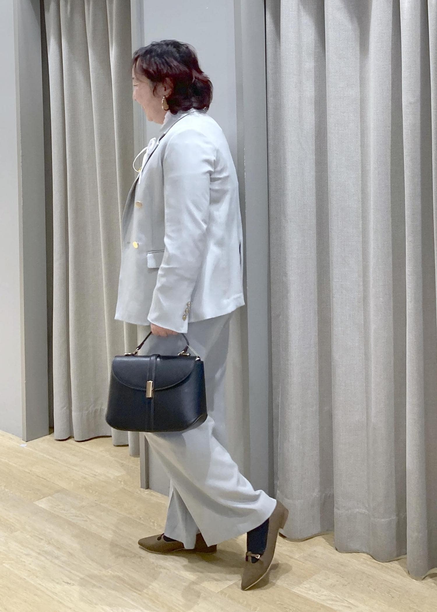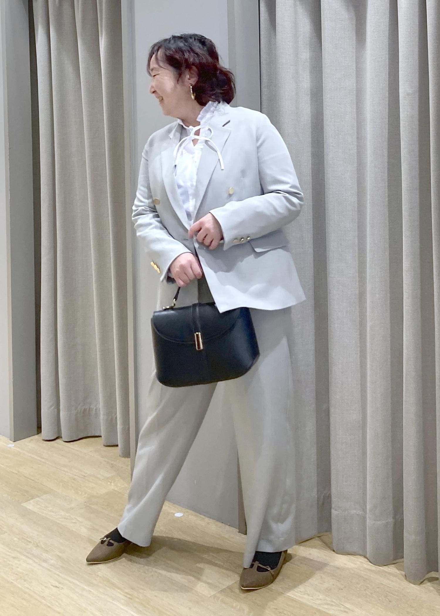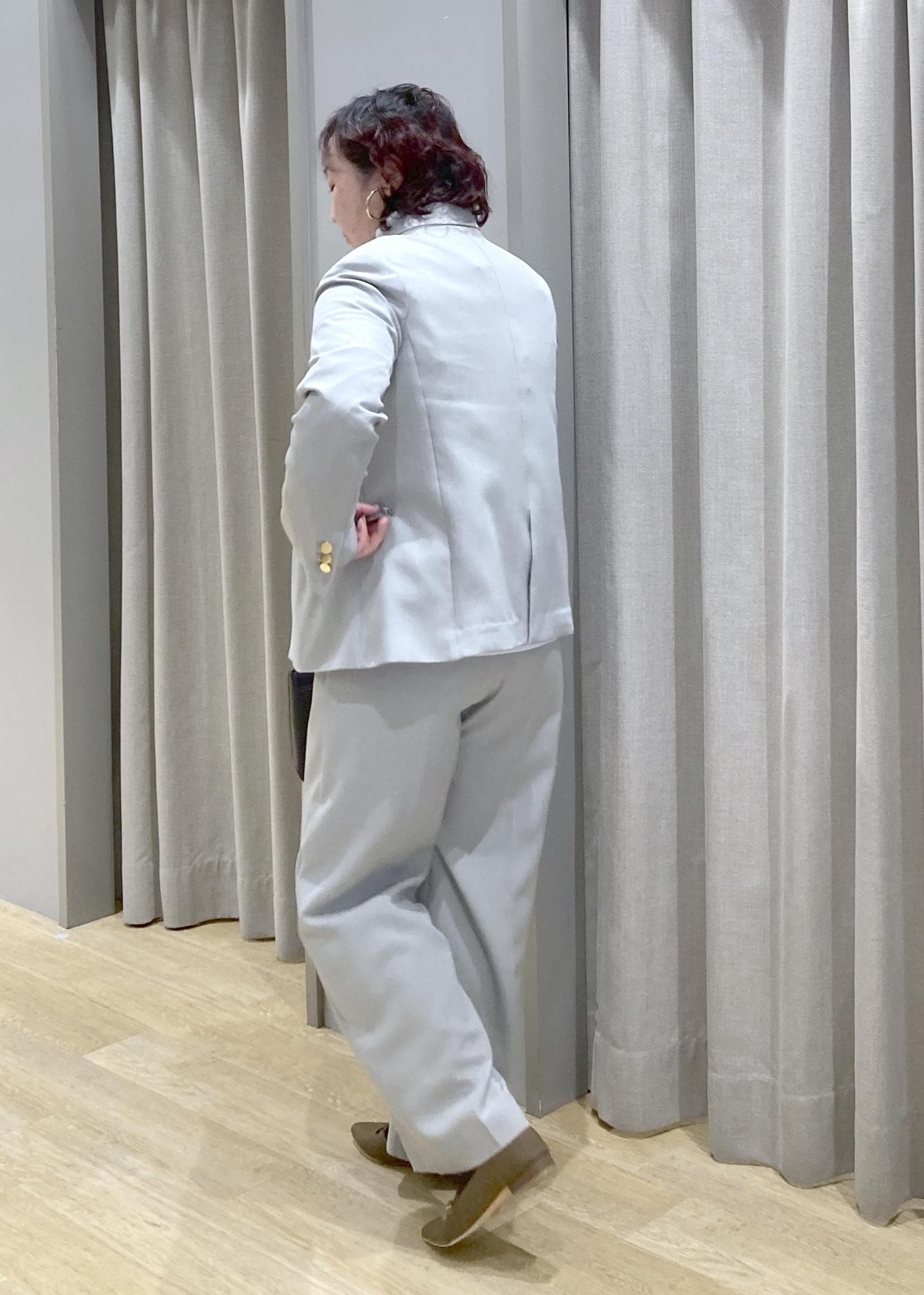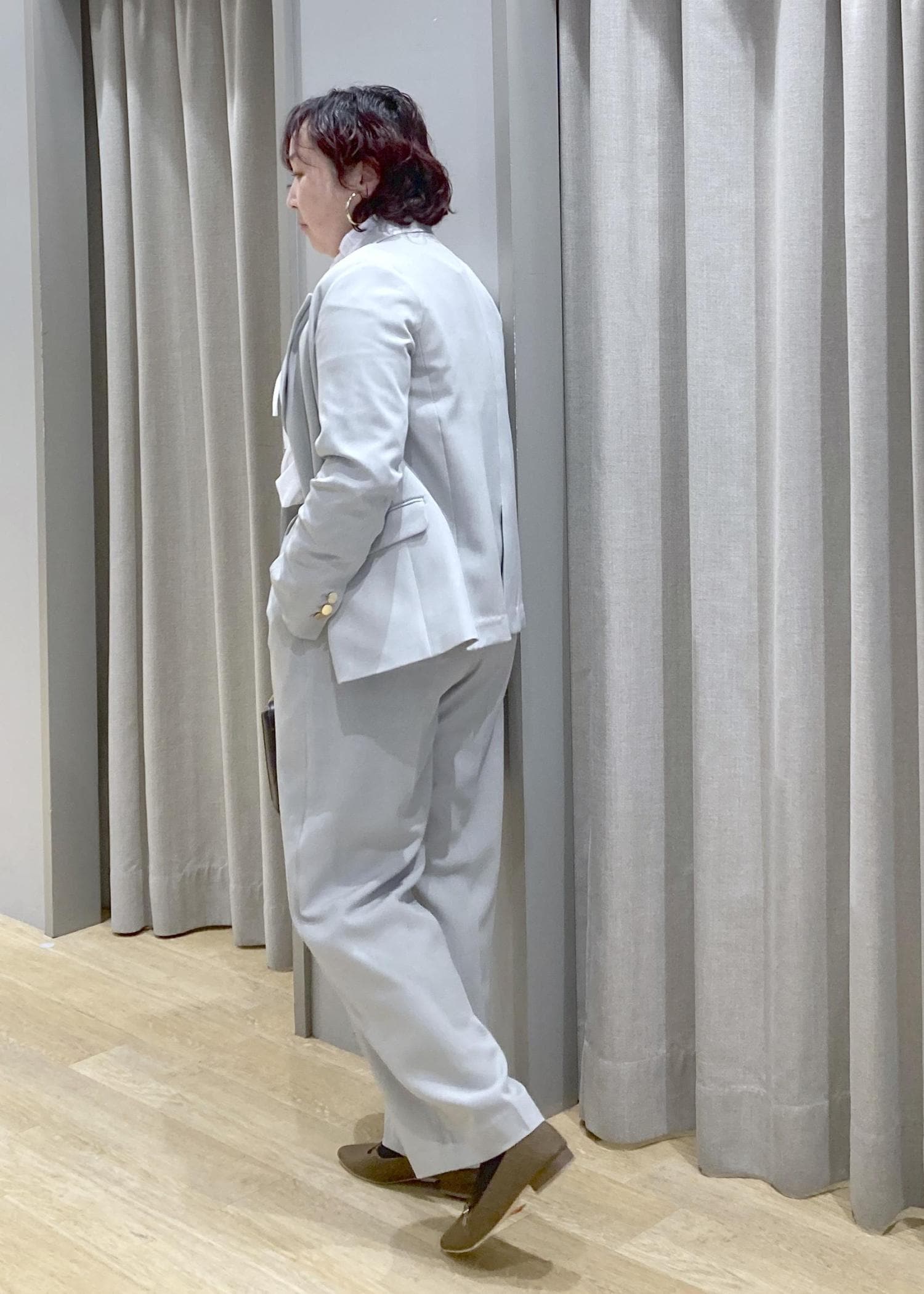 淡いカラーのセットアップは、体のラインを拾いにくくて自然に体型カバー。