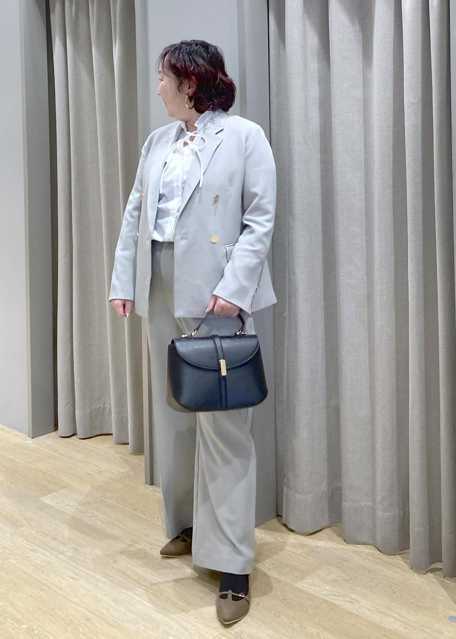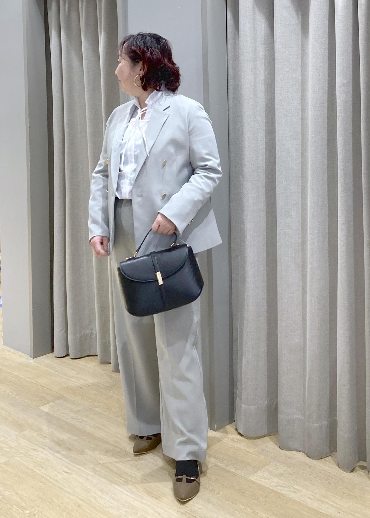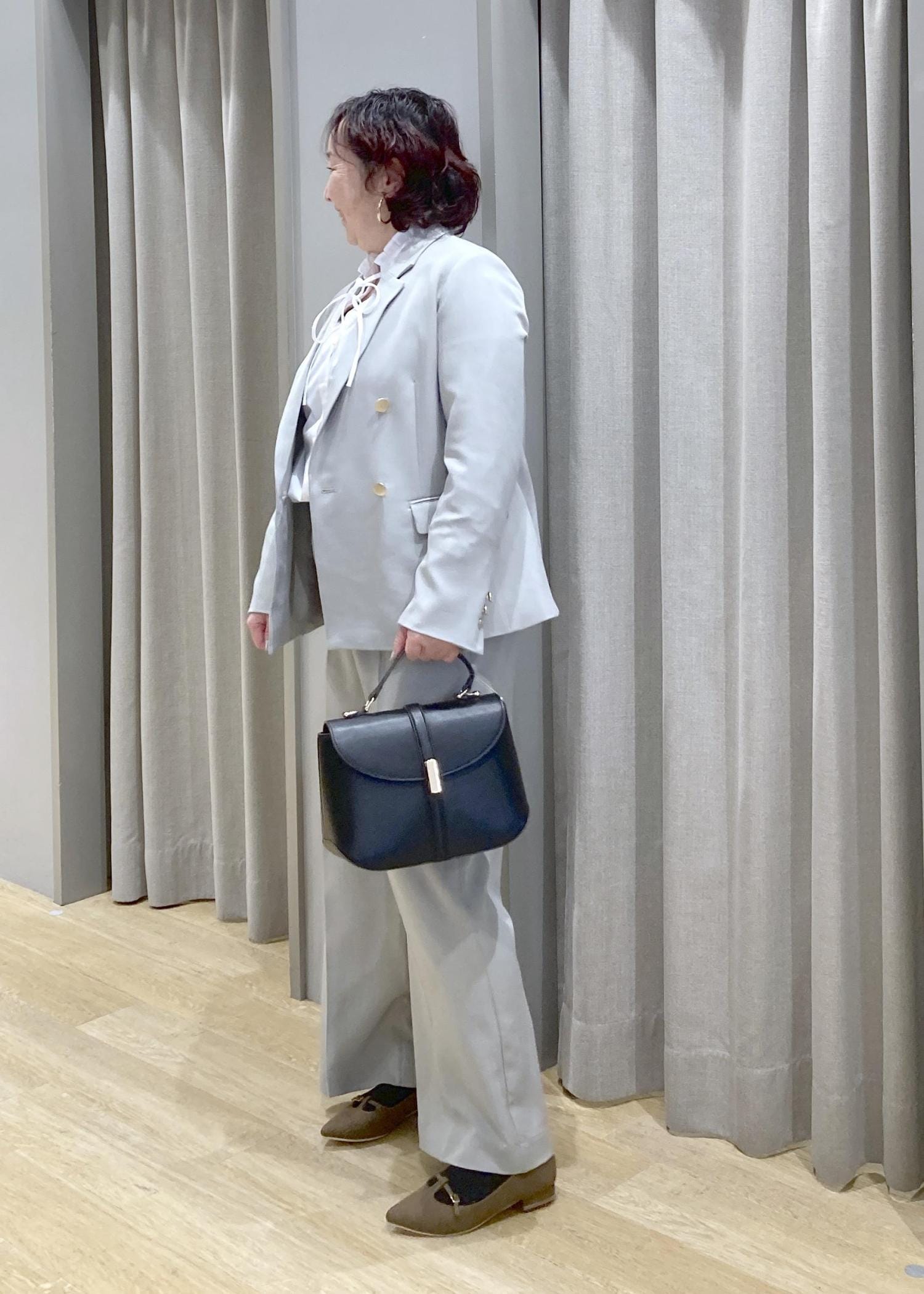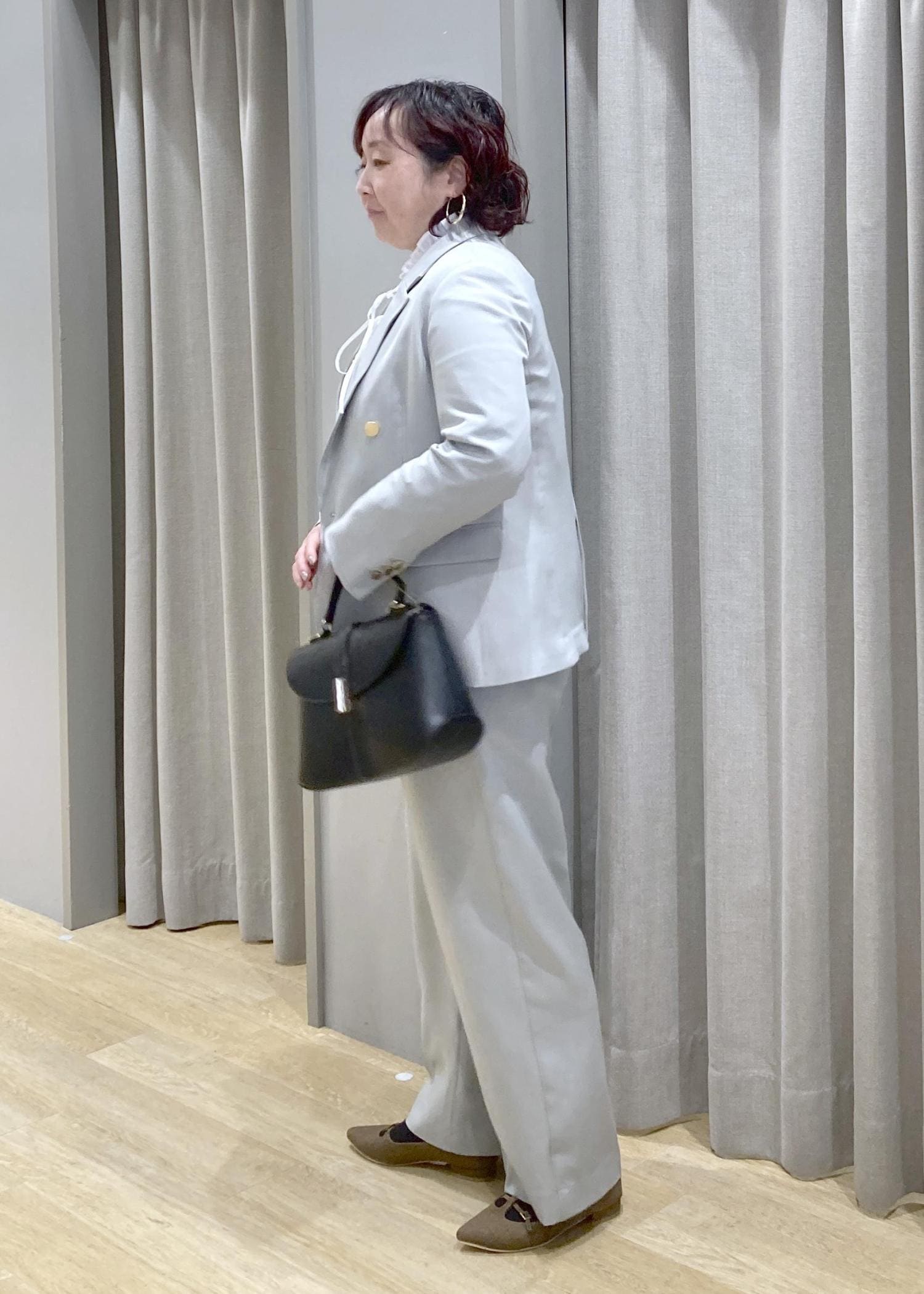 淡いカラーのセットアップは、体のラインを拾いにくくて自然に体型カバー。