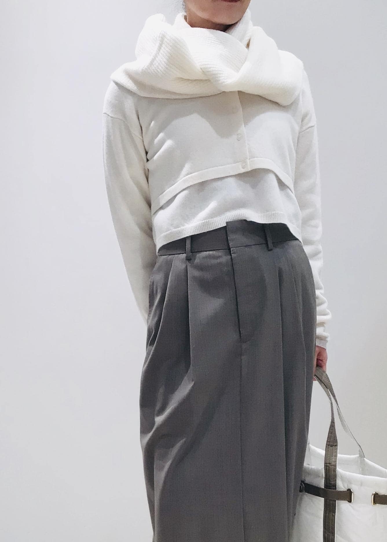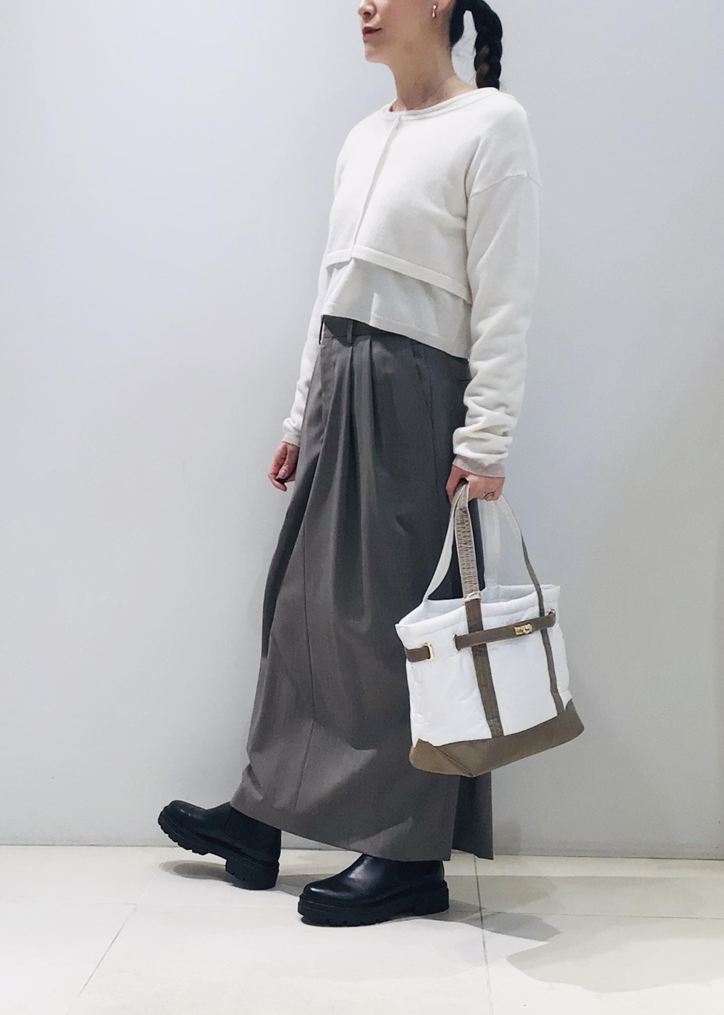 プルオーバーはウエストにかかるくらい、カーディガンは胸下までのクロップド丈なので旬なコーデに♩
