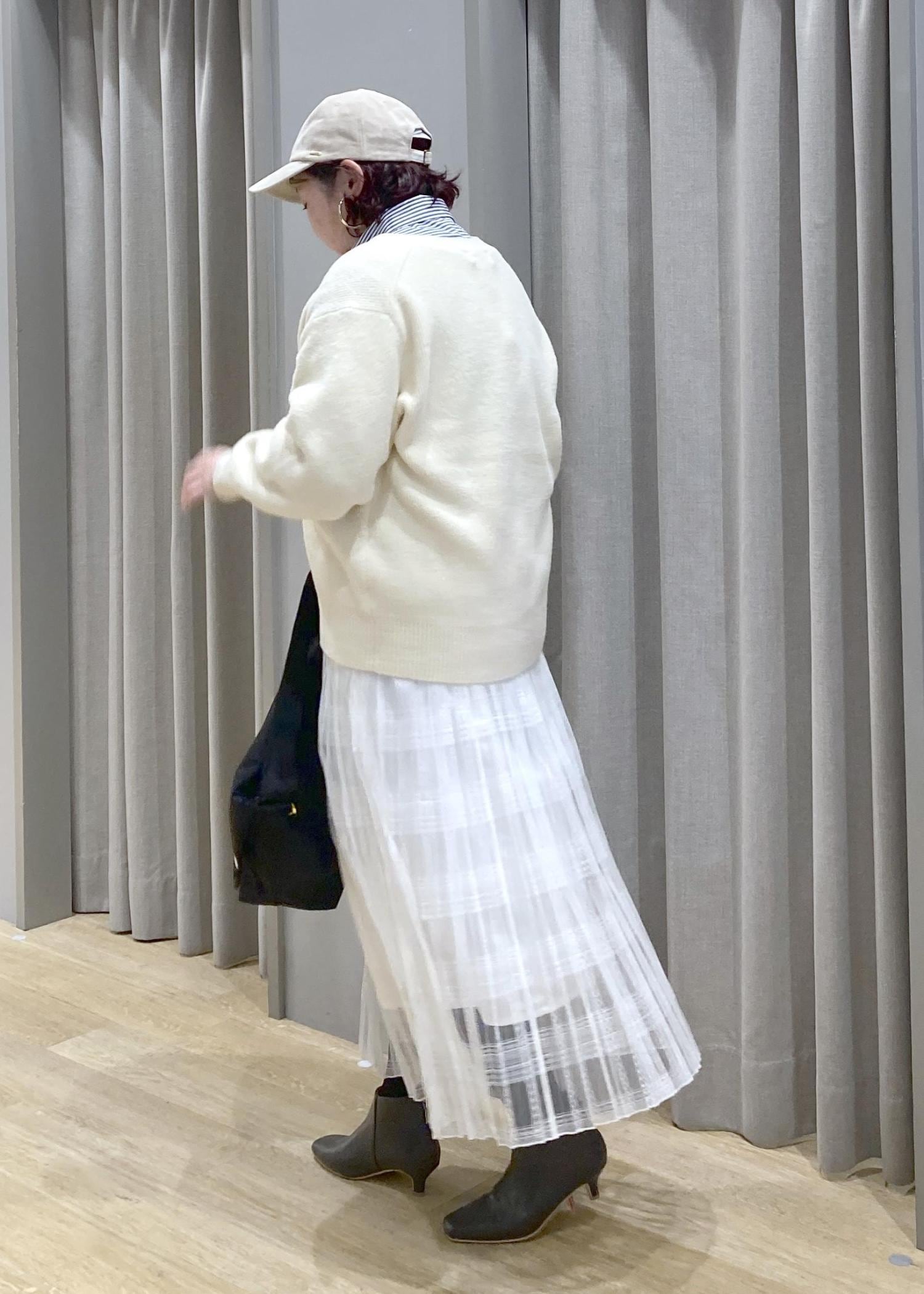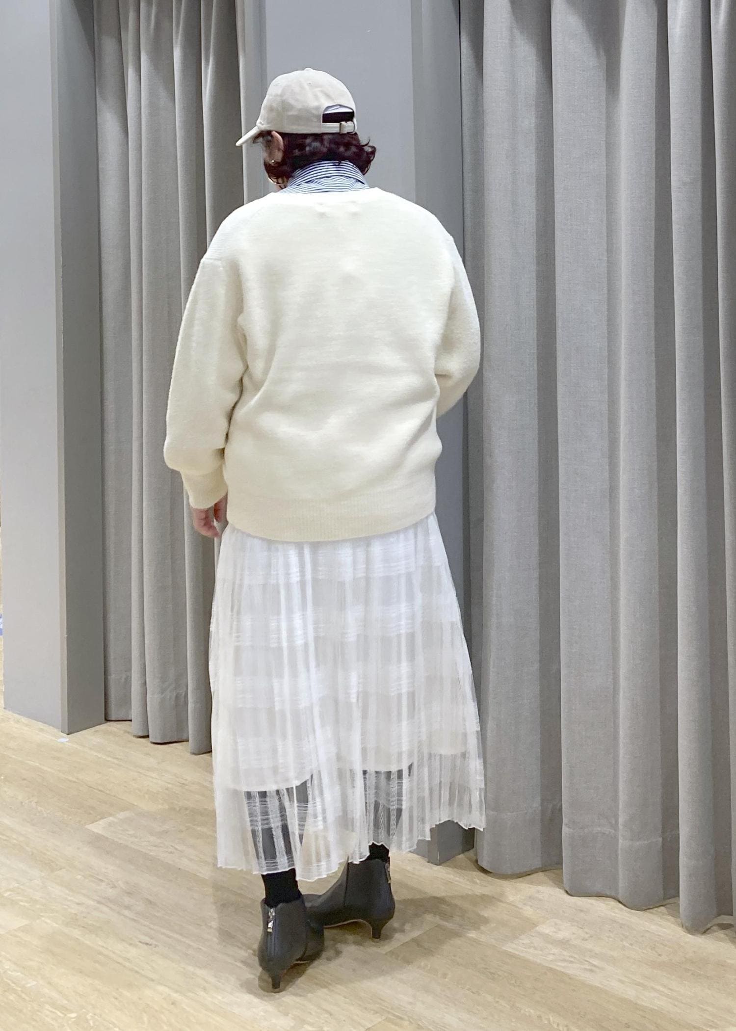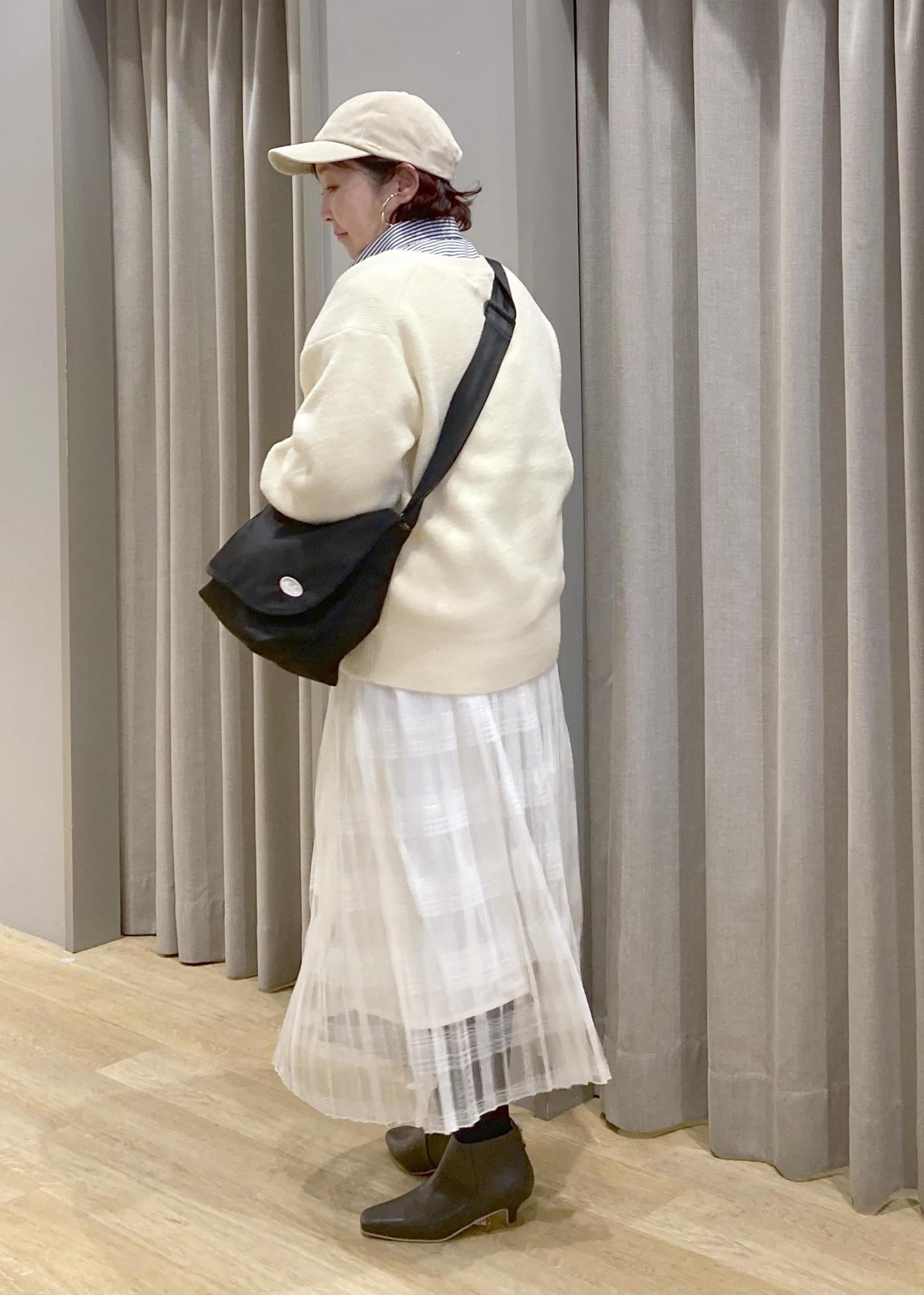 白スカート合わせで軽さを出して、抜け感のある大人スタイルに。