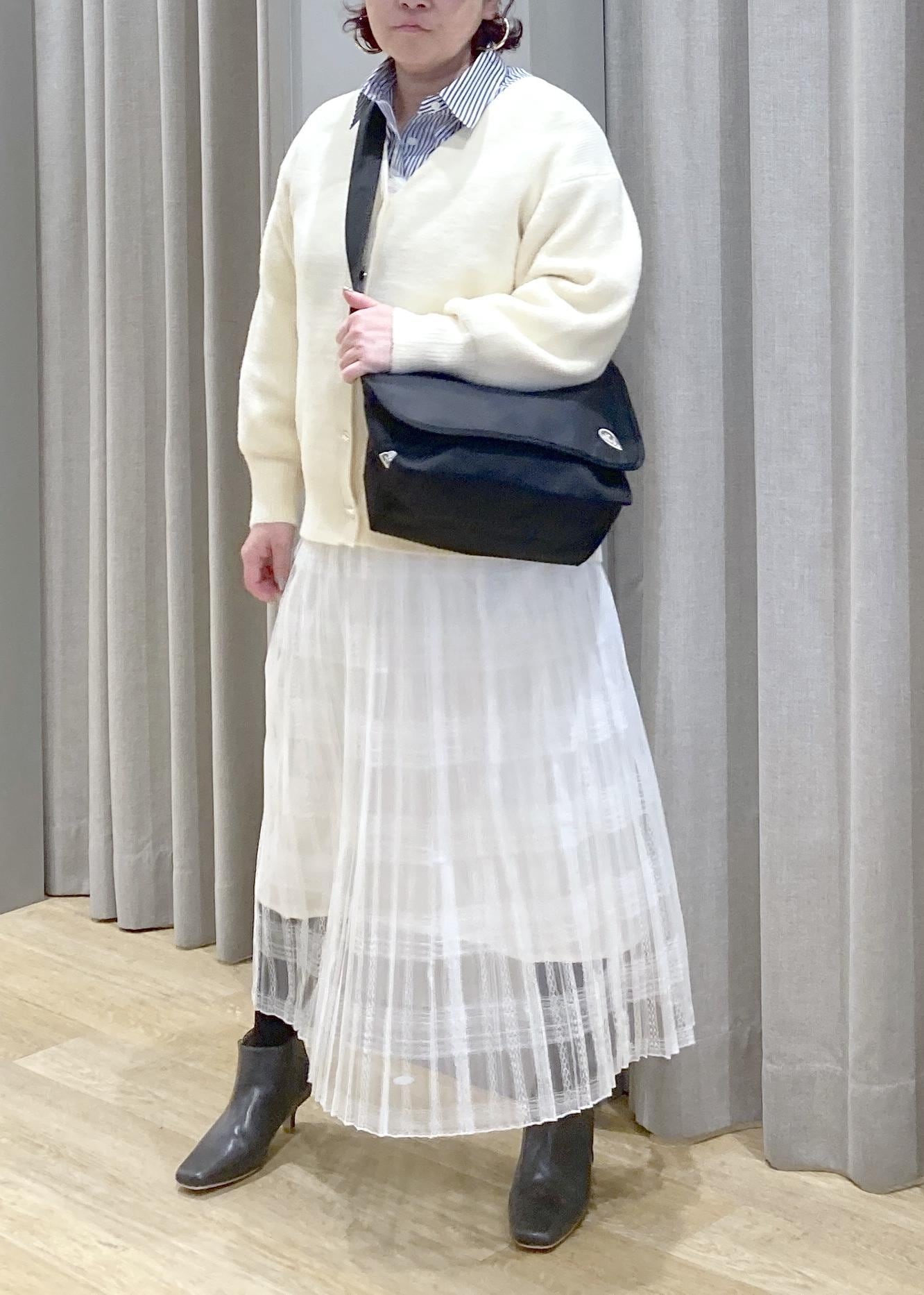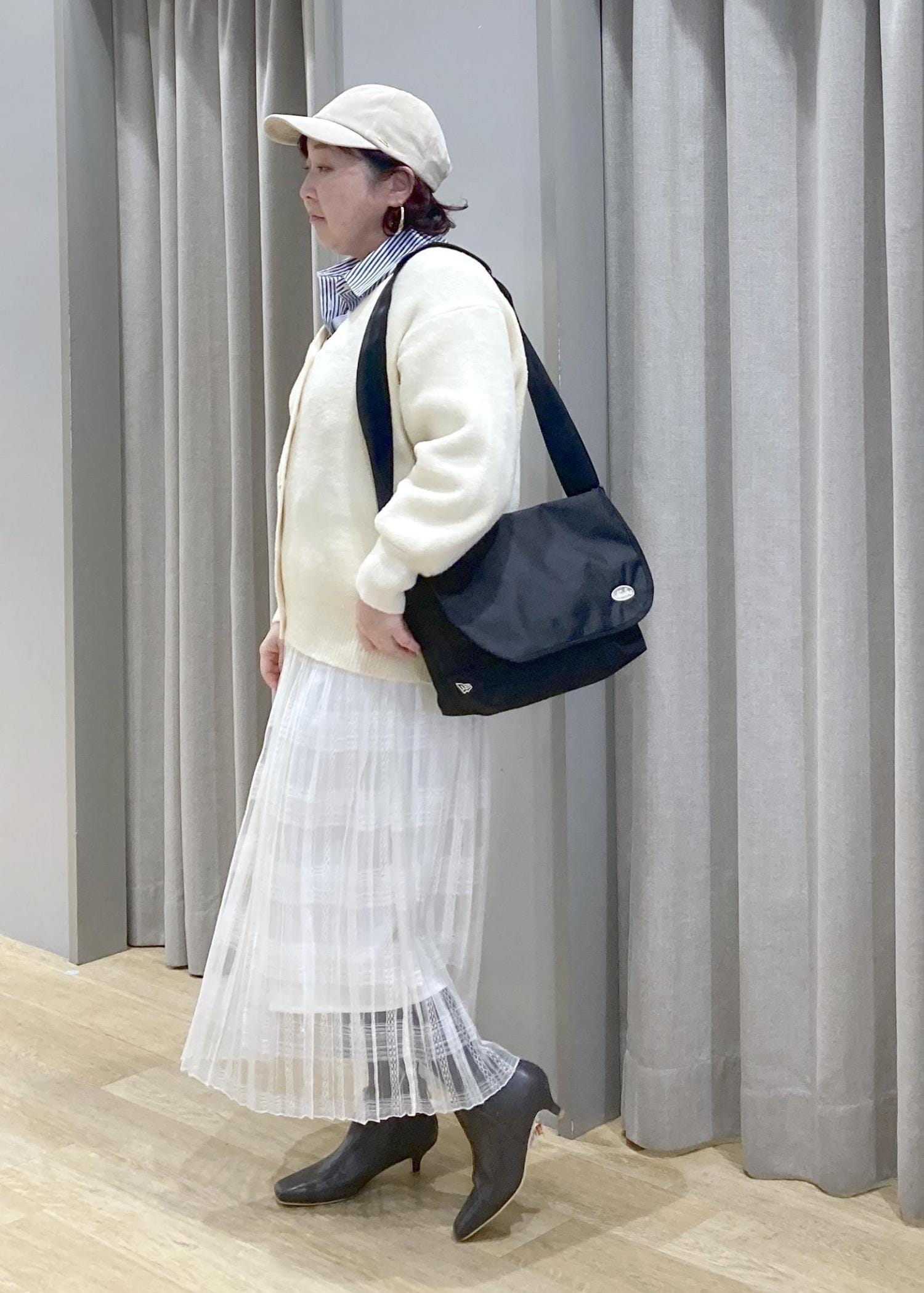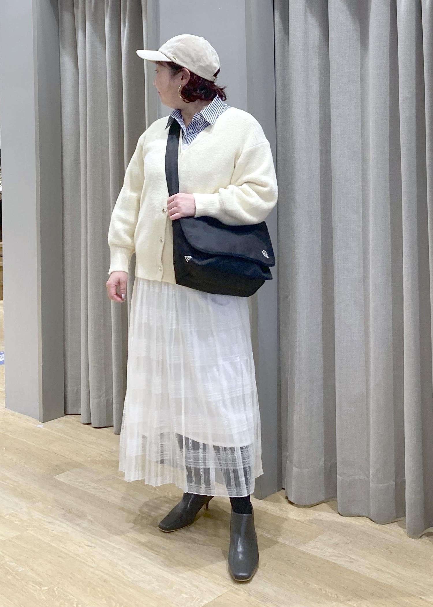 白スカート合わせで軽さを出して、抜け感のある大人スタイルに。