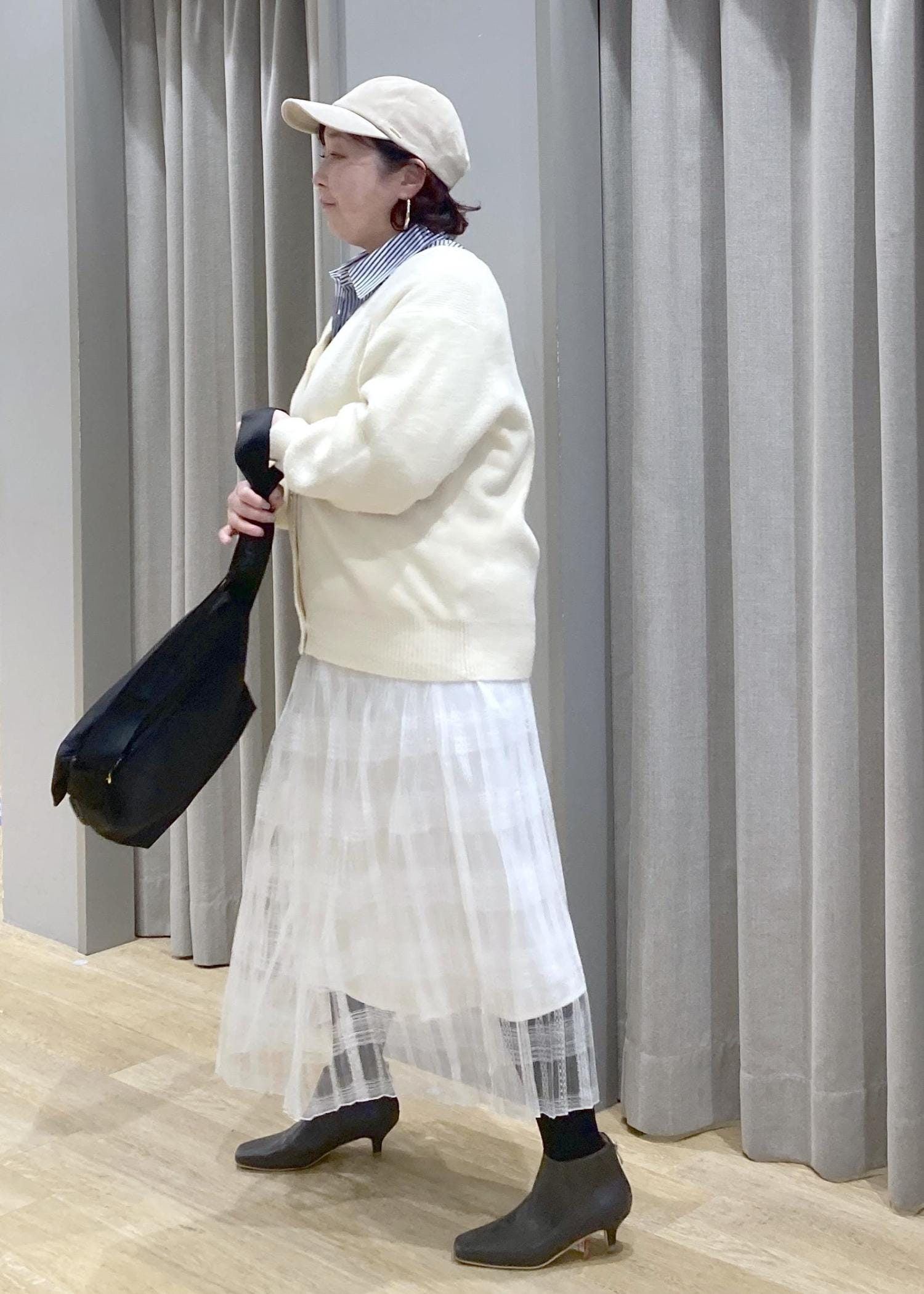 ゆったりカーデで体のラインを拾わず、自然に体型カバー。