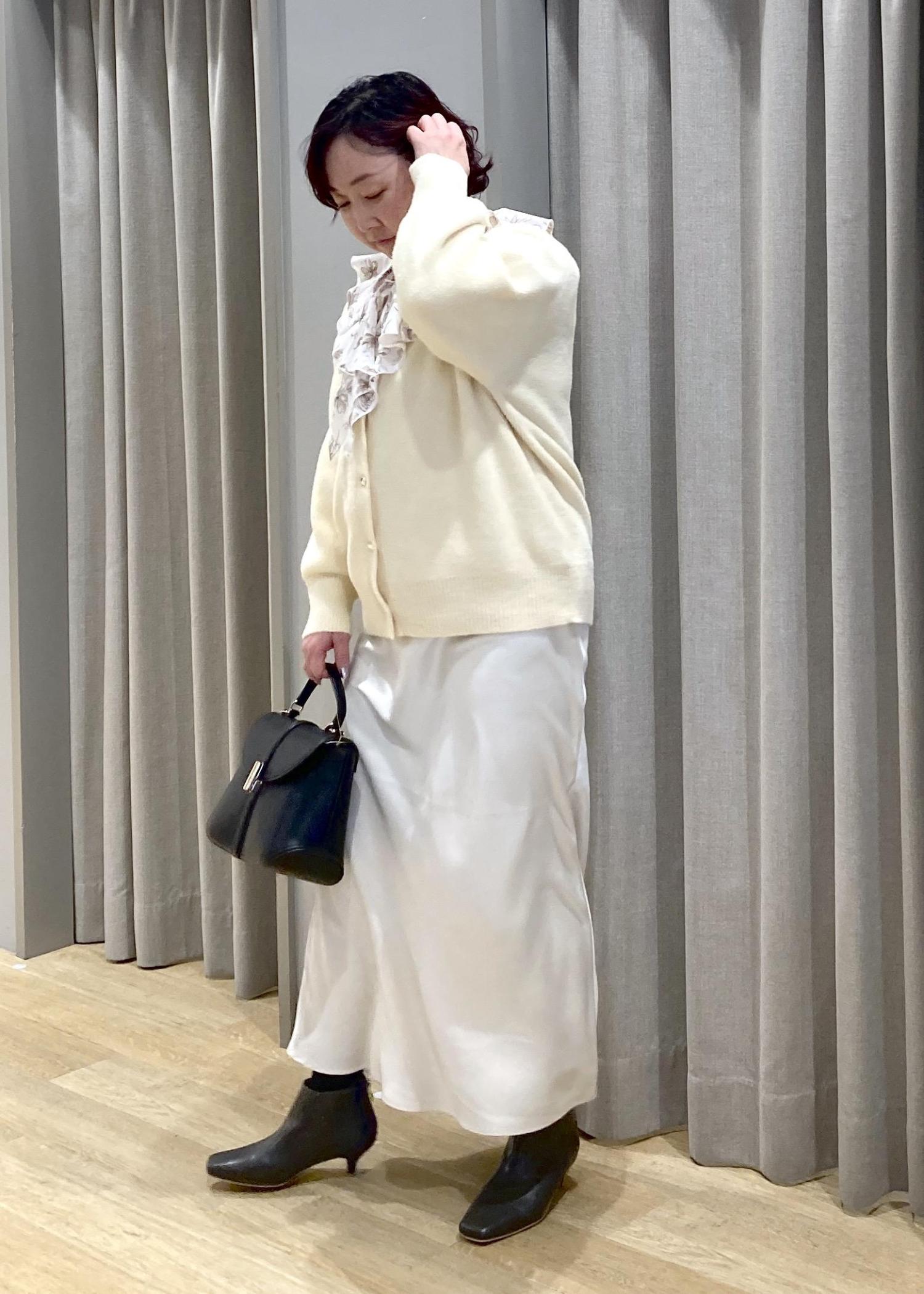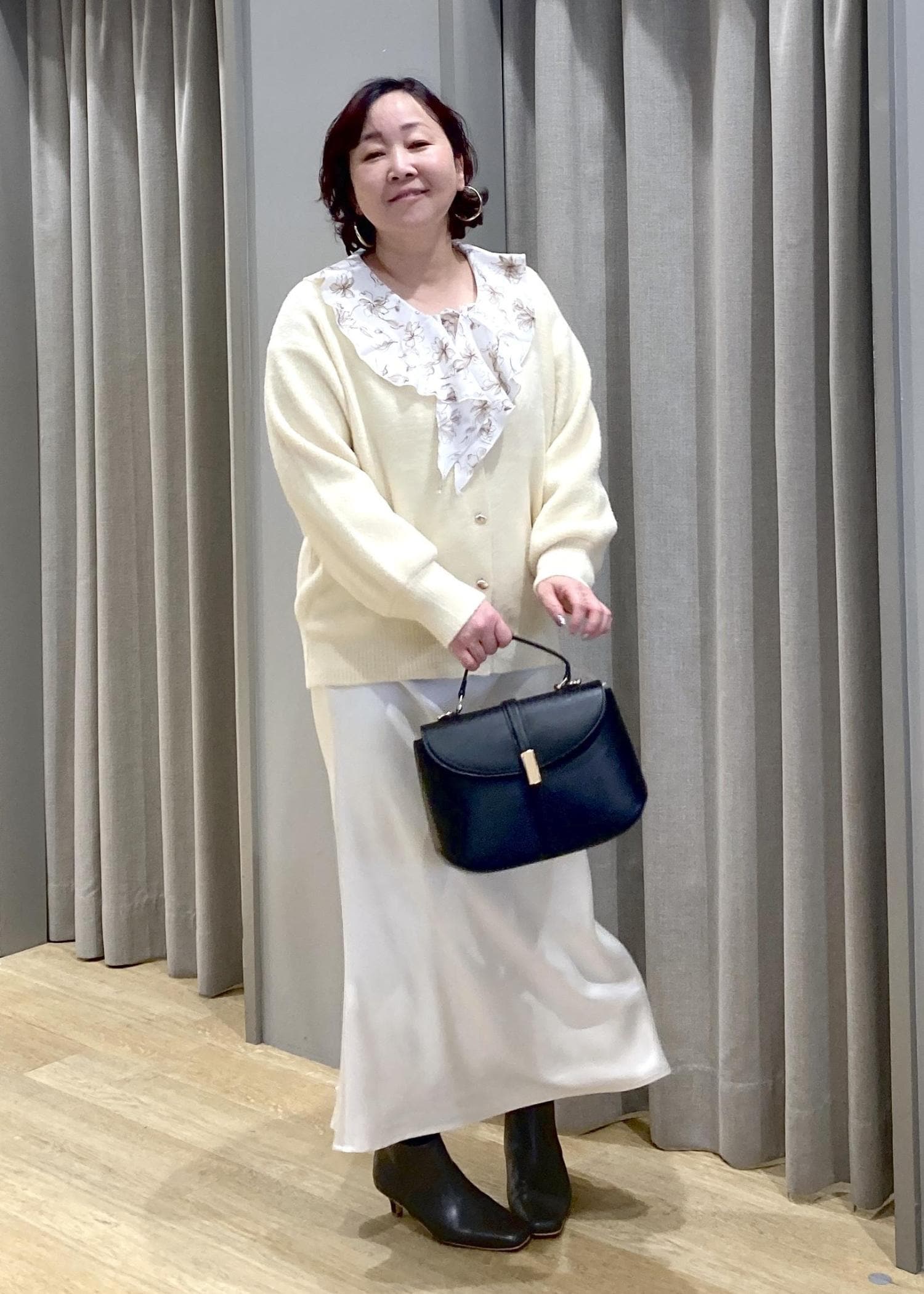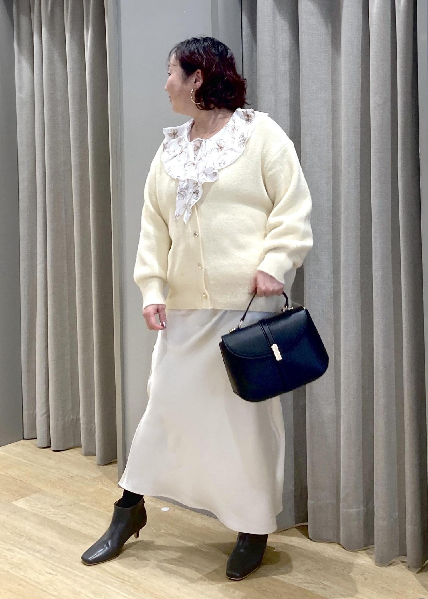ラッフルブラウスとニュアンスニットが視線を上に集めて、自然とスタイルアップ。