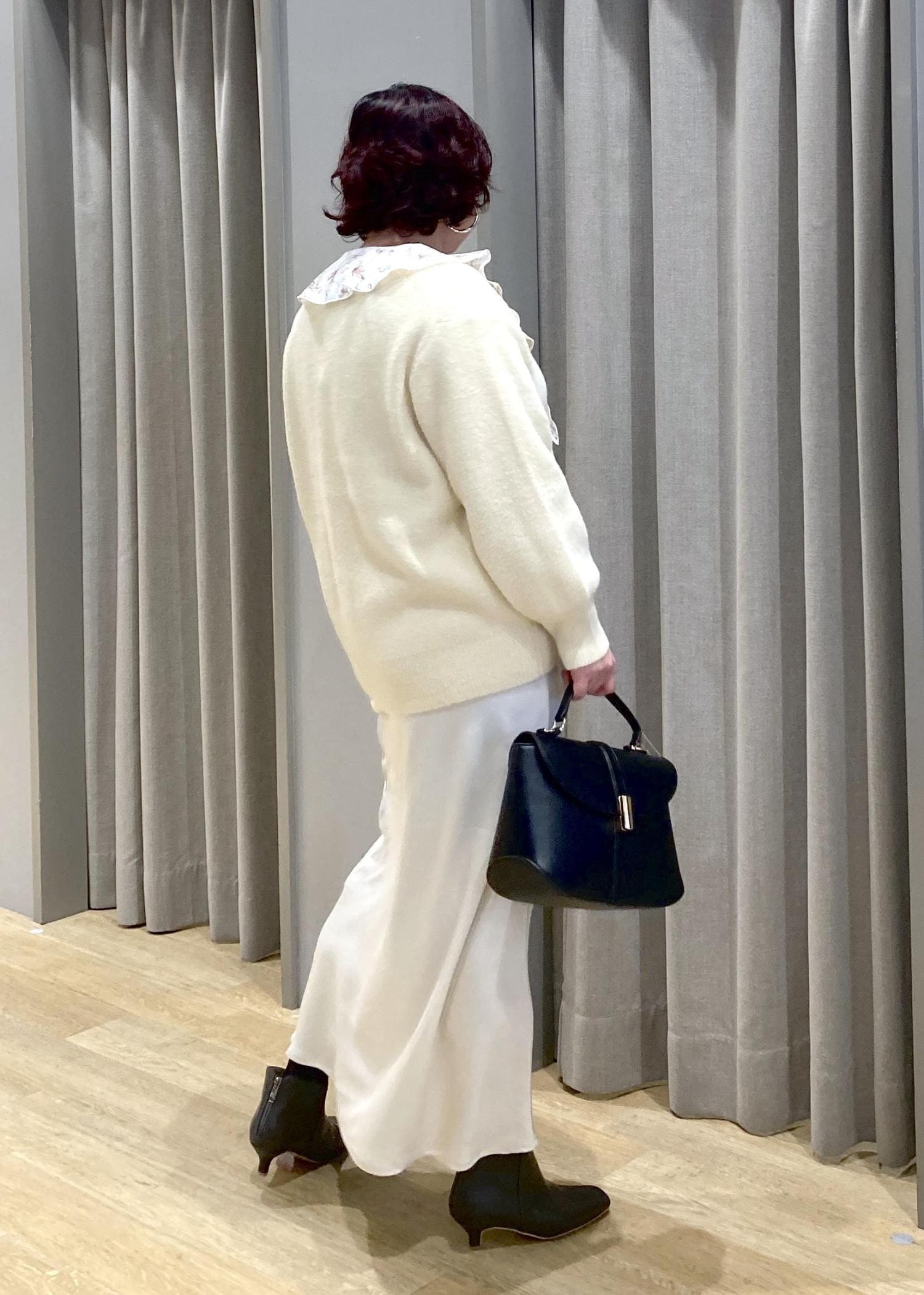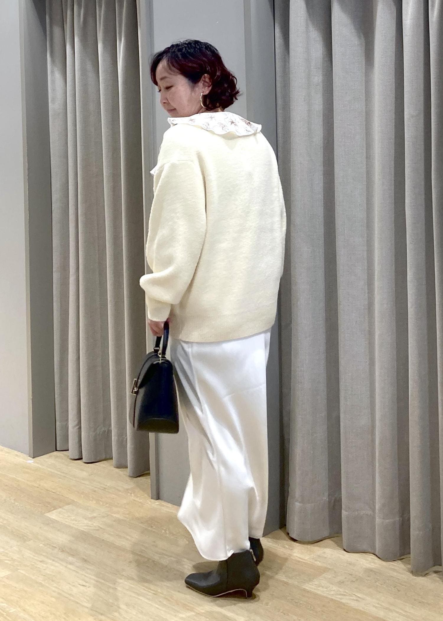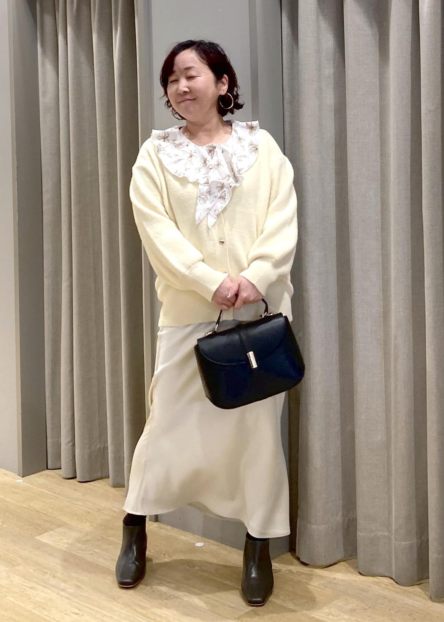 ラッフルブラウスとニュアンスニットが視線を上に集めて、自然とスタイルアップ。