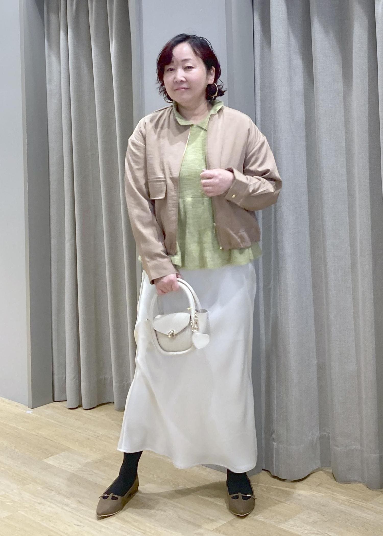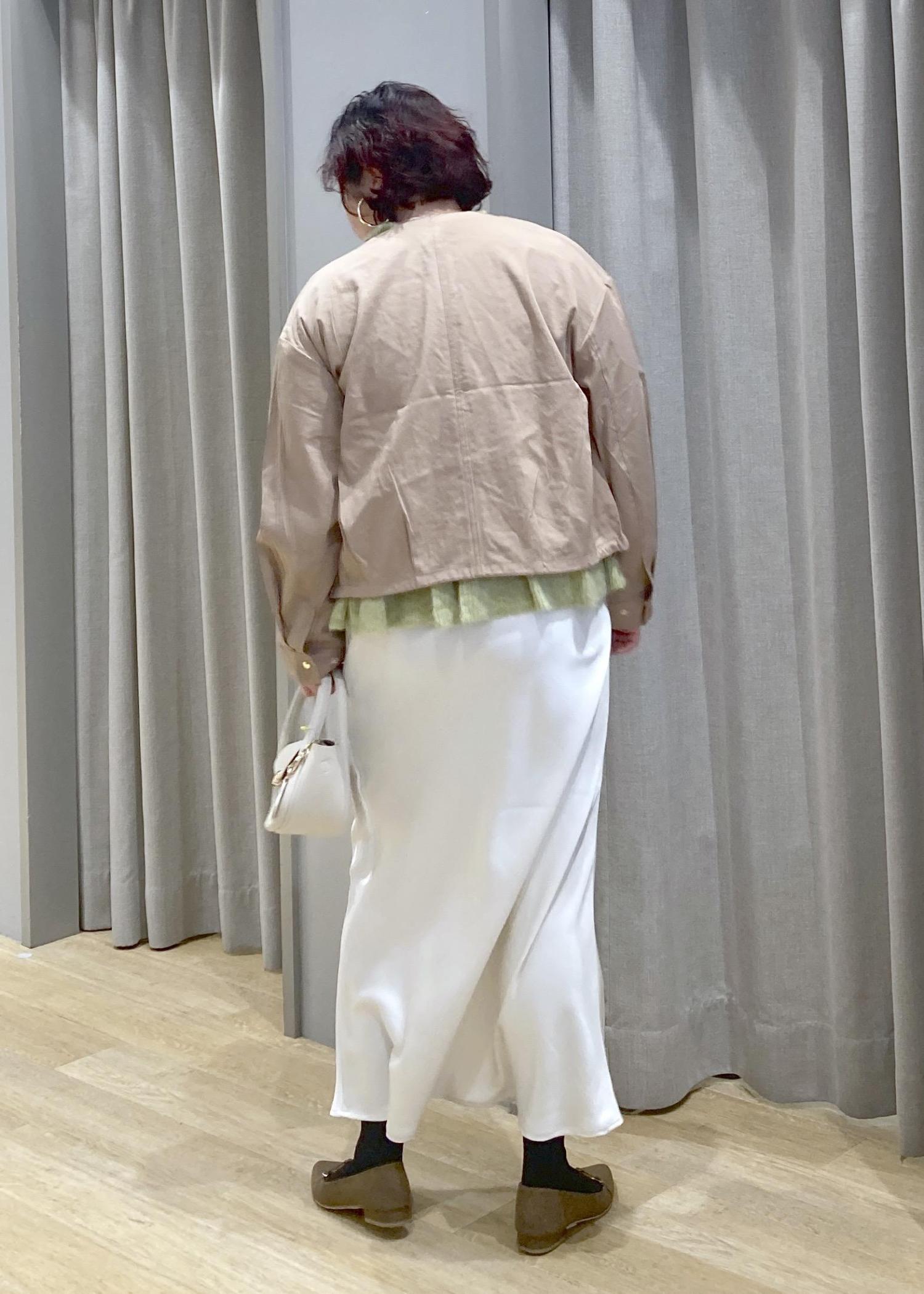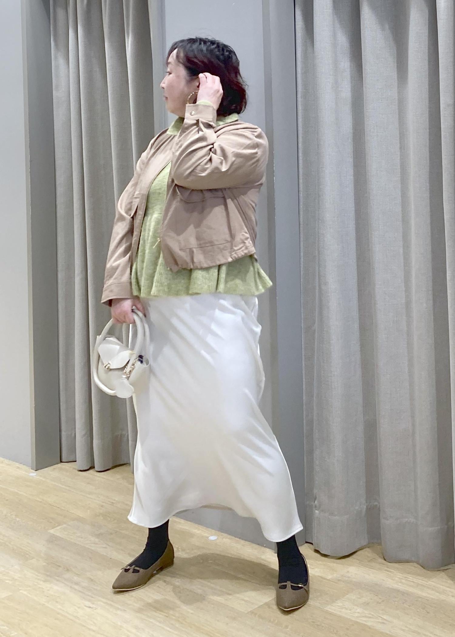 お腹周りはインナーのニットでふんわり隠しつつ、明るめトーンで顔映りも華やかに。