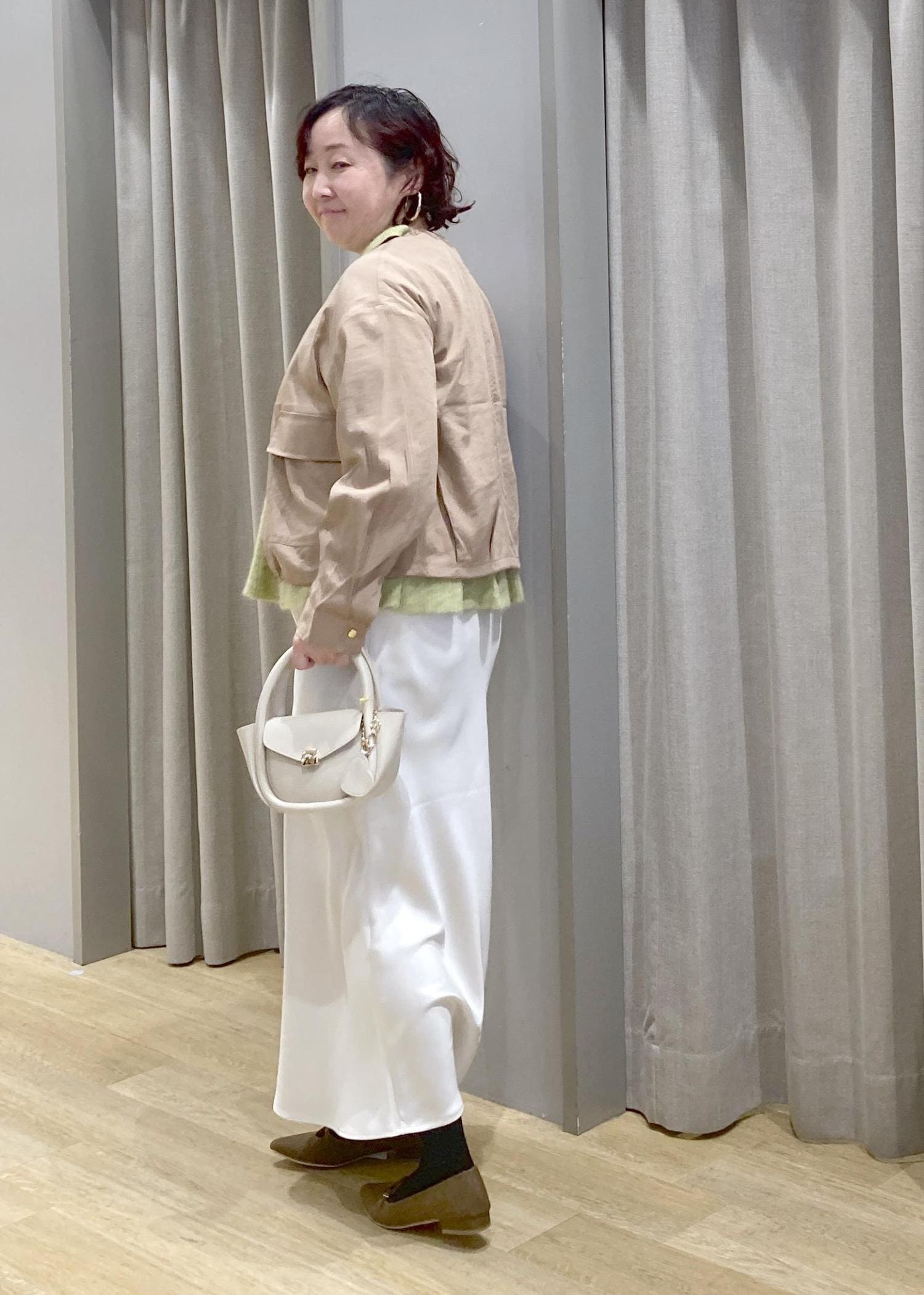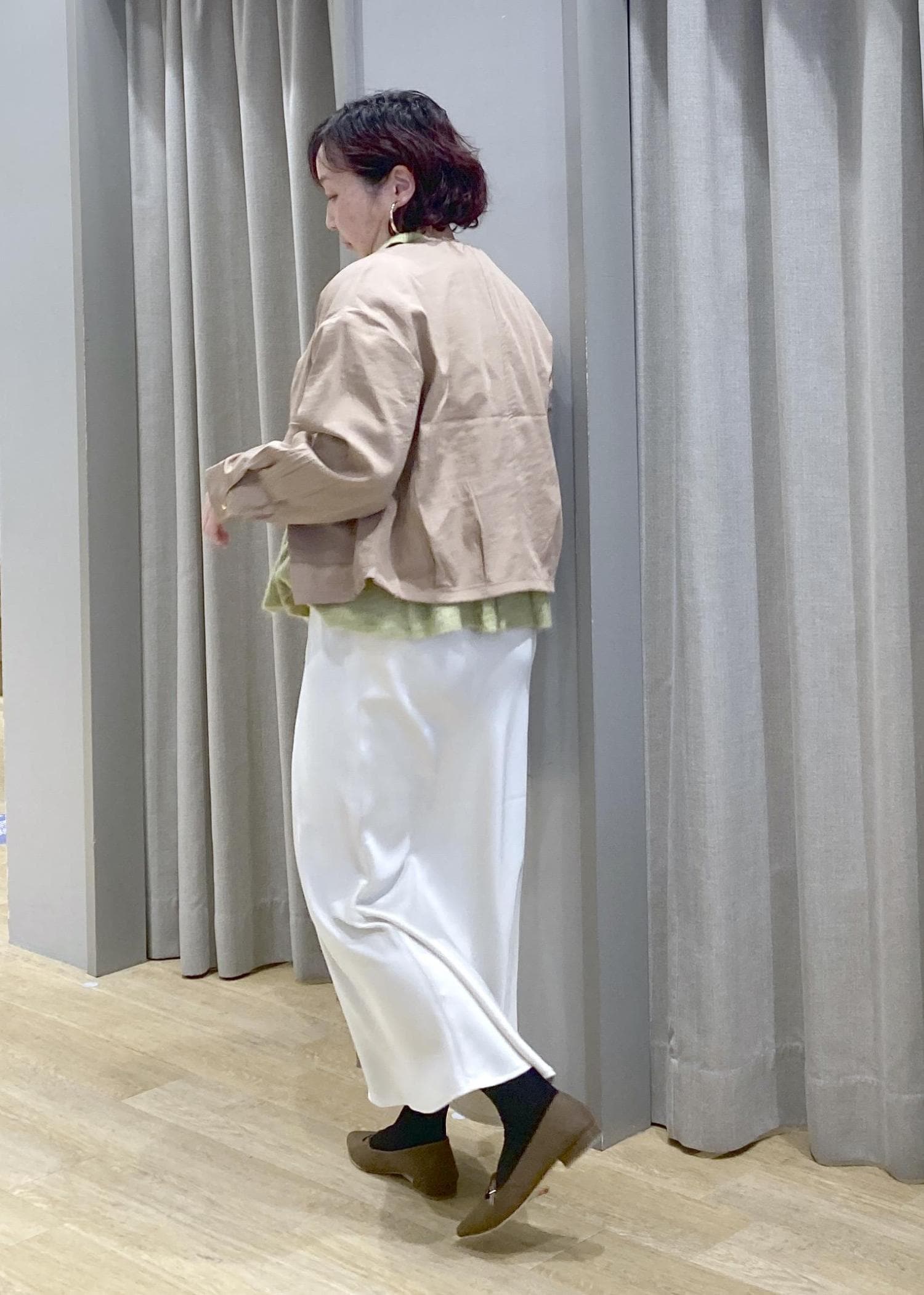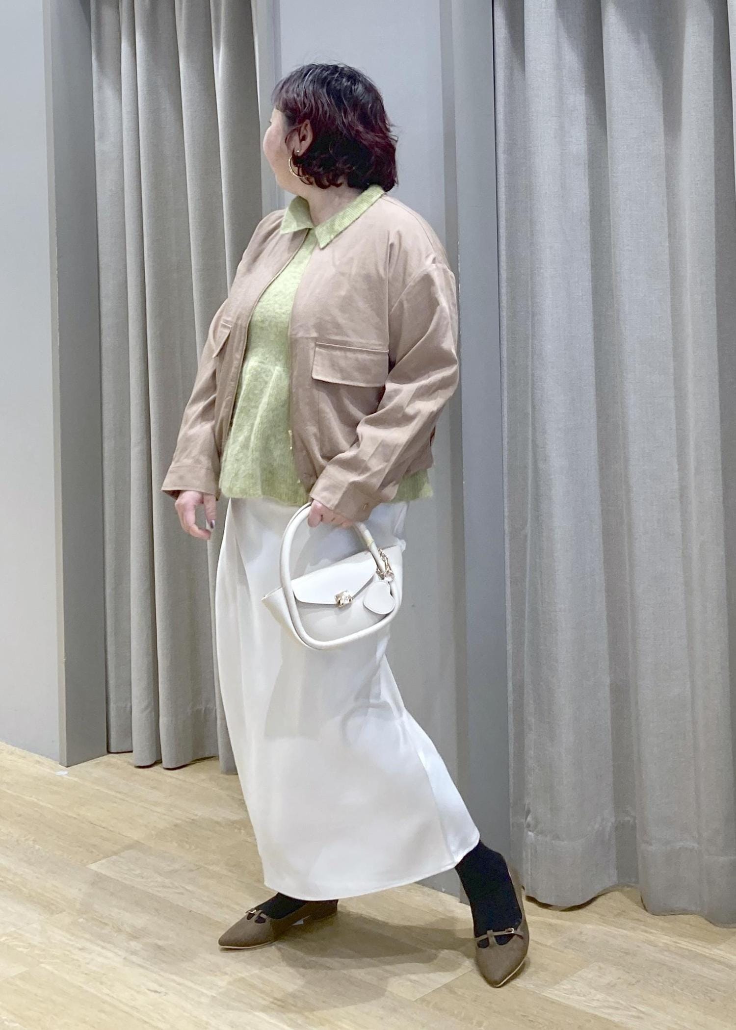 お腹周りはインナーのニットでふんわり隠しつつ、明るめトーンで顔映りも華やかに。