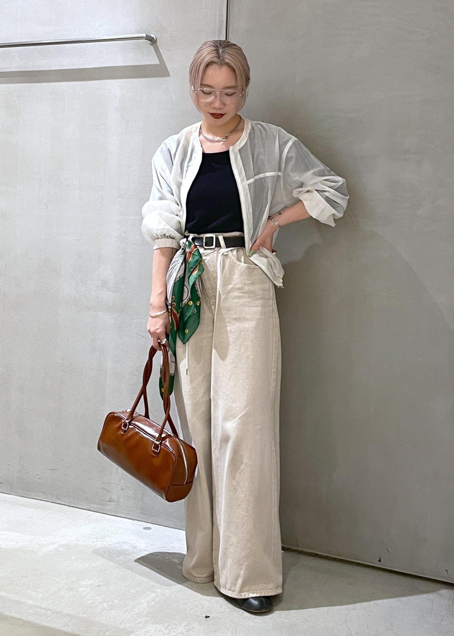裾レースがポイントのデザイン性のあるカーディガンを主役に、ワイドデニムに合わせてキレイ目カジュアルなスタイリングにしました。