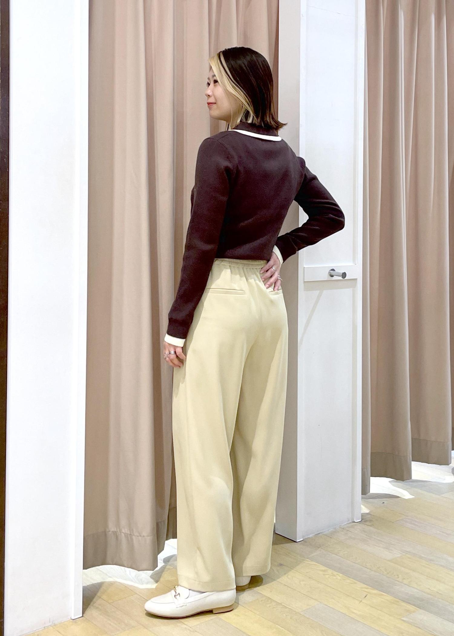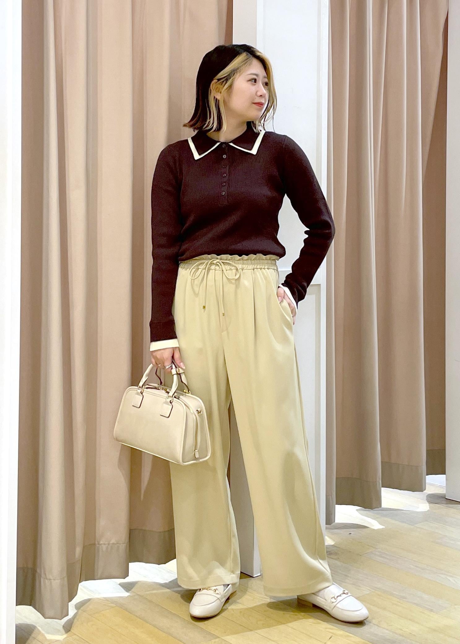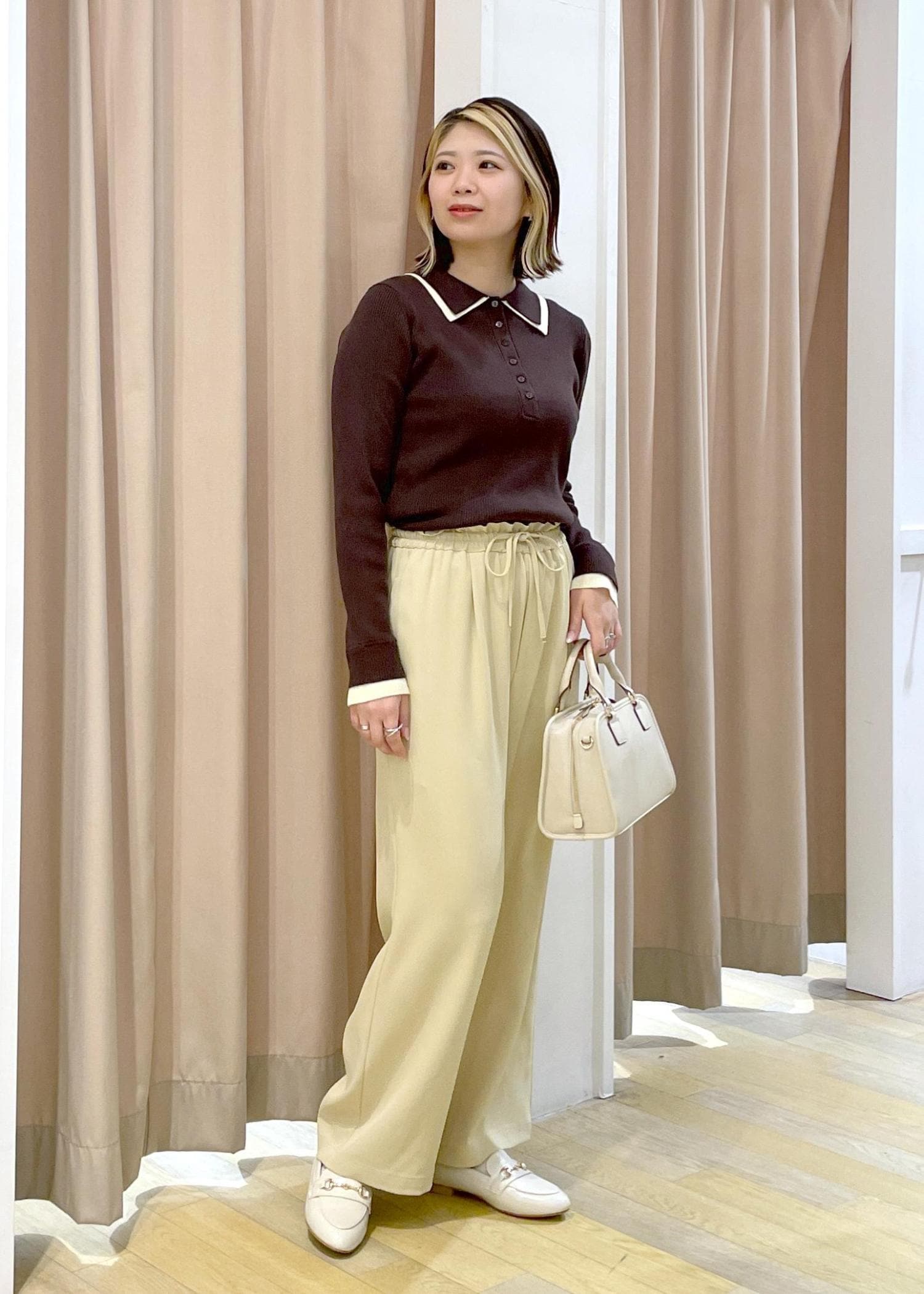 ブラウンのニットにイエローのパンツを合わせた春見えスタイルです!