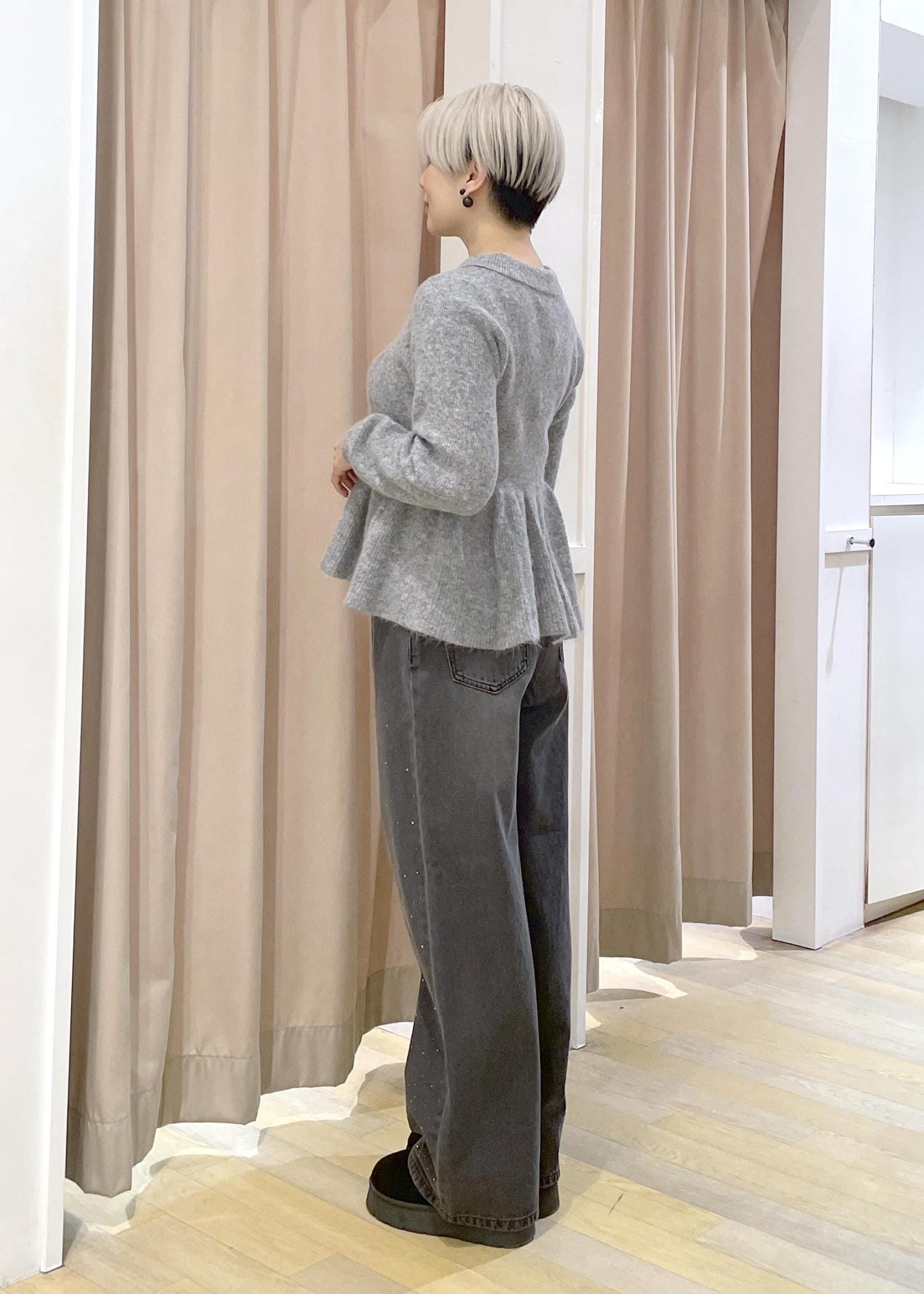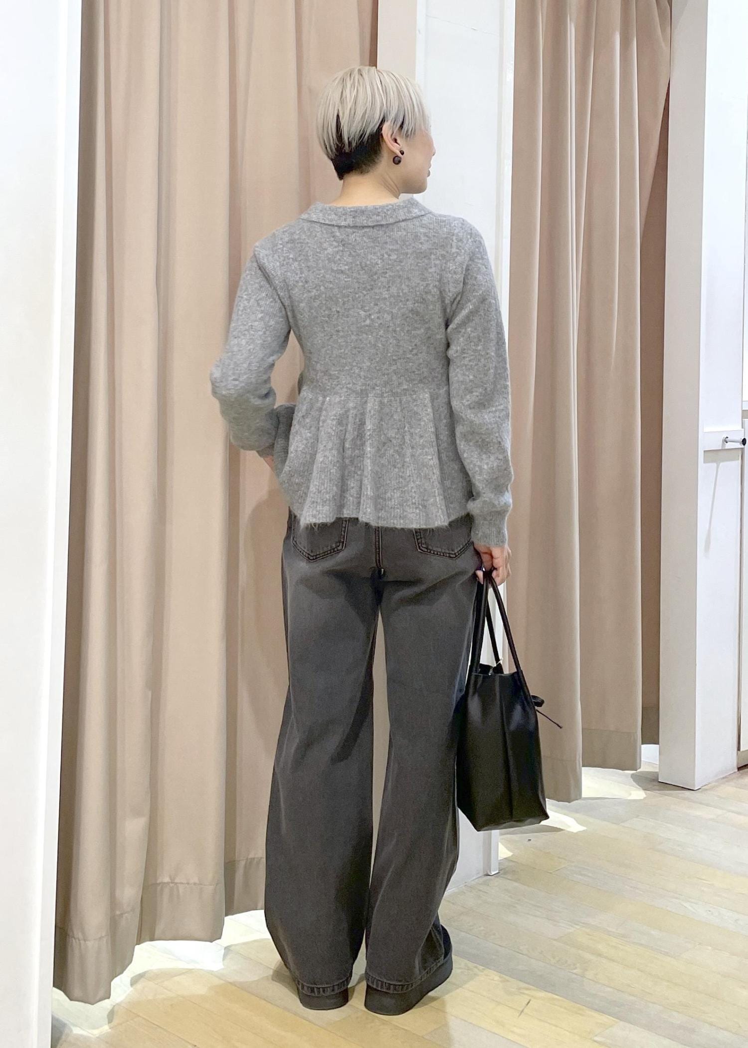 フェミニンな印象のアンゴラ混合の柔らかくて暖かいペプラムニットをブラックのワイドデニムでカジュアルダウン!