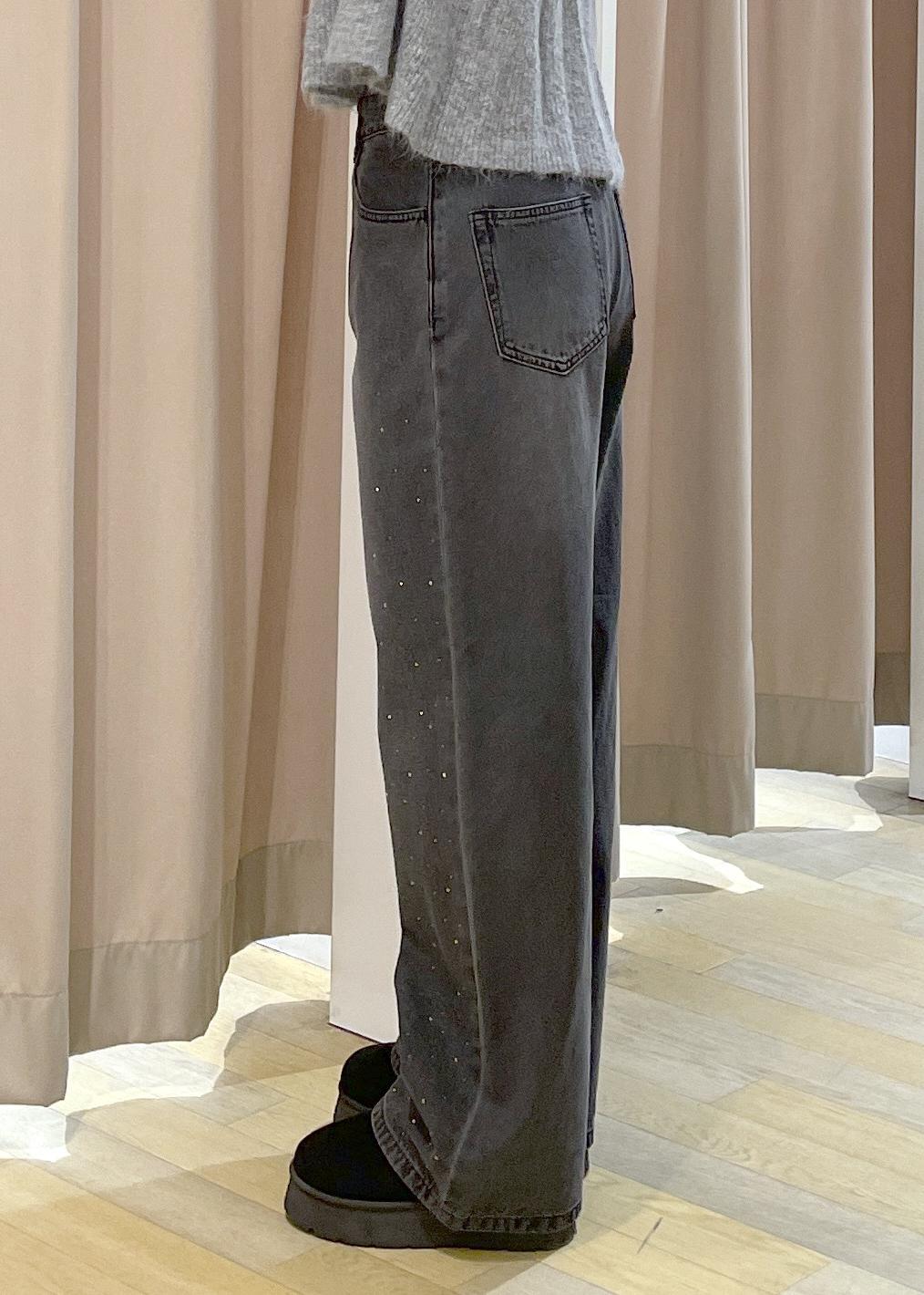 柔らかいデニム素材で、やや細めのワイドシルエットです。