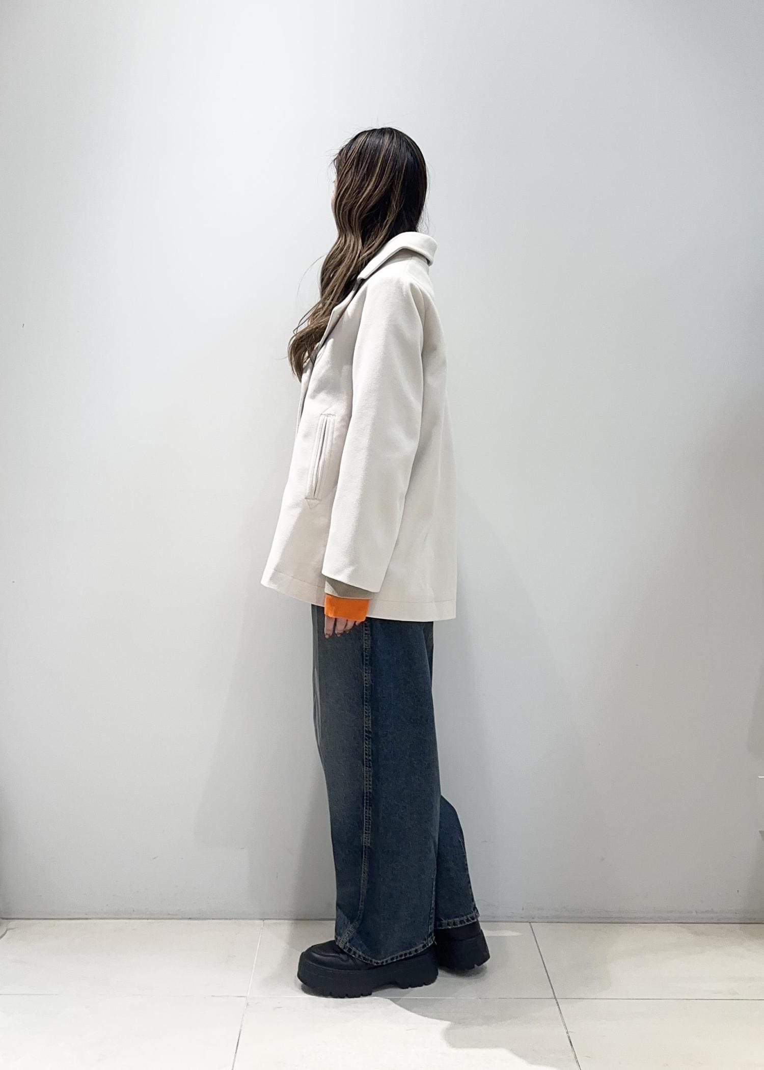 厚手のトップスの上からもストレスなく羽織れる一着です。