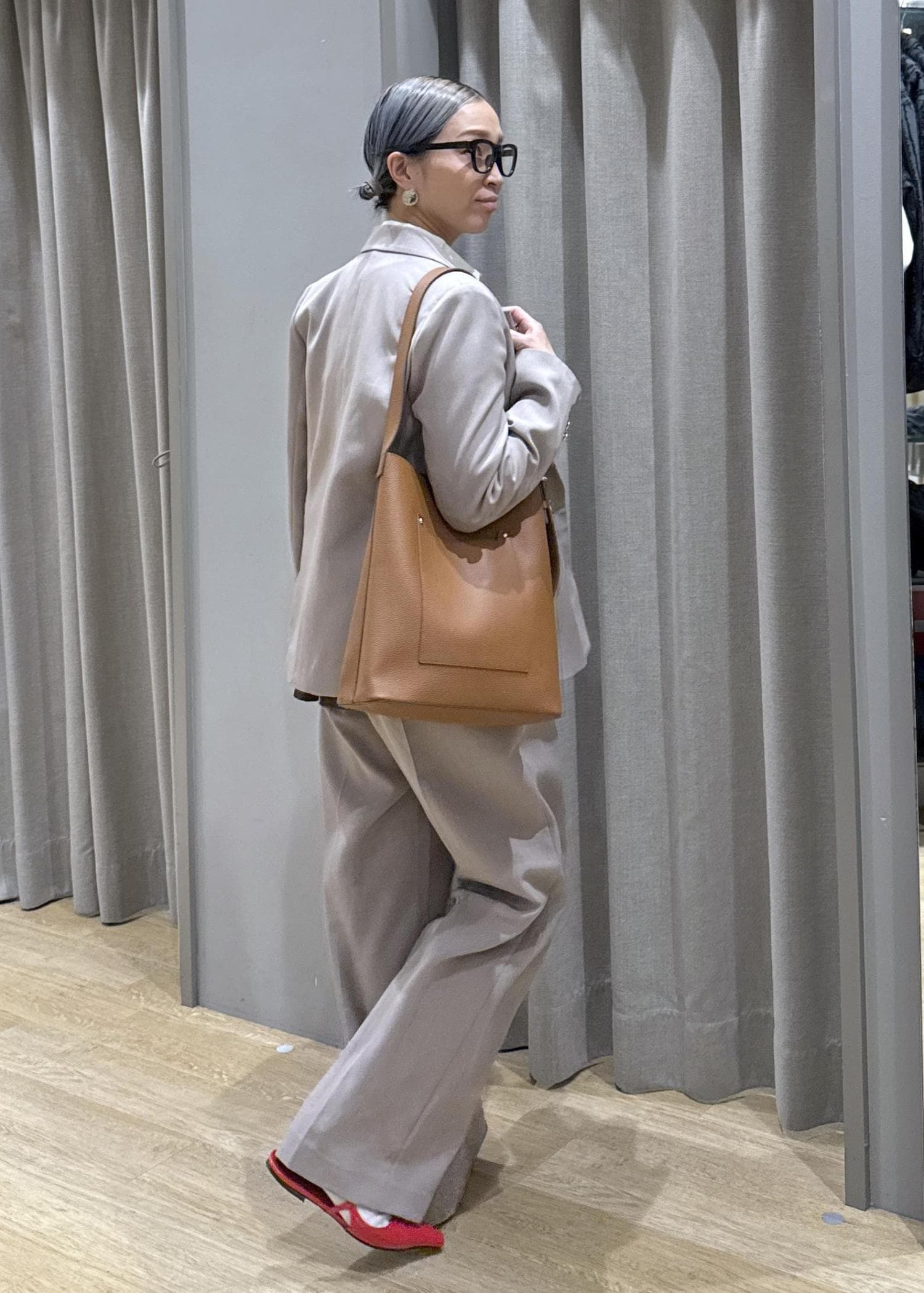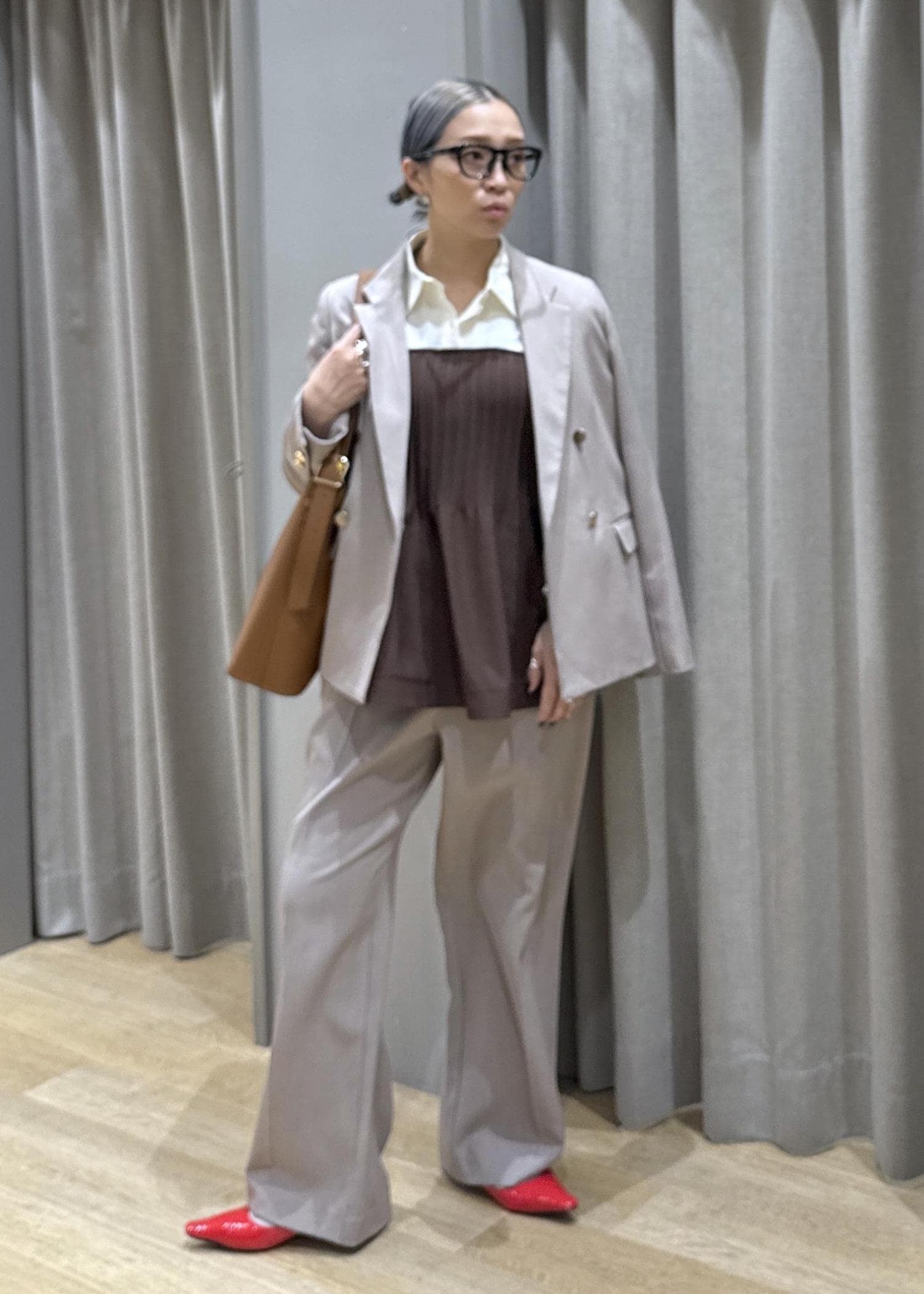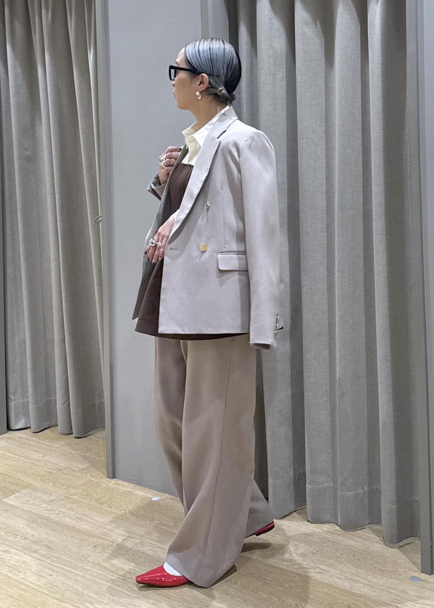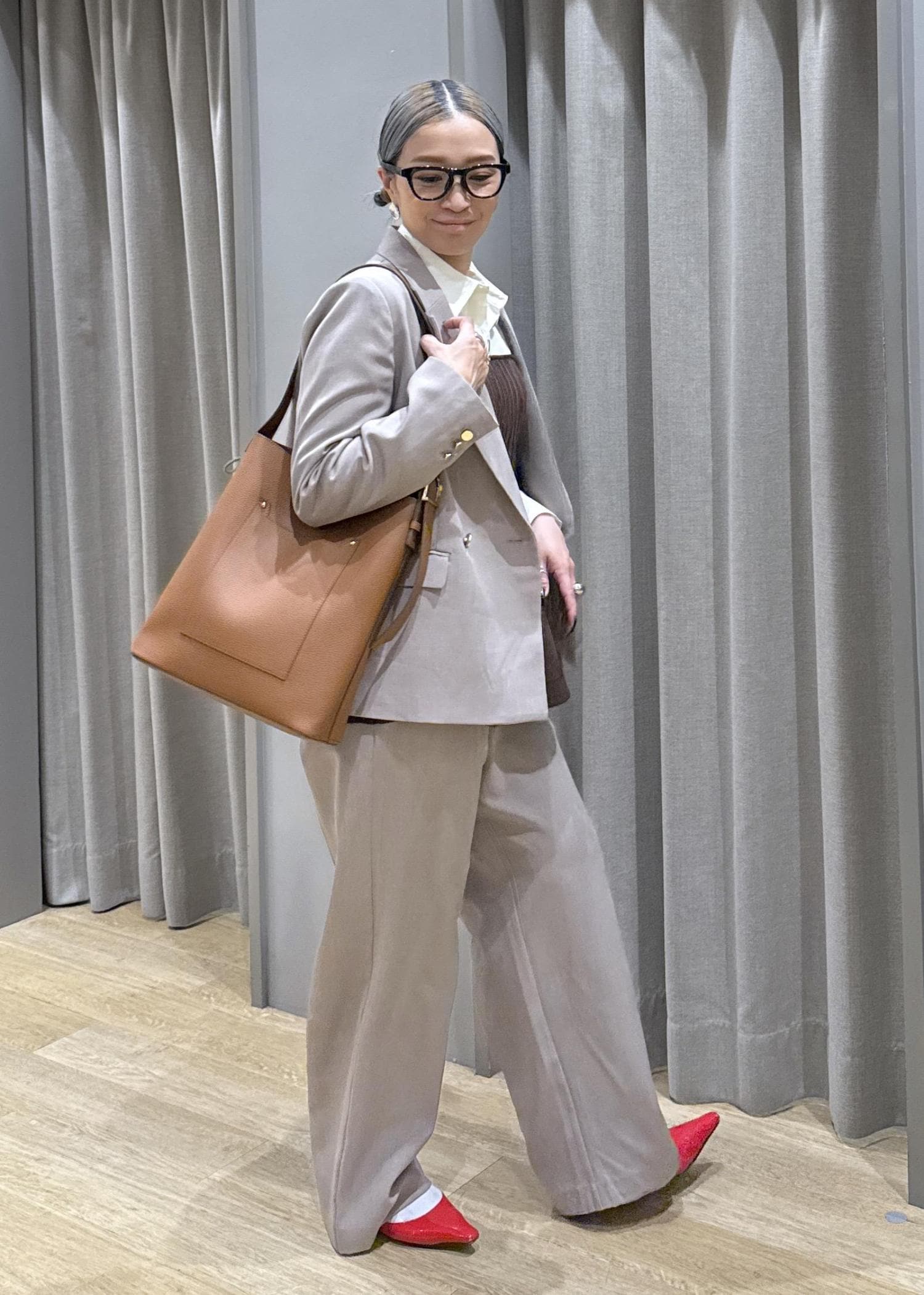 セットアップのベージュで、色な統一感を出すことで