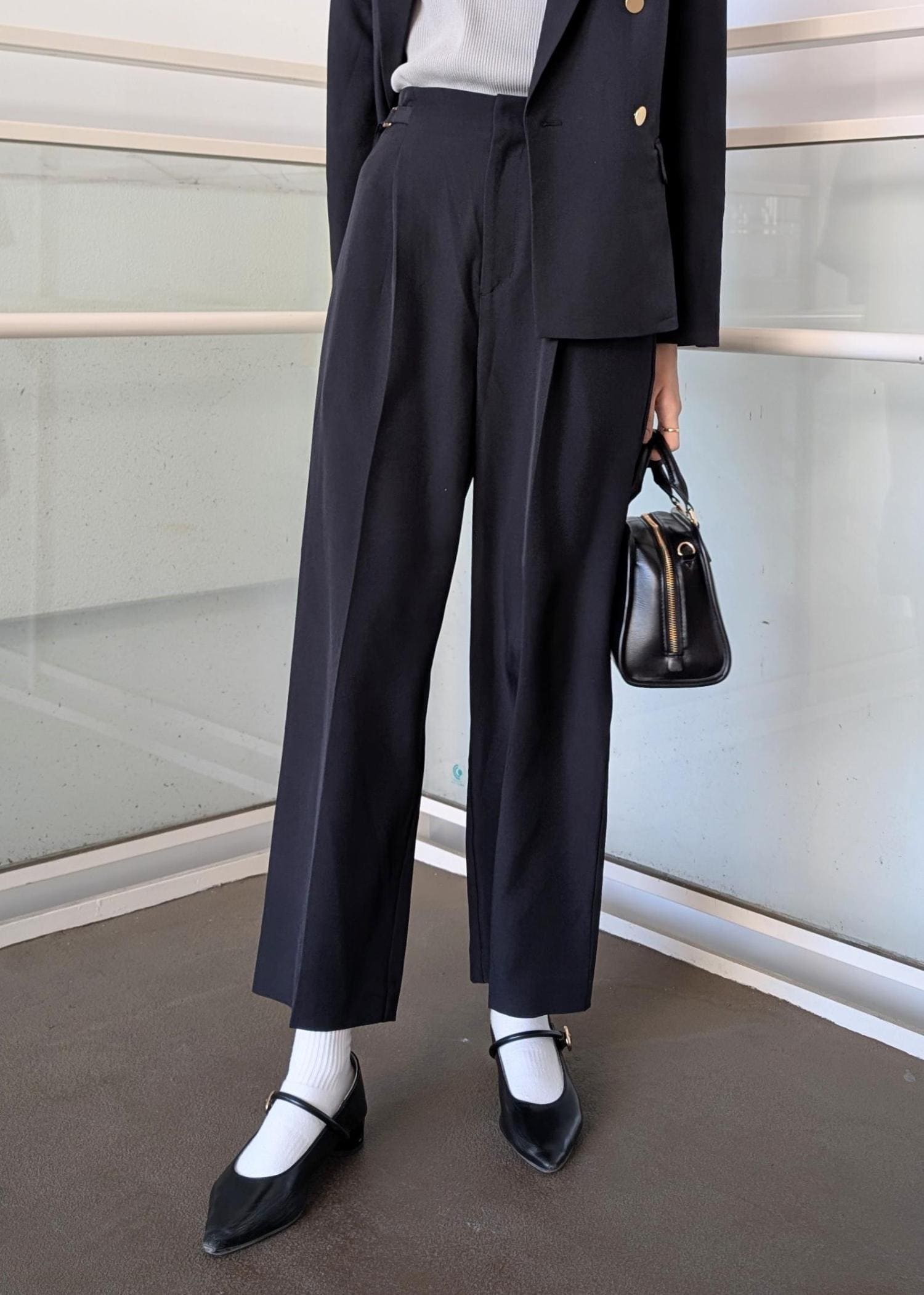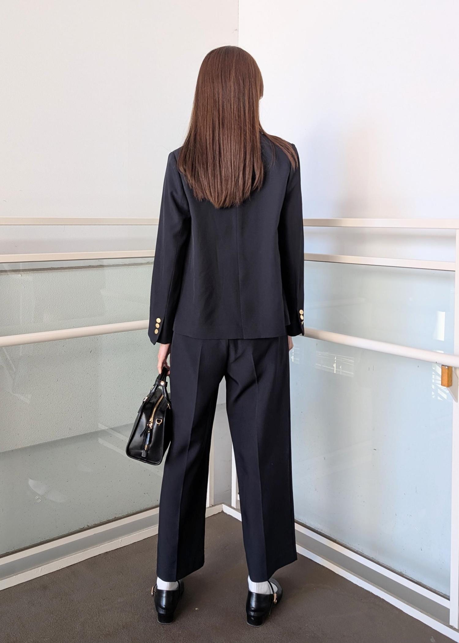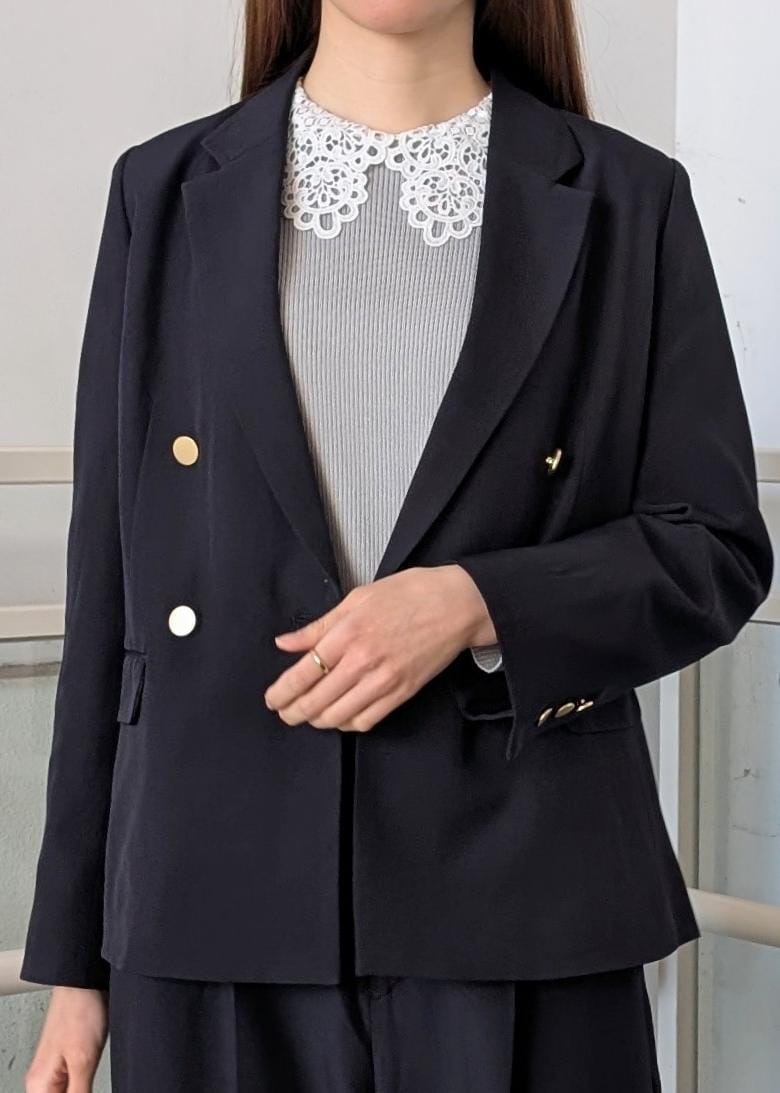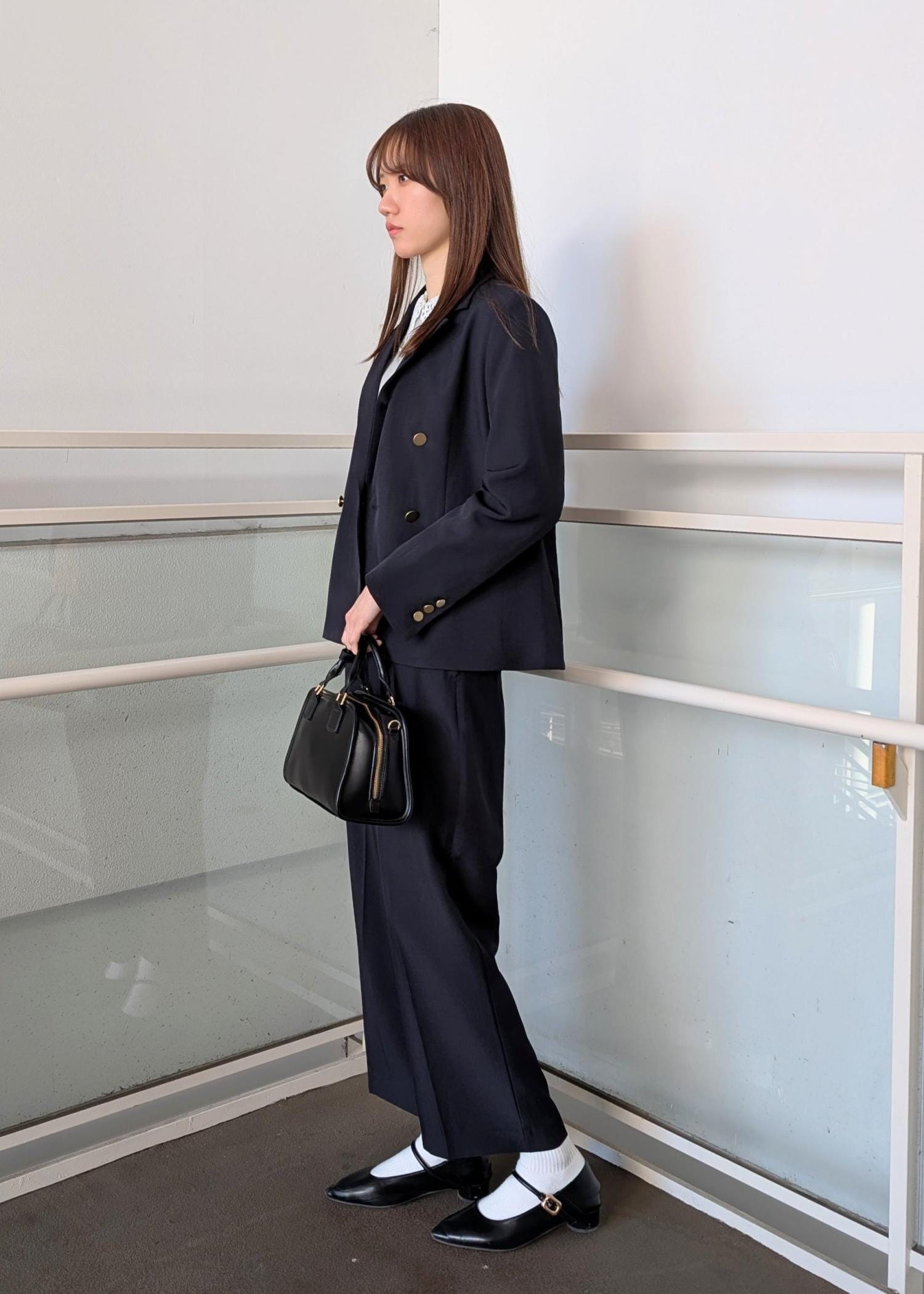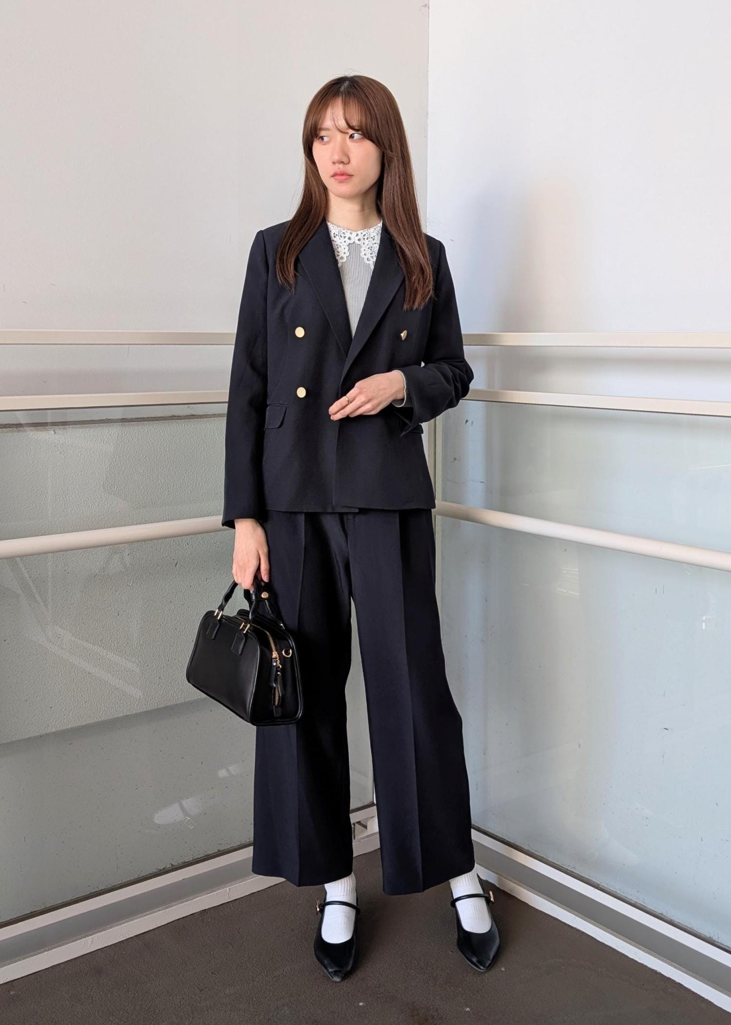 クールな印象になりがちなネイビーセットアップにフェミニンなインナーを合わせてみました。普段は柔らかい色味のセットアップを