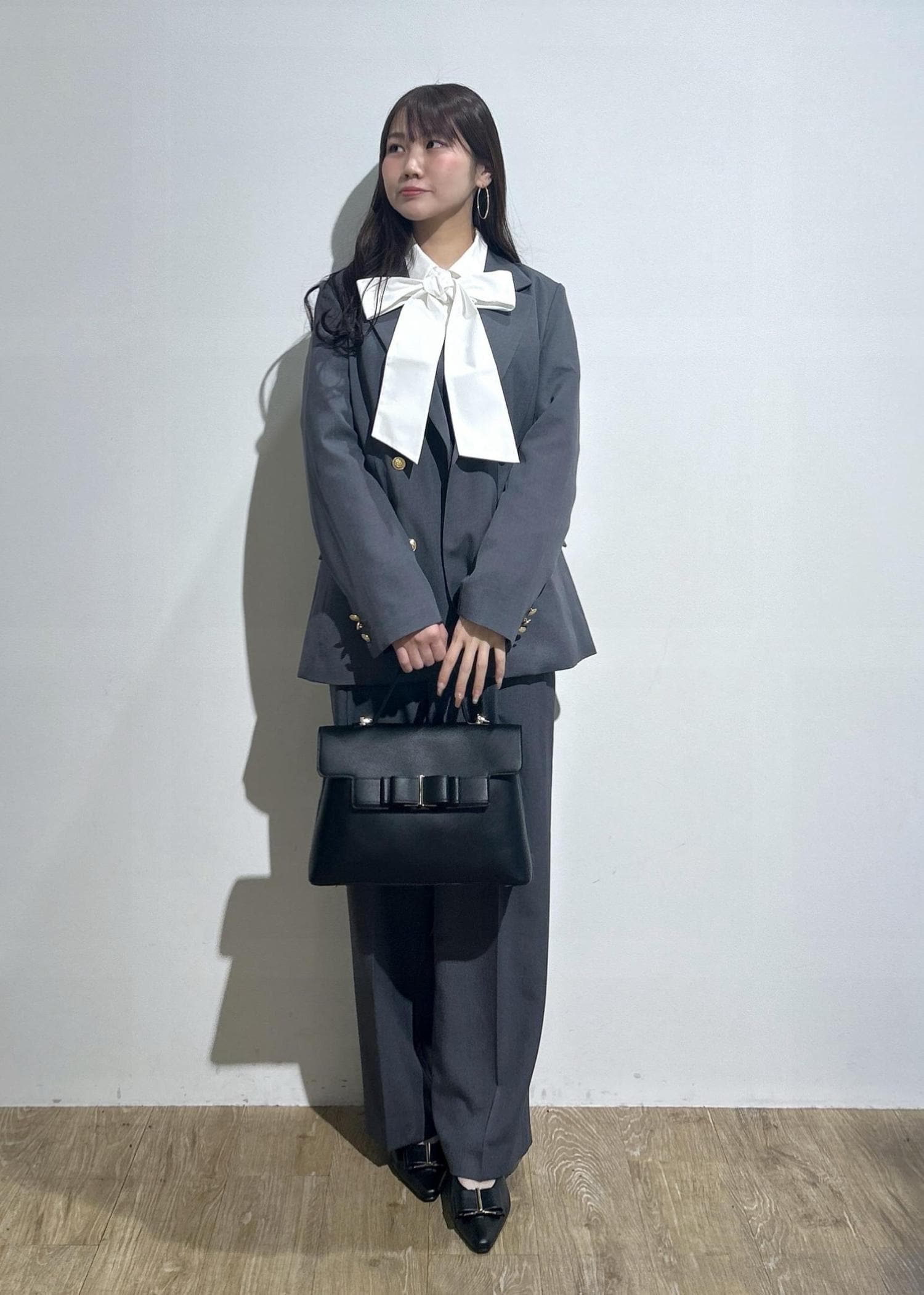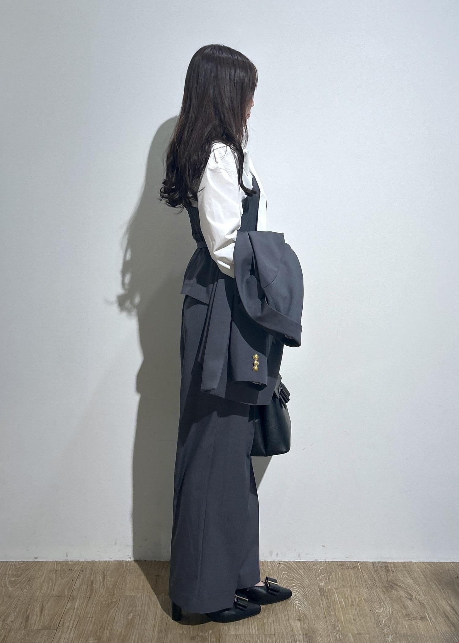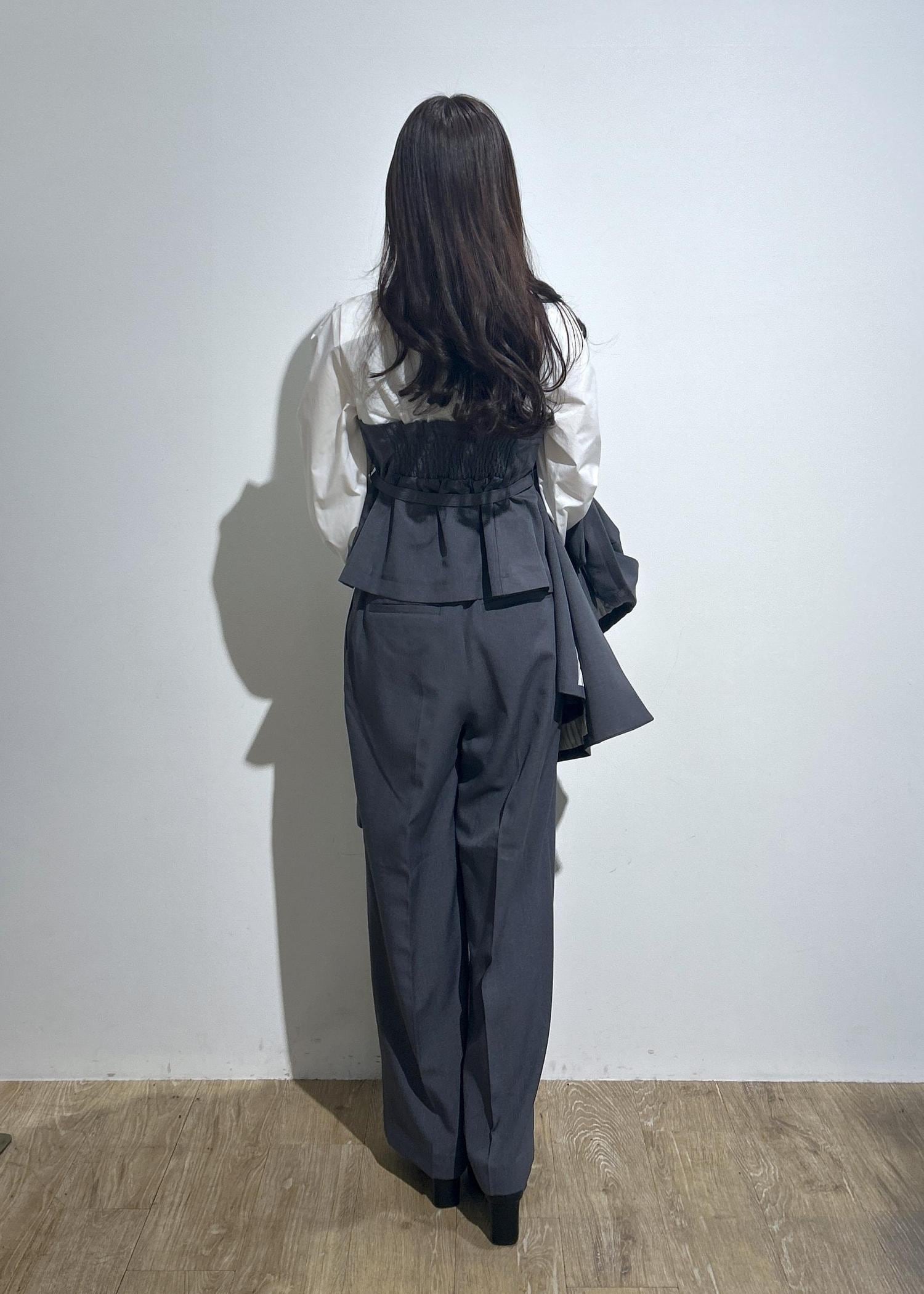美easyの新作!ジャケットとビスチェシャツとパンツの3点セットアップコーデです!セレモニーシーンにもオフィスにも、単品使いだと普段着にも使える万能アイテムです◎