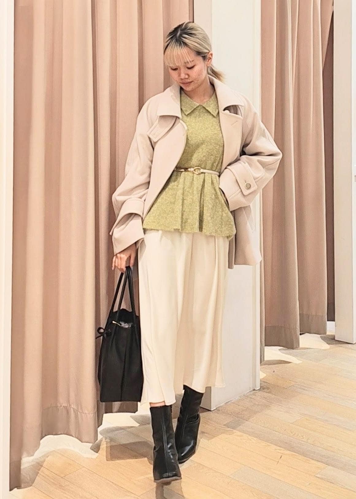 ROPÉ PICNICジャージーメルトンシリーズ 金ボタンミドル丈コート/リンクコーデベージュ / F¥7,692レビュー裾に向かって広がるデザインなのでシルエットがとっても綺麗です!!スタンドカラーにする時、襟先を折り返すと首の詰まってる感が軽減されます☺︎