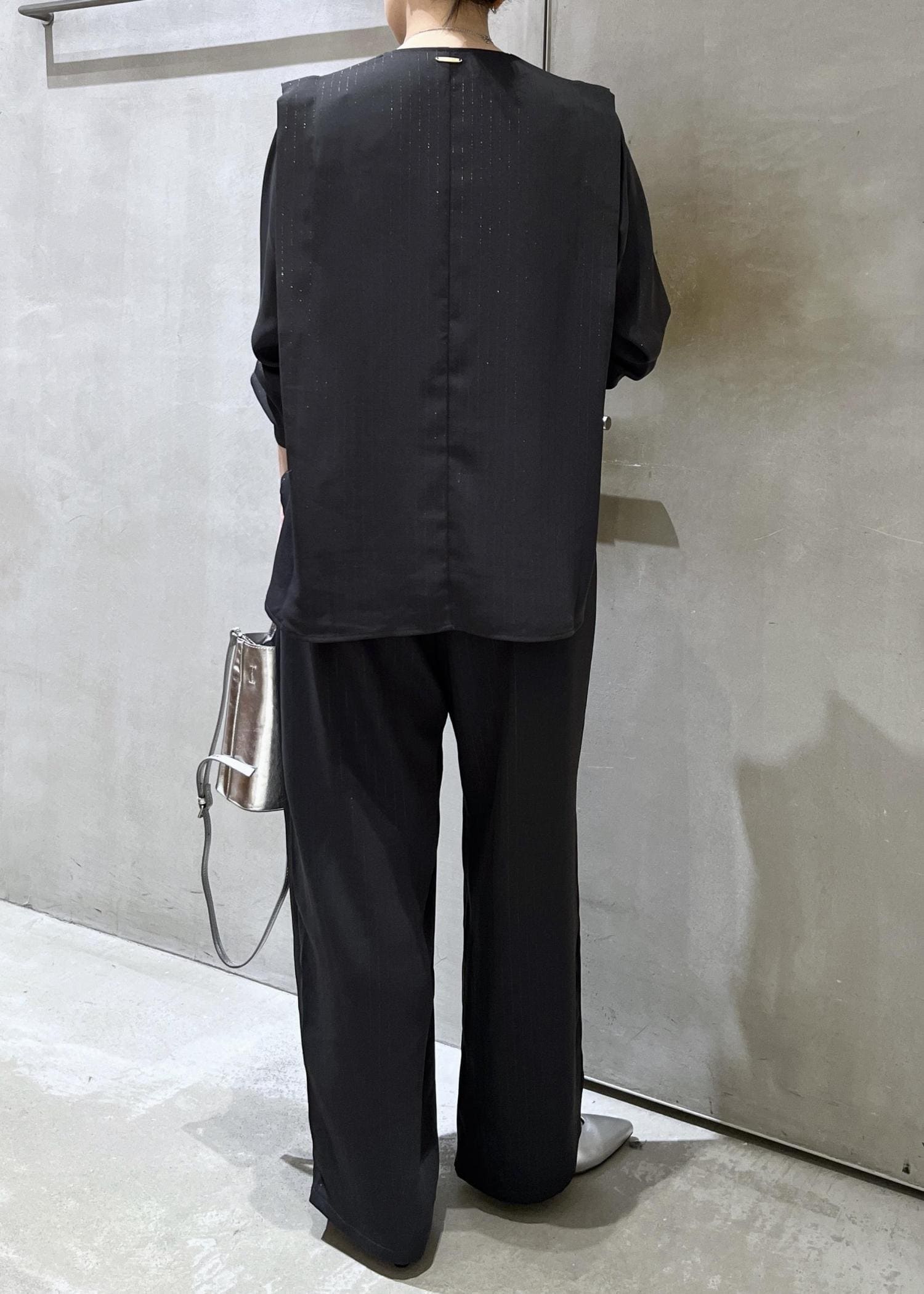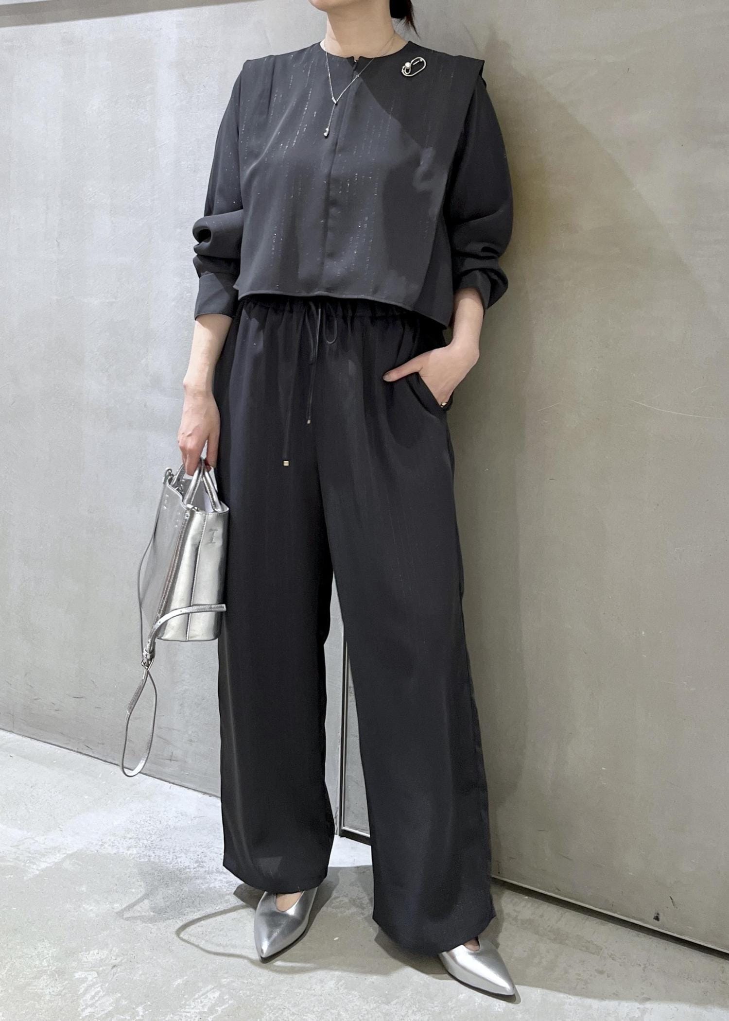 店頭でも根強い人気のラメストライプ2WAYヘムタックブラウスとおそろいのパンツで、セットアップコーデです。