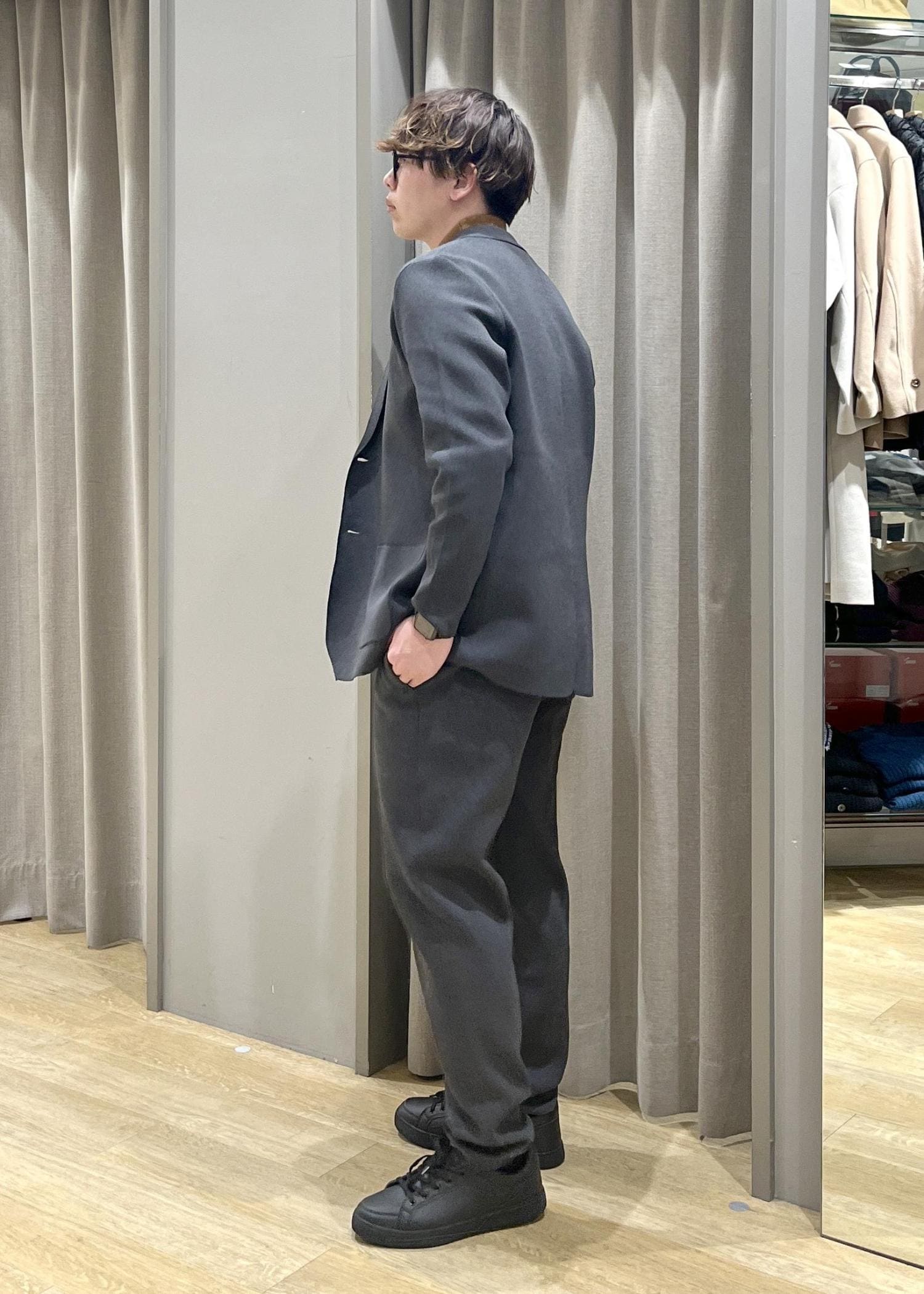 パンツをデニムに変えてカジュアルな着こなしも可能です。
