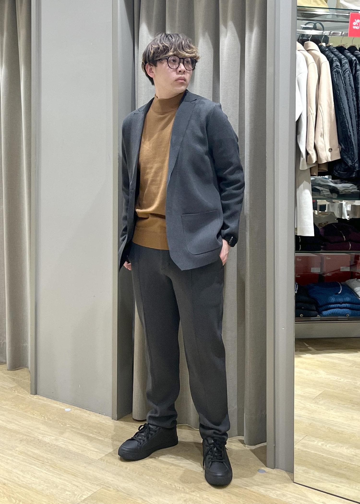 ミラノリブGOODフィットジャケットとセットアップでも使用可能。 -