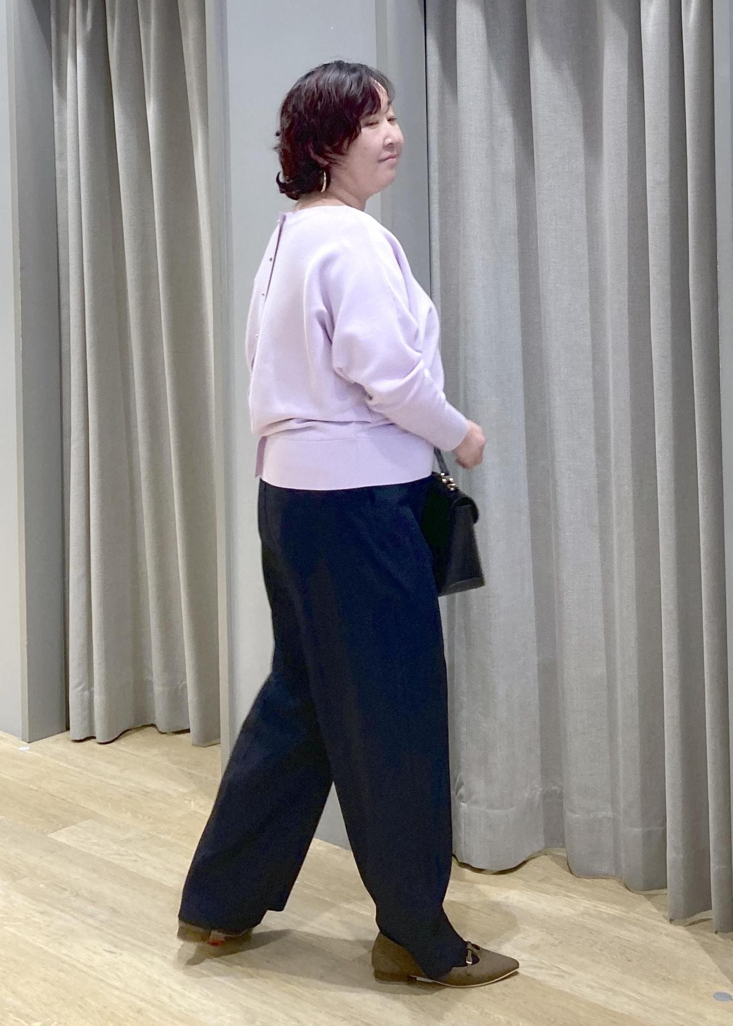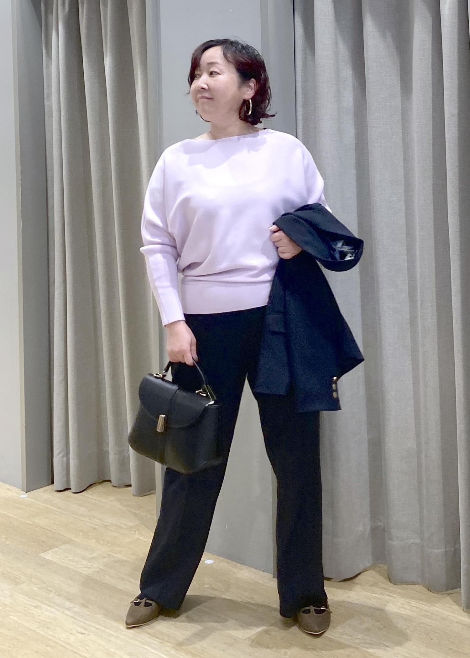二の腕のラインを拾わないドルマン風ニットは、ママの強い味方。ボトムスと小物を落ち着いたカラーで統一すれば、膨張しがちな淡い色もグッと引き締まって見えます!オフィスでも浮かない、上品カジュアルな完成です。