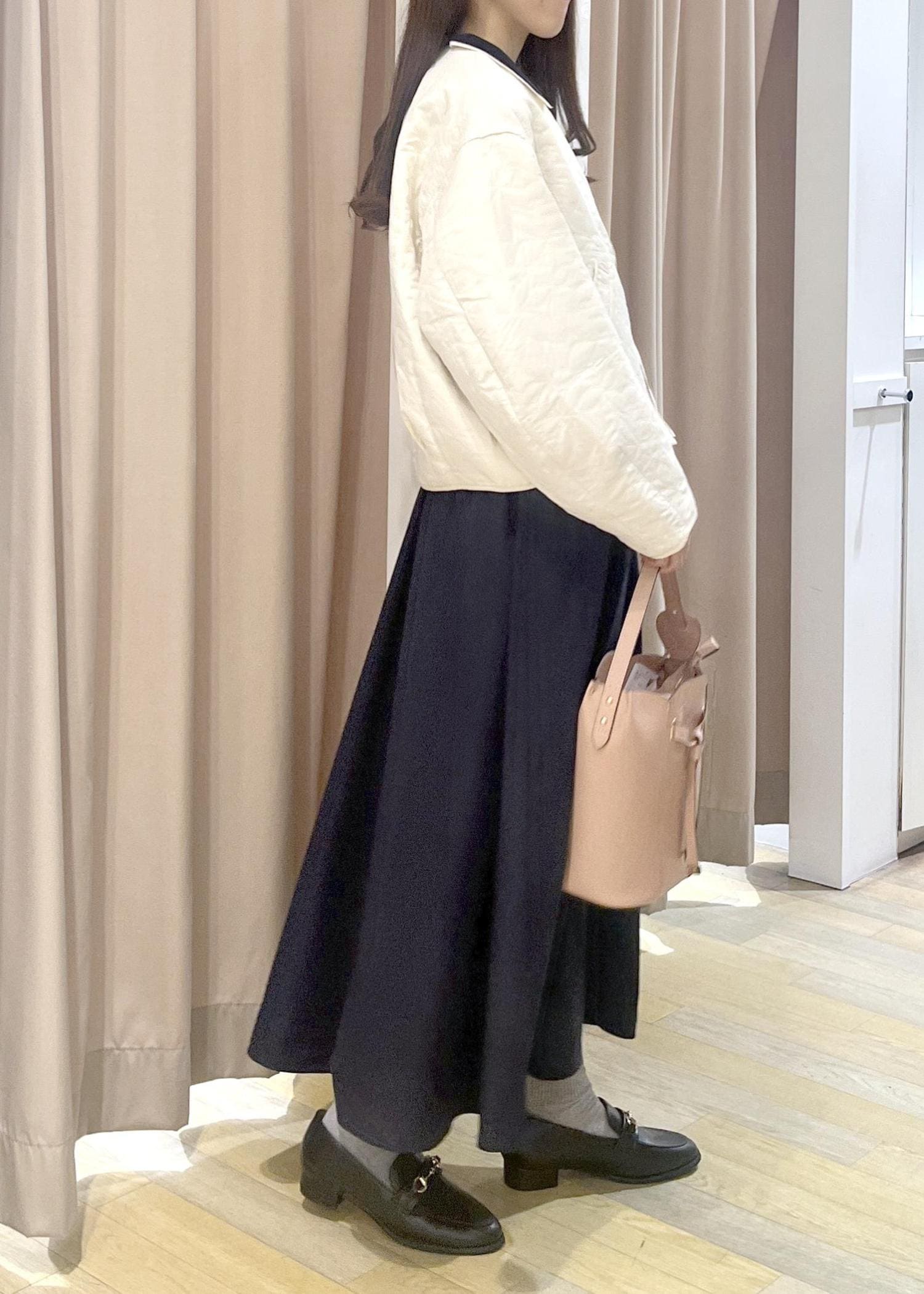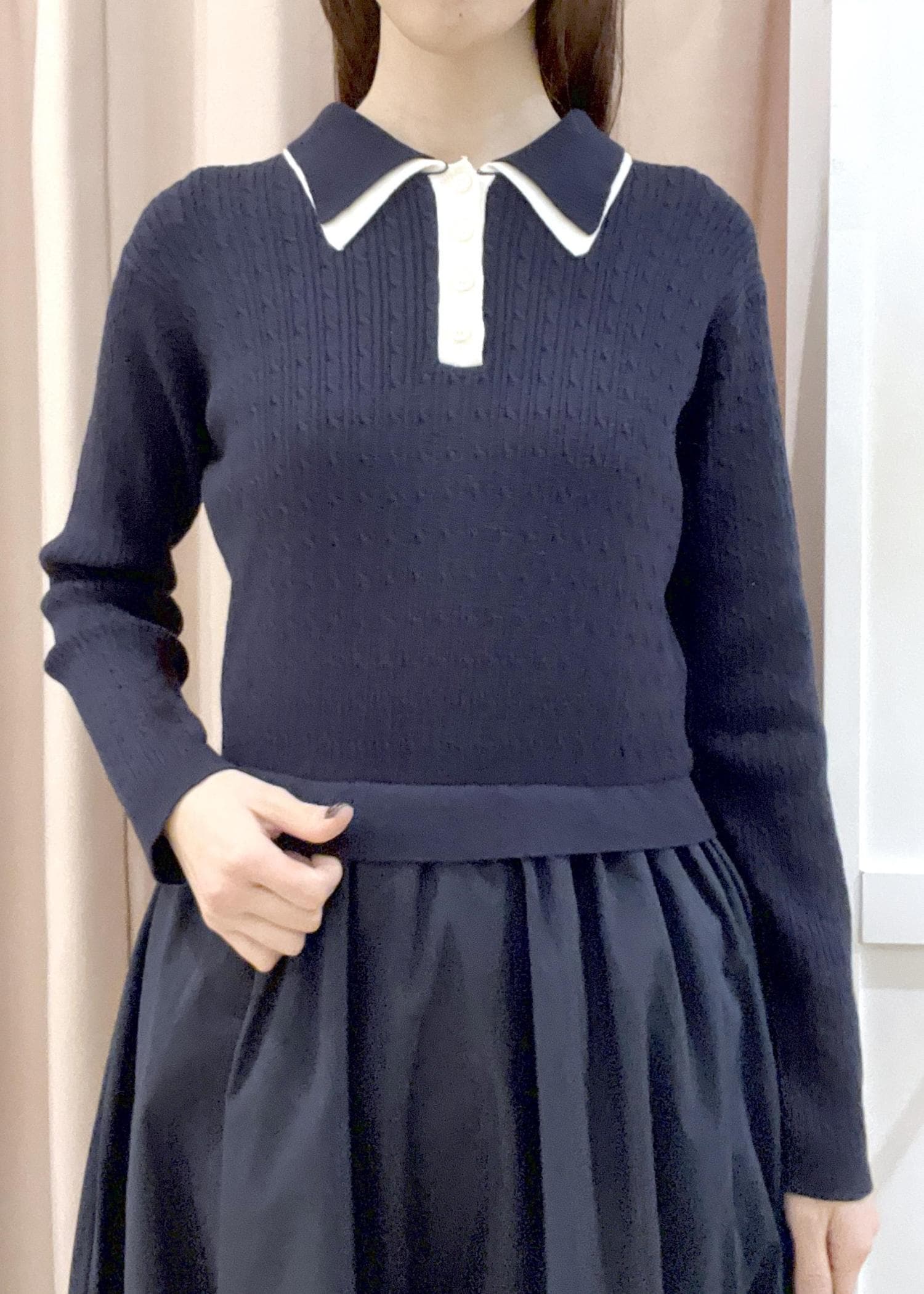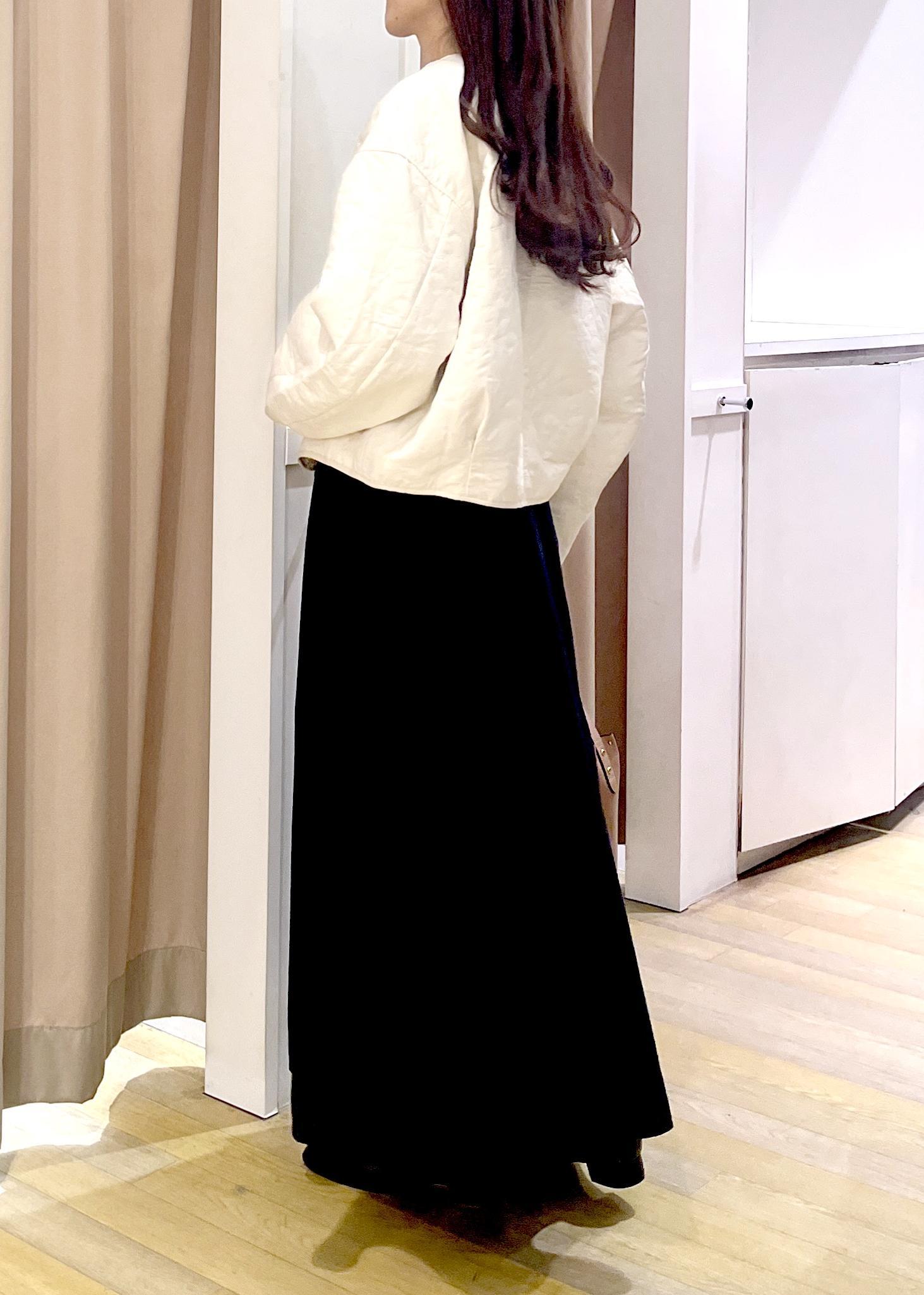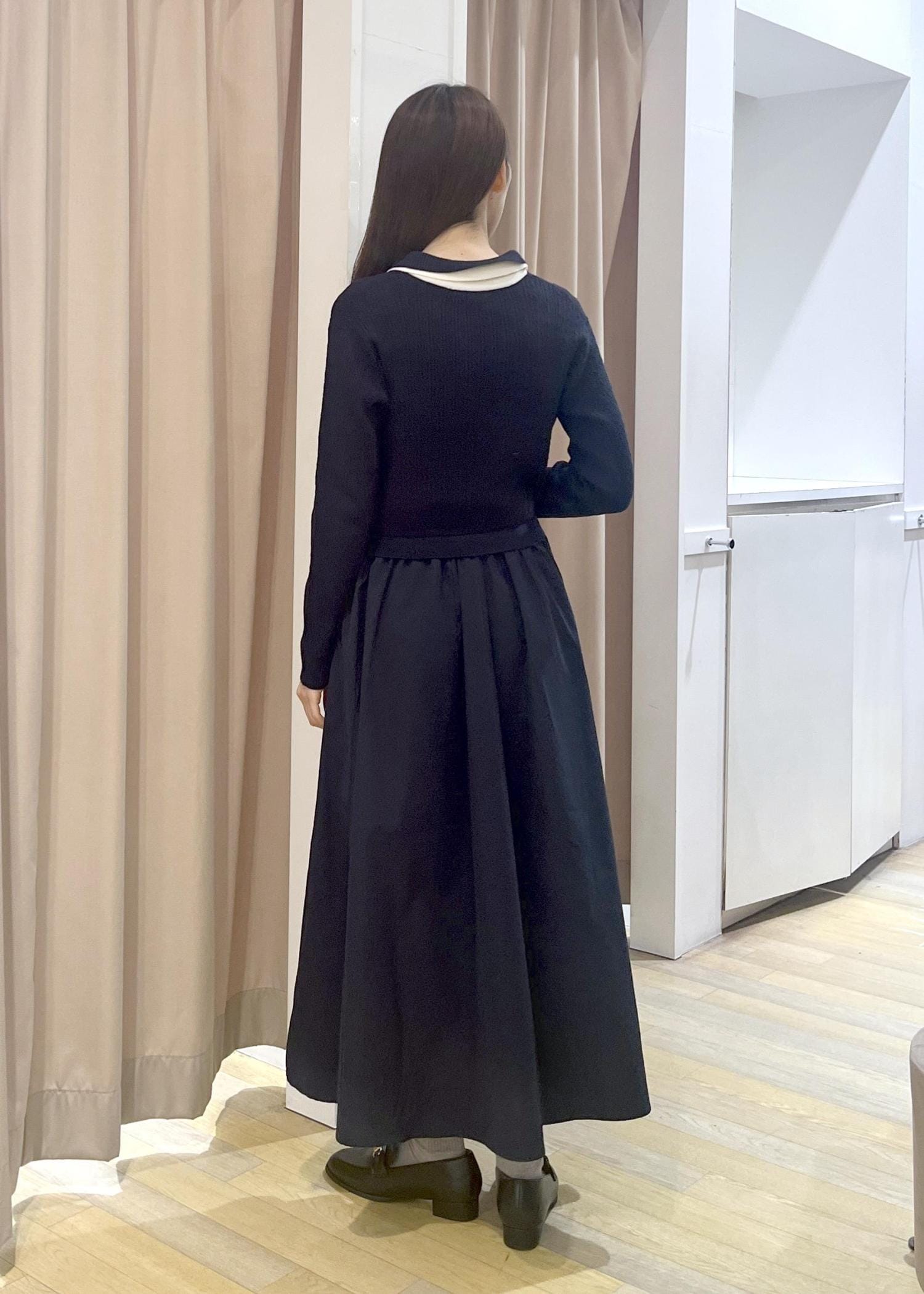 ニットはハイゲージニットでフィット感があります。スカートは丈長めでハリのある素材です。 -