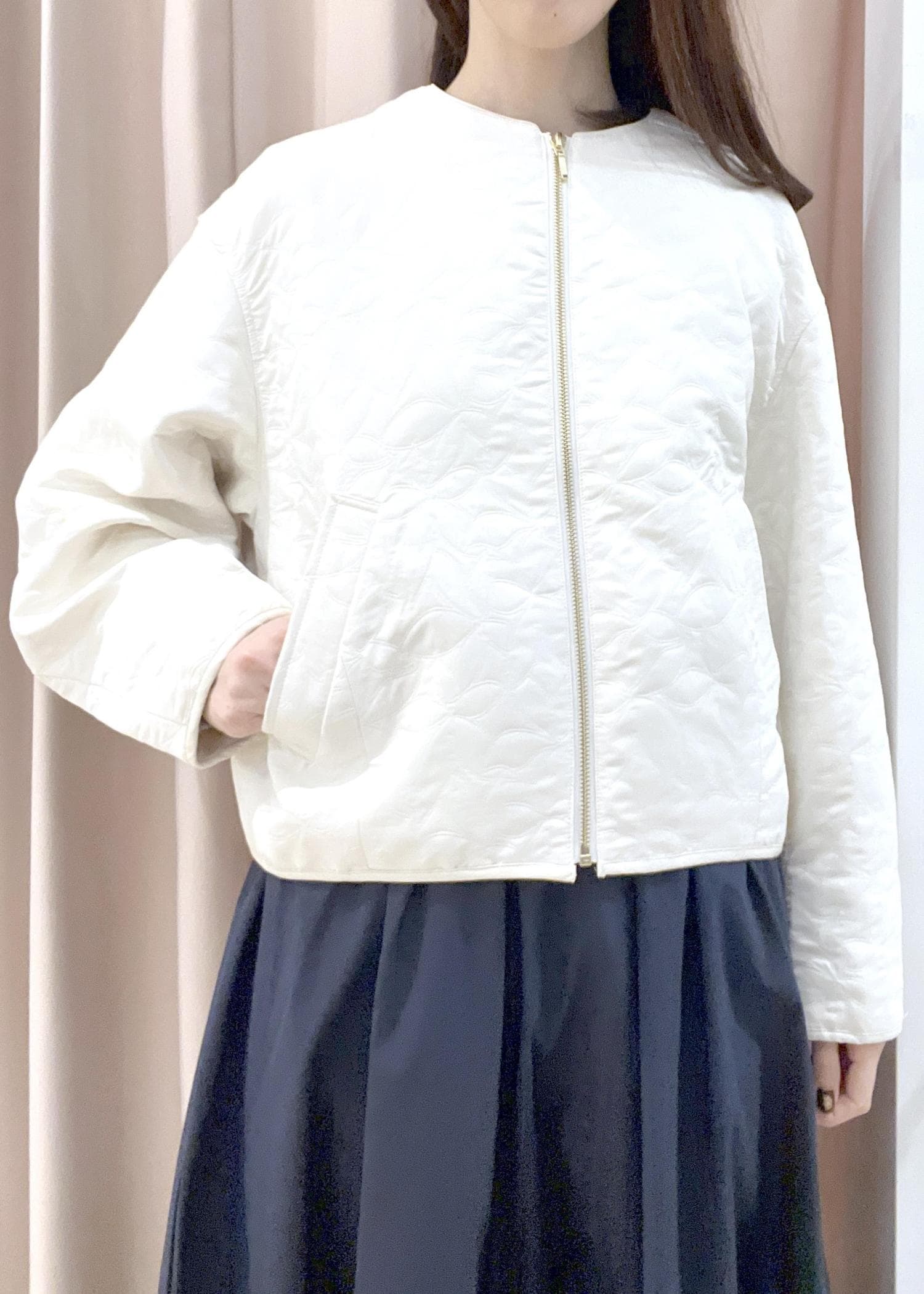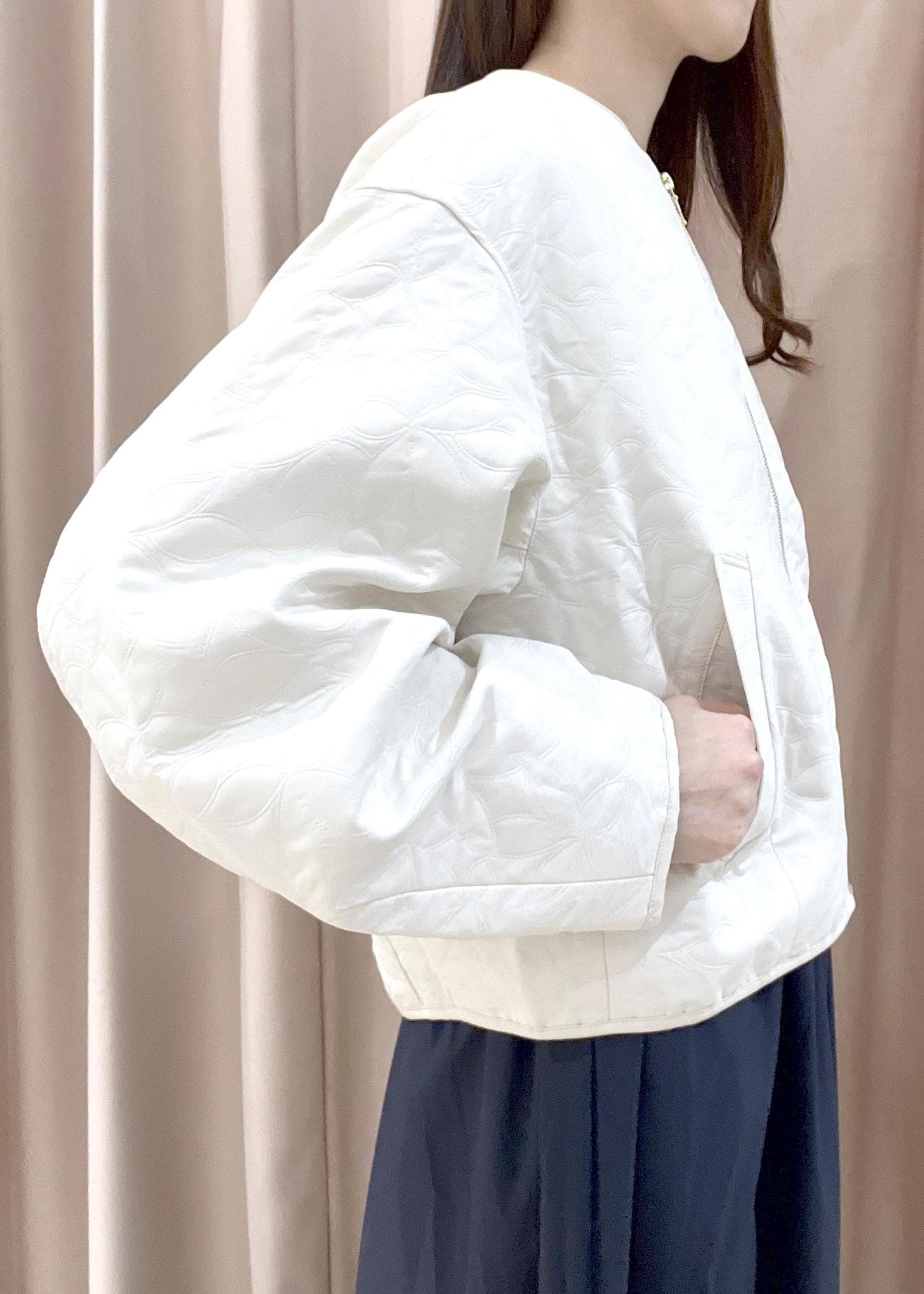 VIS合皮パイピングキルトアソートブルゾンオフホワイト / F¥7,119レビュー着用はリーフ柄が春らしいです。