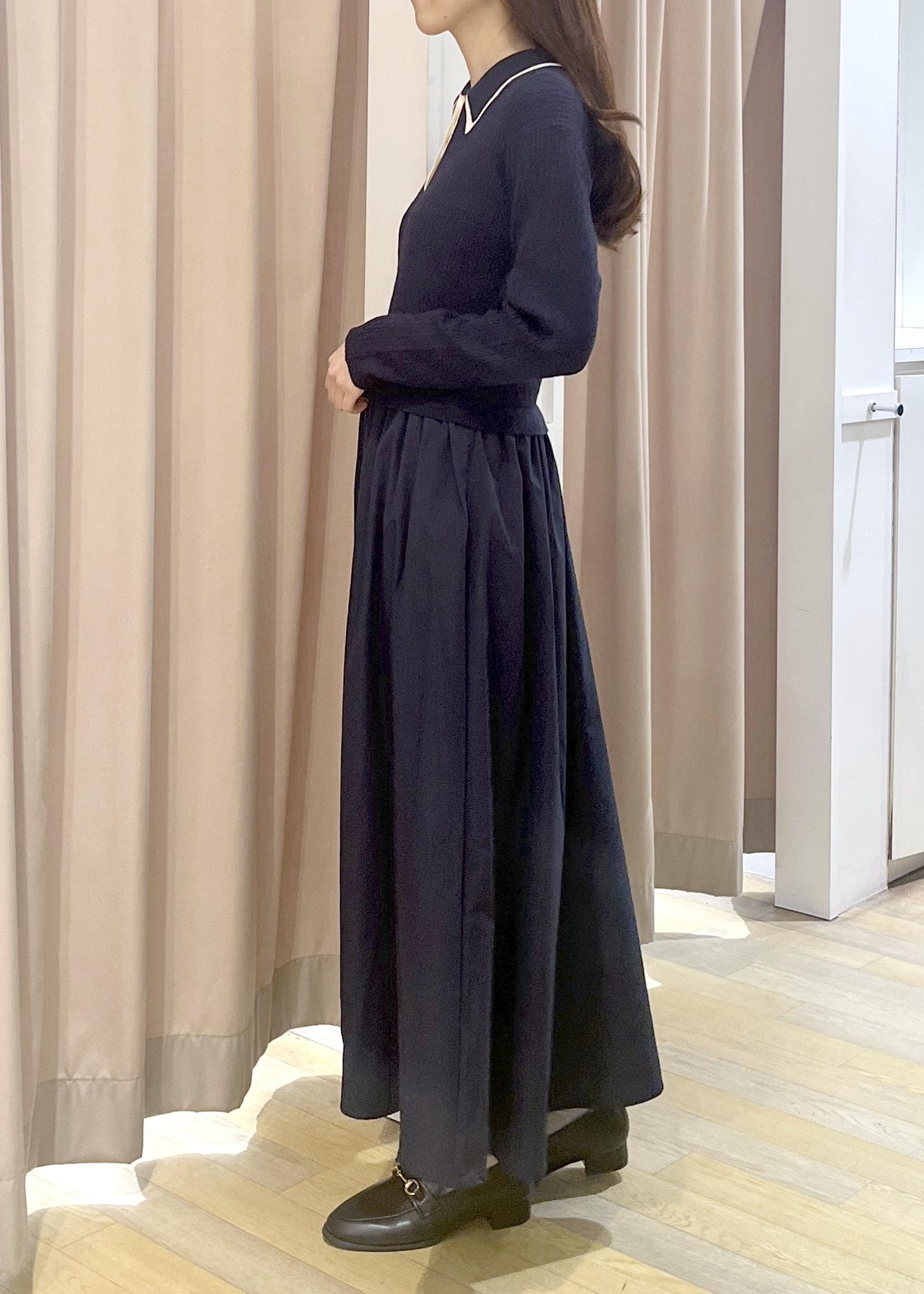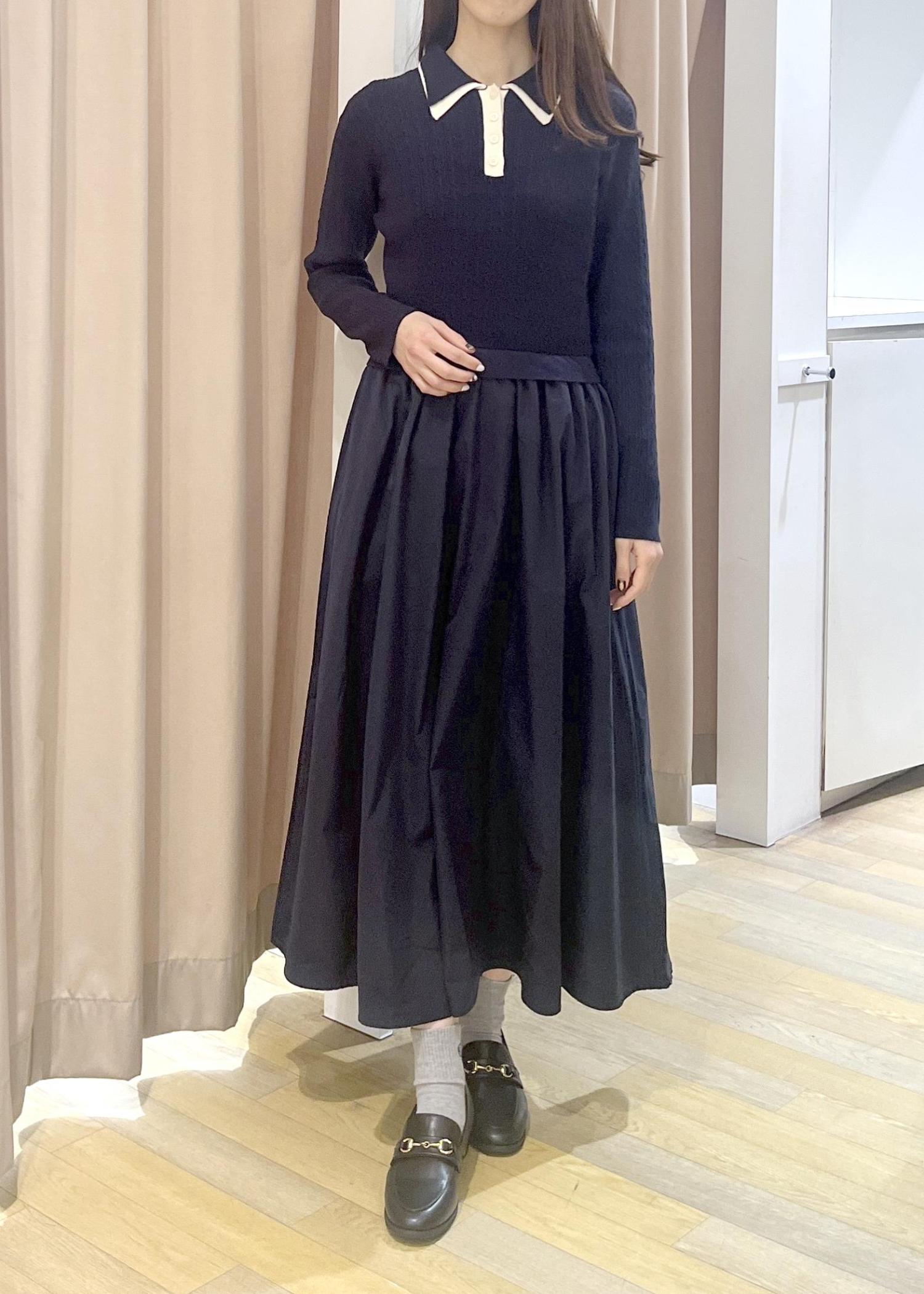 トレンドのW襟デザインニットとスフレスカートがドッキングしています。