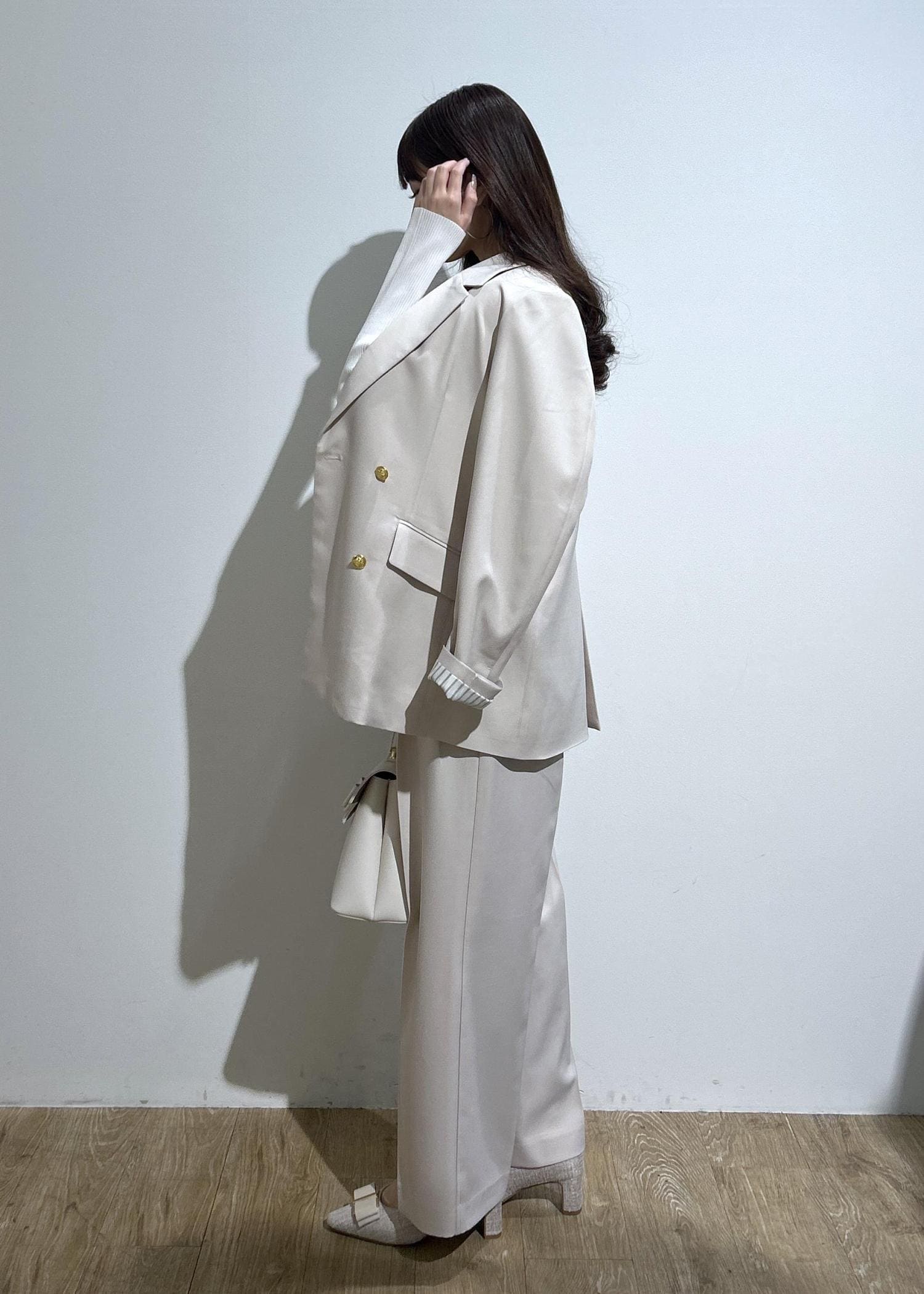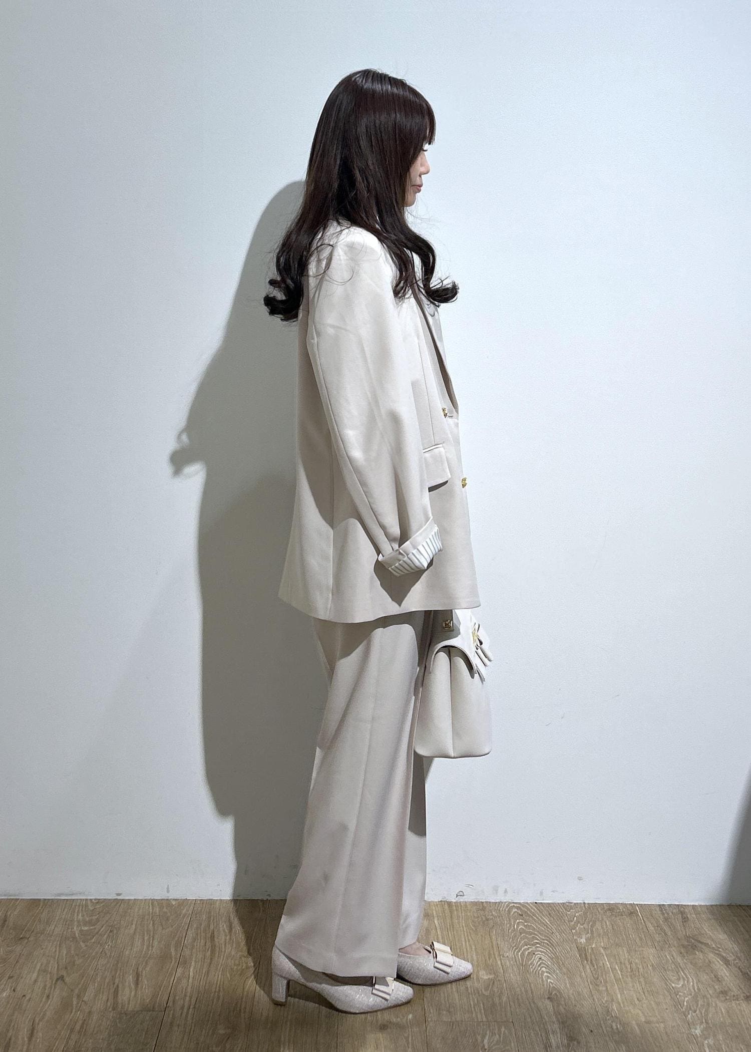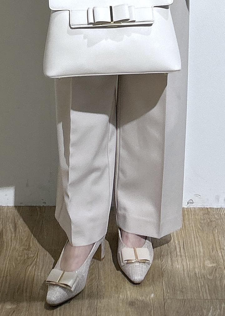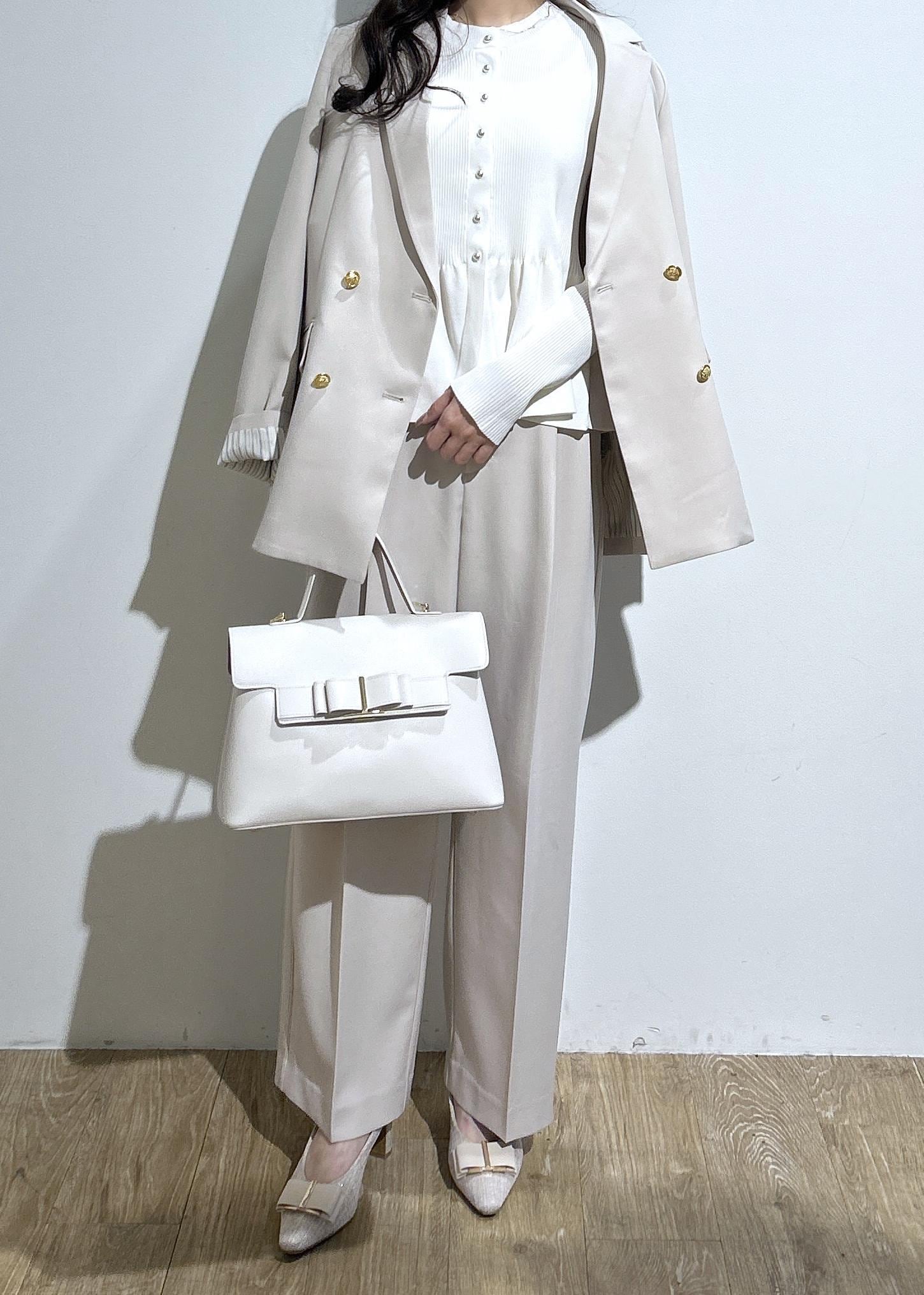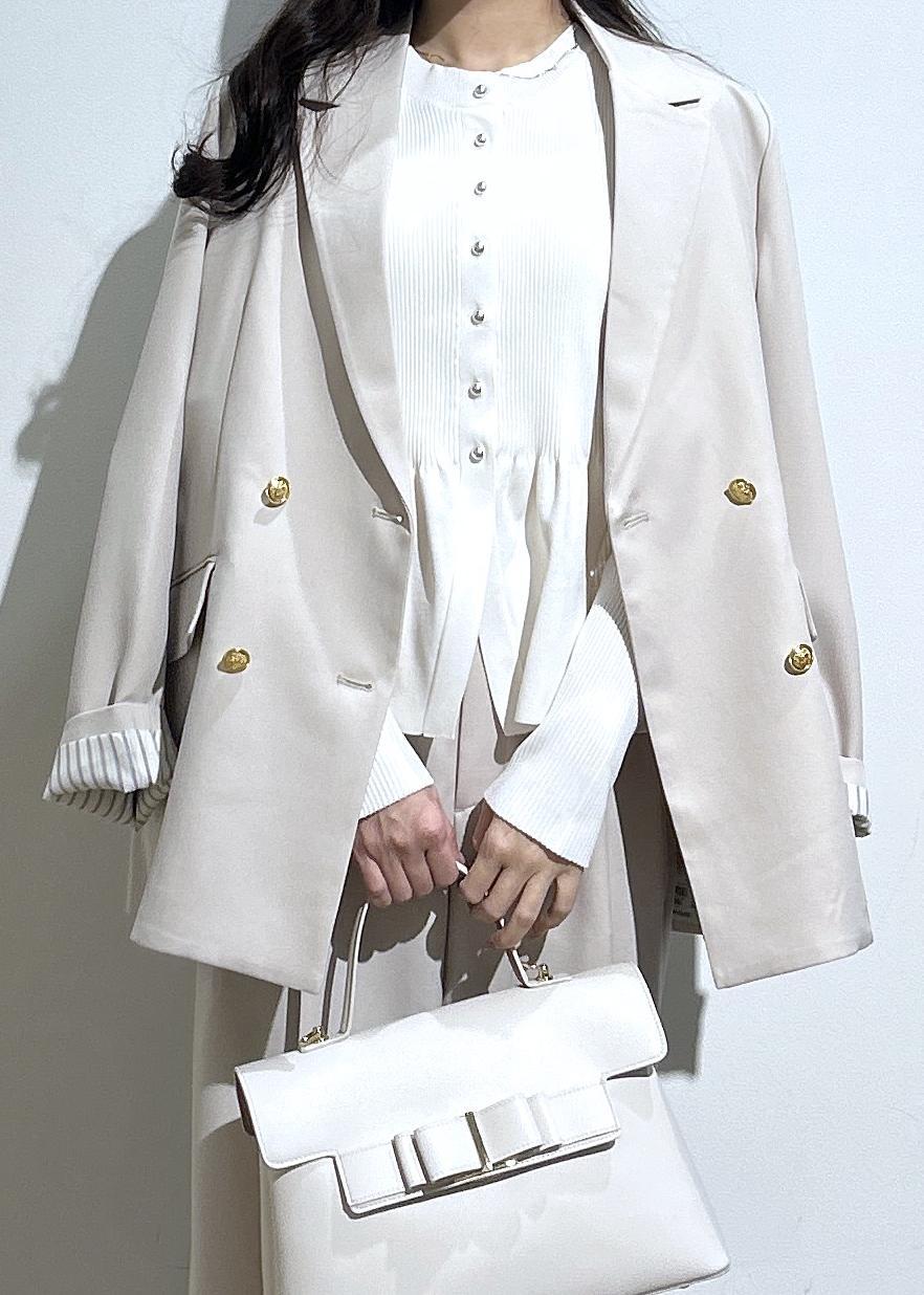 全身ホワイト×ベージュでまとめたワントーンキレイめコーデです。セレモニーシーンからオフィスシーンまで幅広く着用できます。単品だと普段使いにも着回せます◎