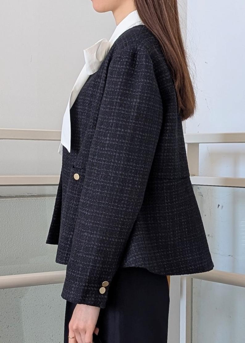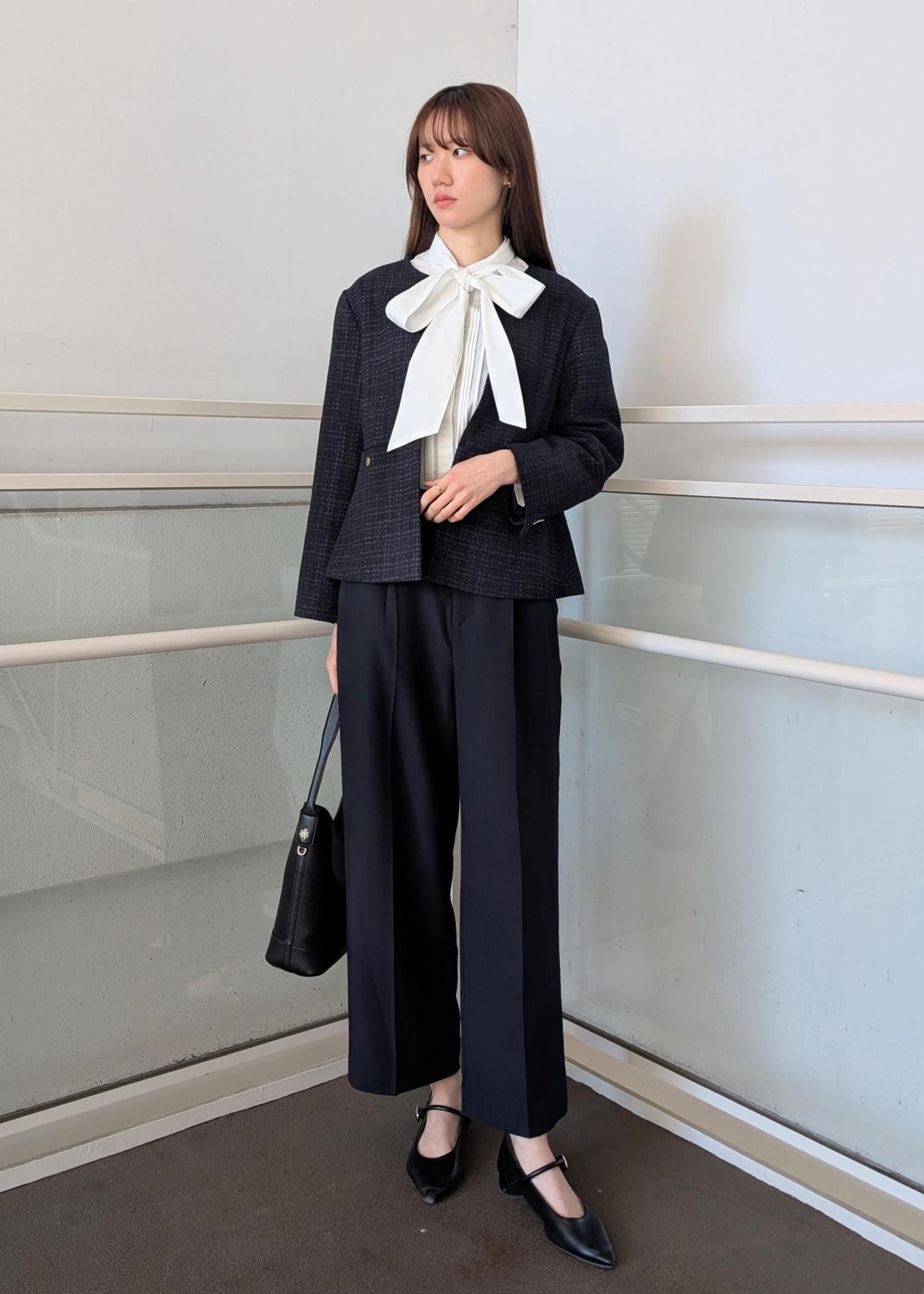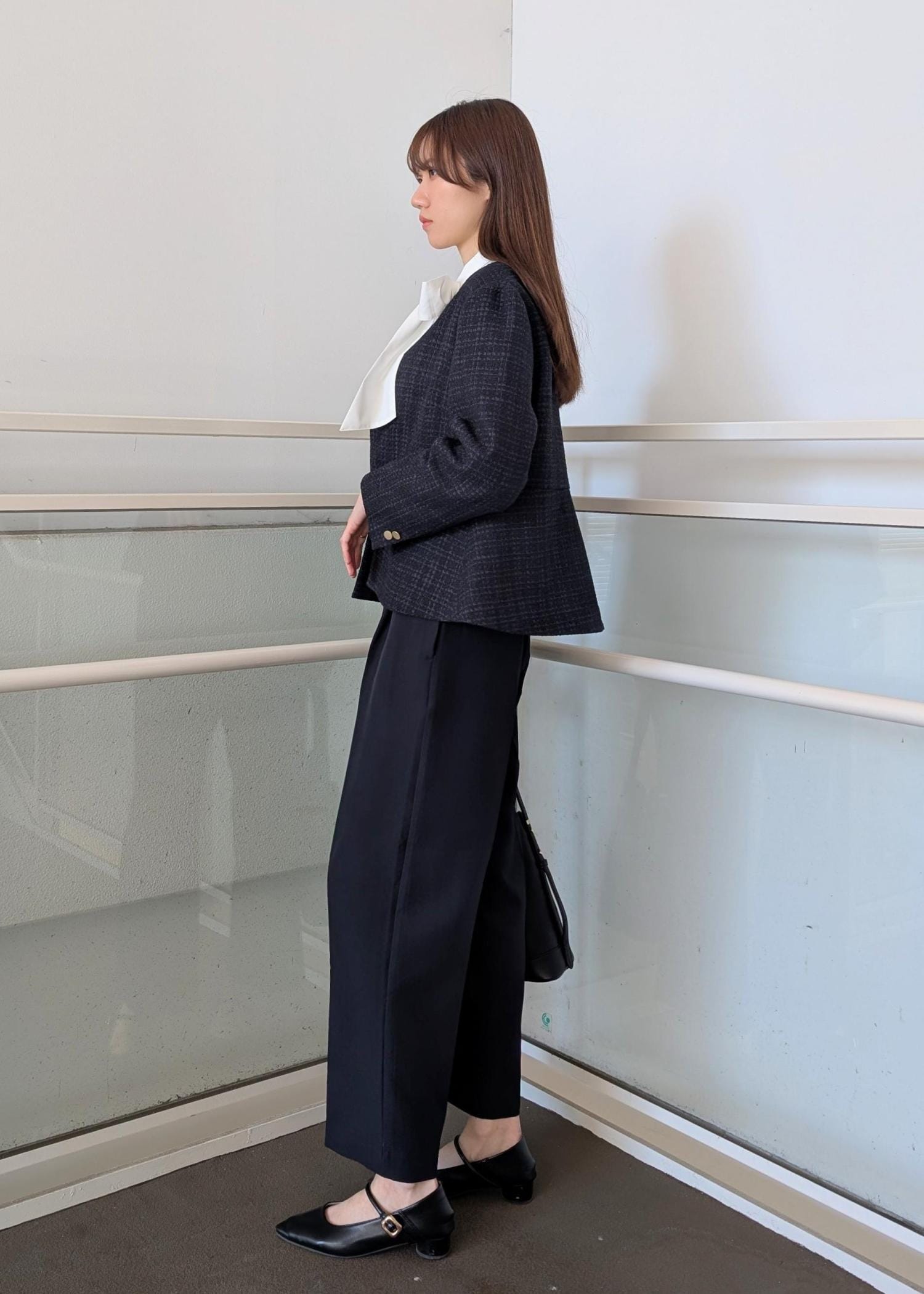 卒園式・卒業式に向けて、ネイビーのツイードジャケットに同じトーンのネイビーパンツを合わせてセットアップ風にしました。ノーカラージャケットなのでボウタイブラウスとの相性抜群です。インナーをホワイトにすれば入園式・入学式にも着まわせるジャケットですよ。