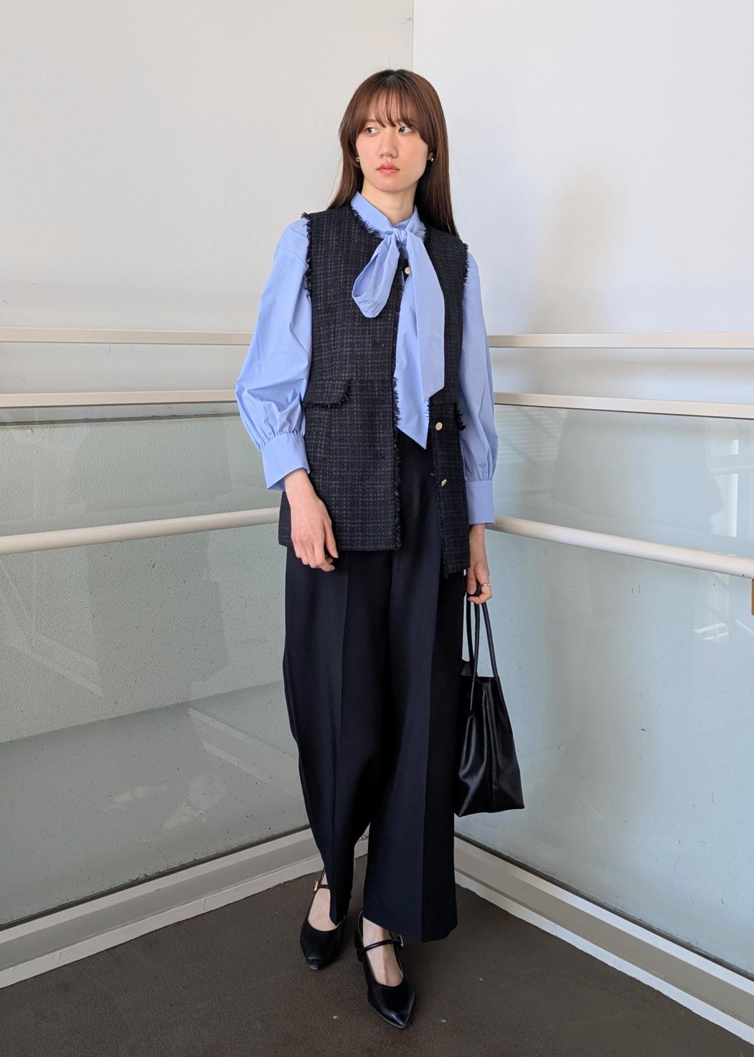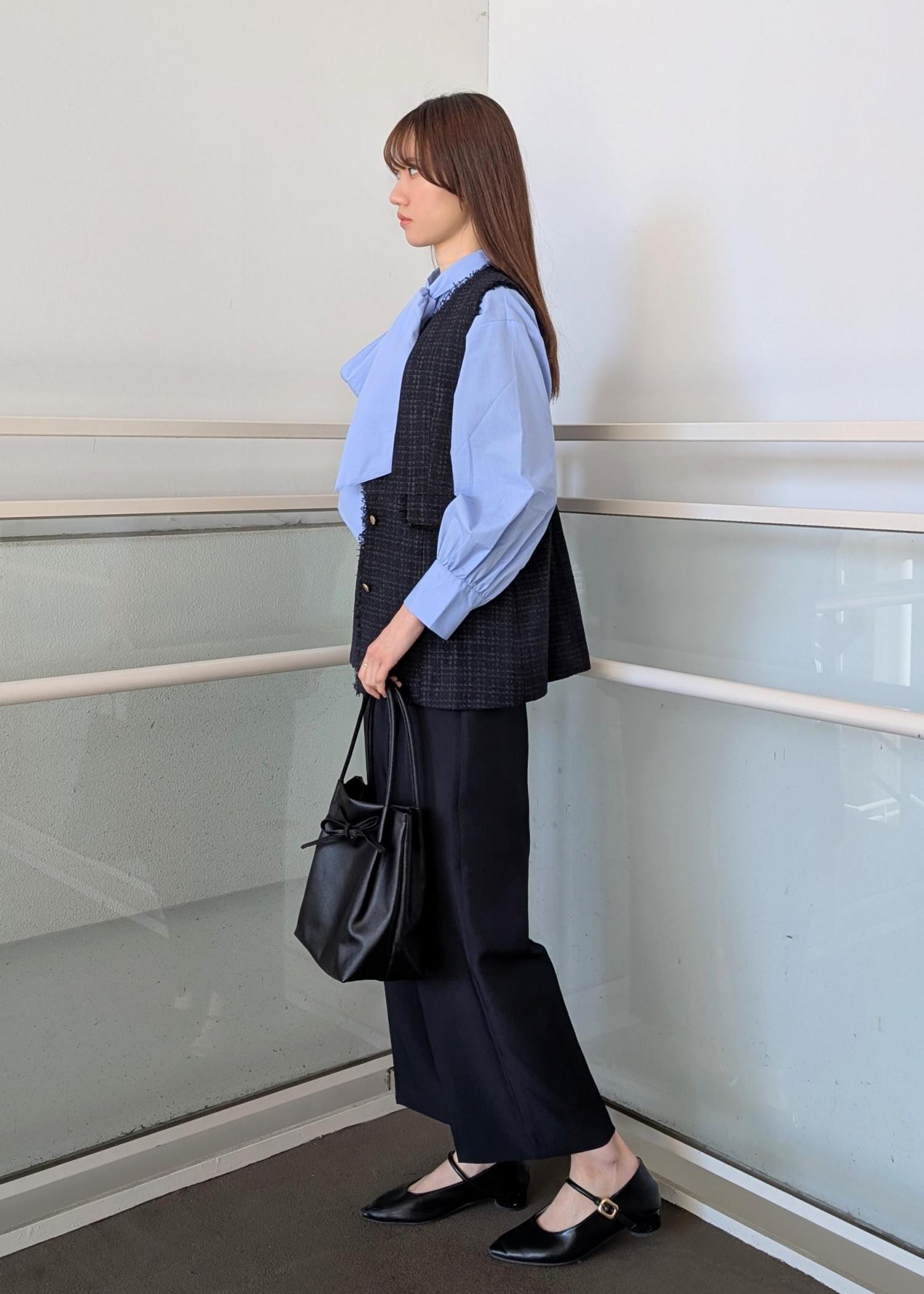 リボンが苦手な方はボウタイを片結びにすると甘さを控えながらも華やかな着こなしになりますよ。ネイビーのツイードはブラウスのカラーを変えると卒業と入学のどちらでも使える万能アイテムです。