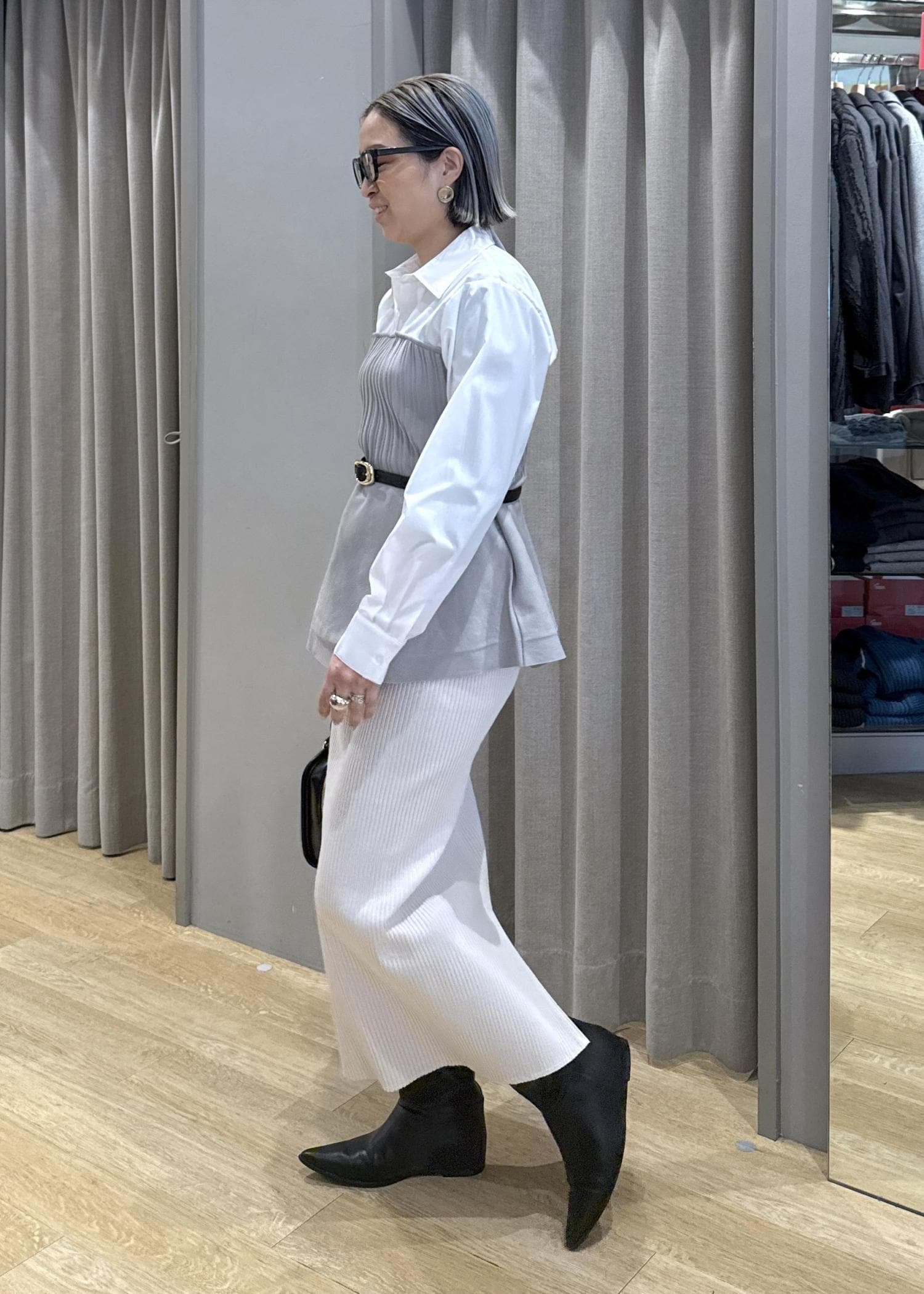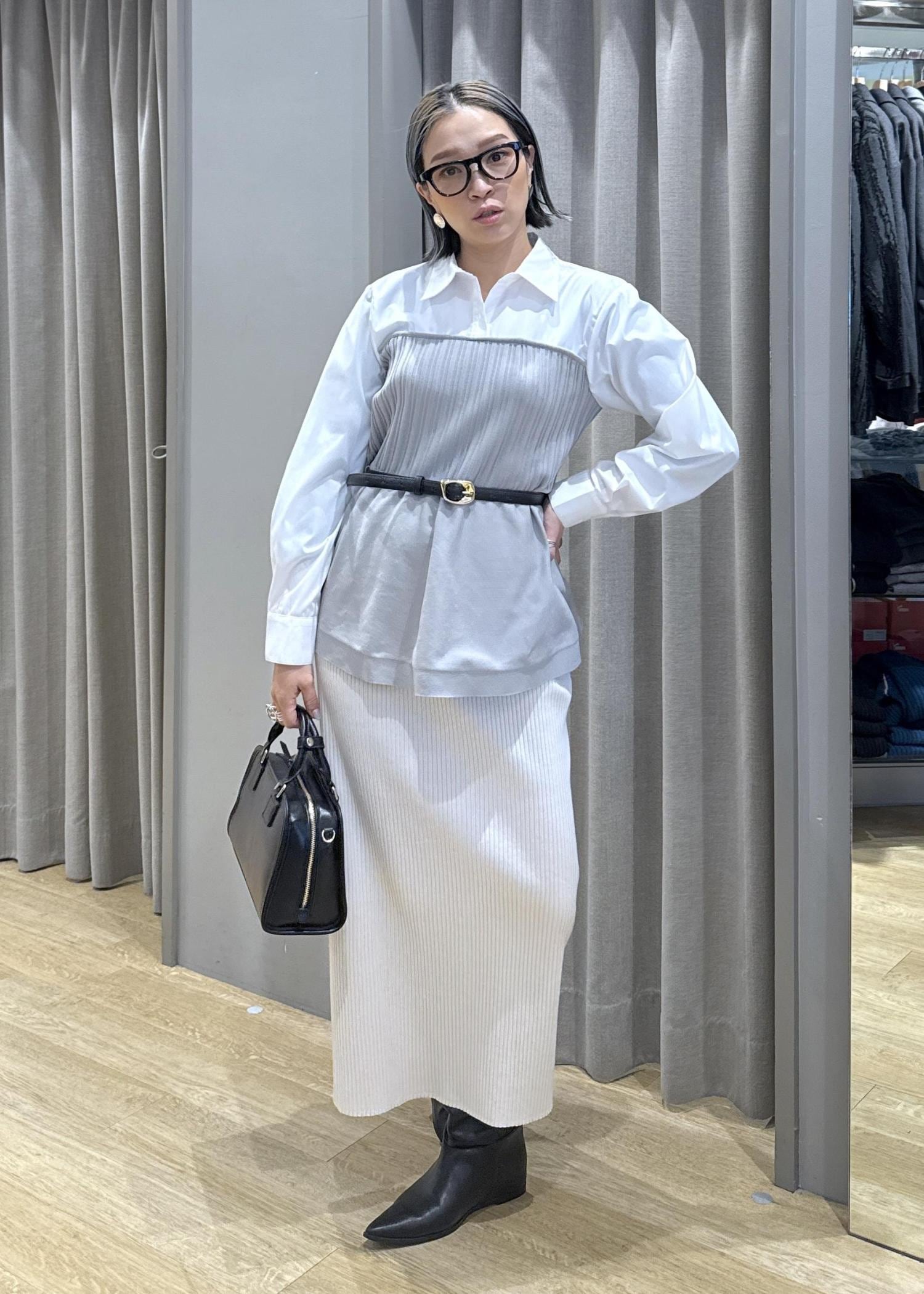 ビスチェドッキングのシャツにベルトアクセントをする事で