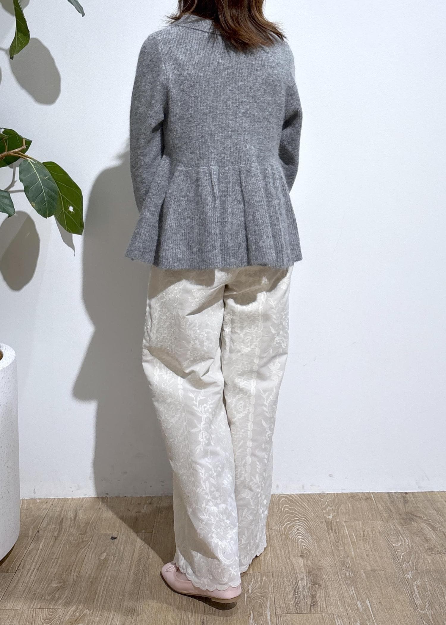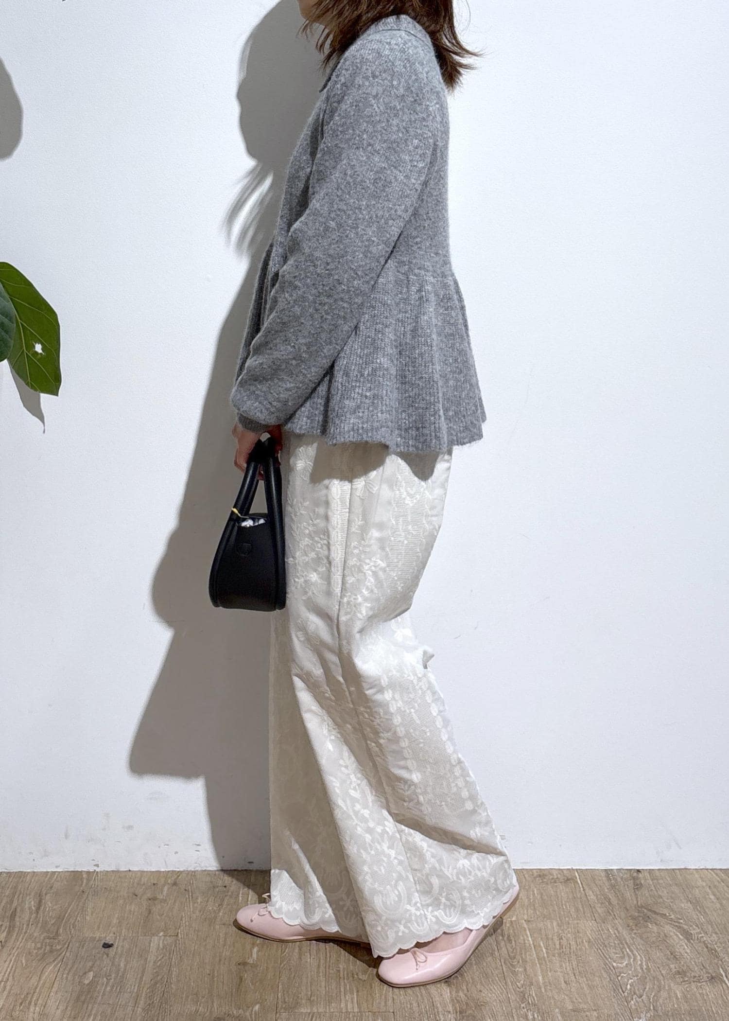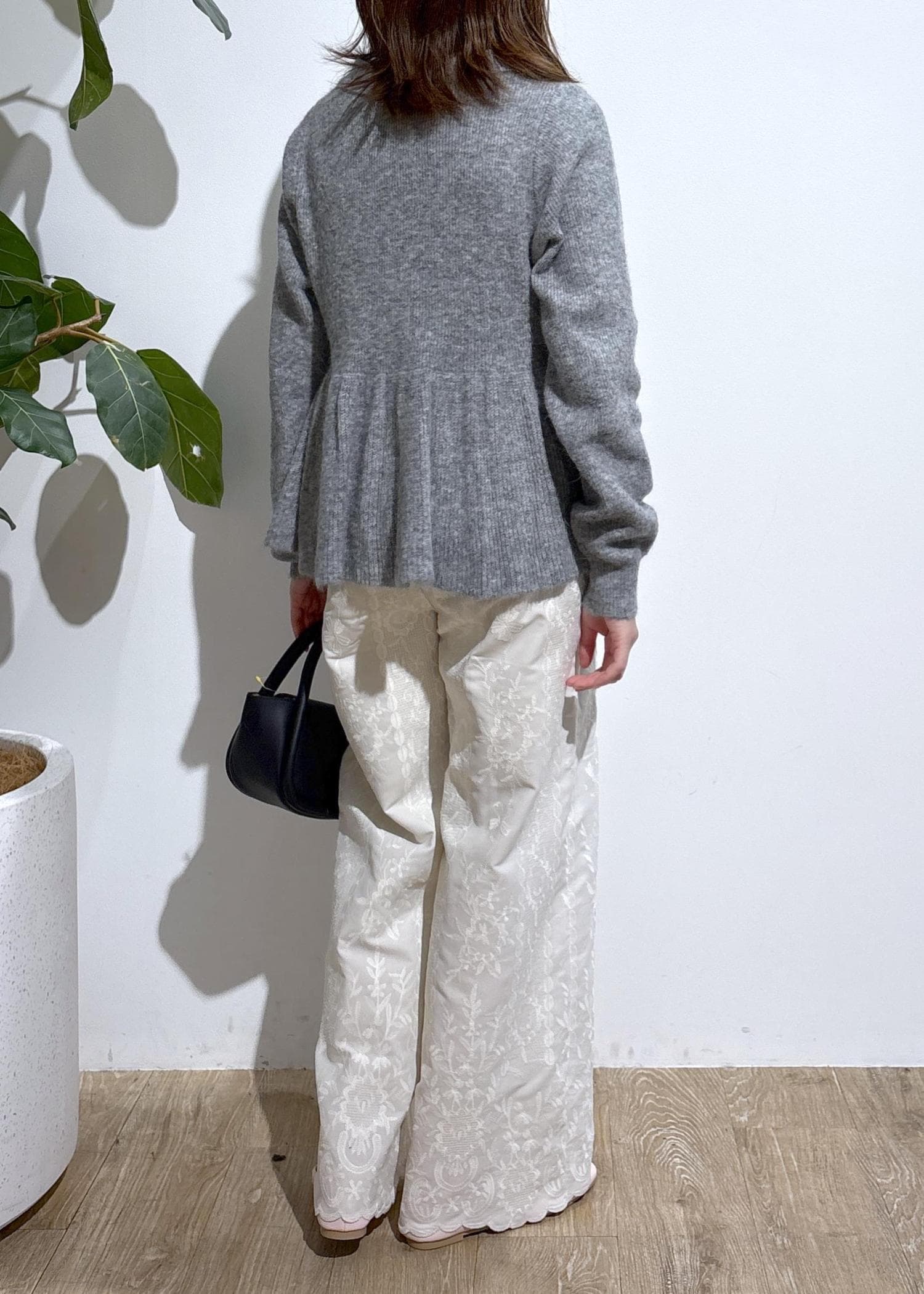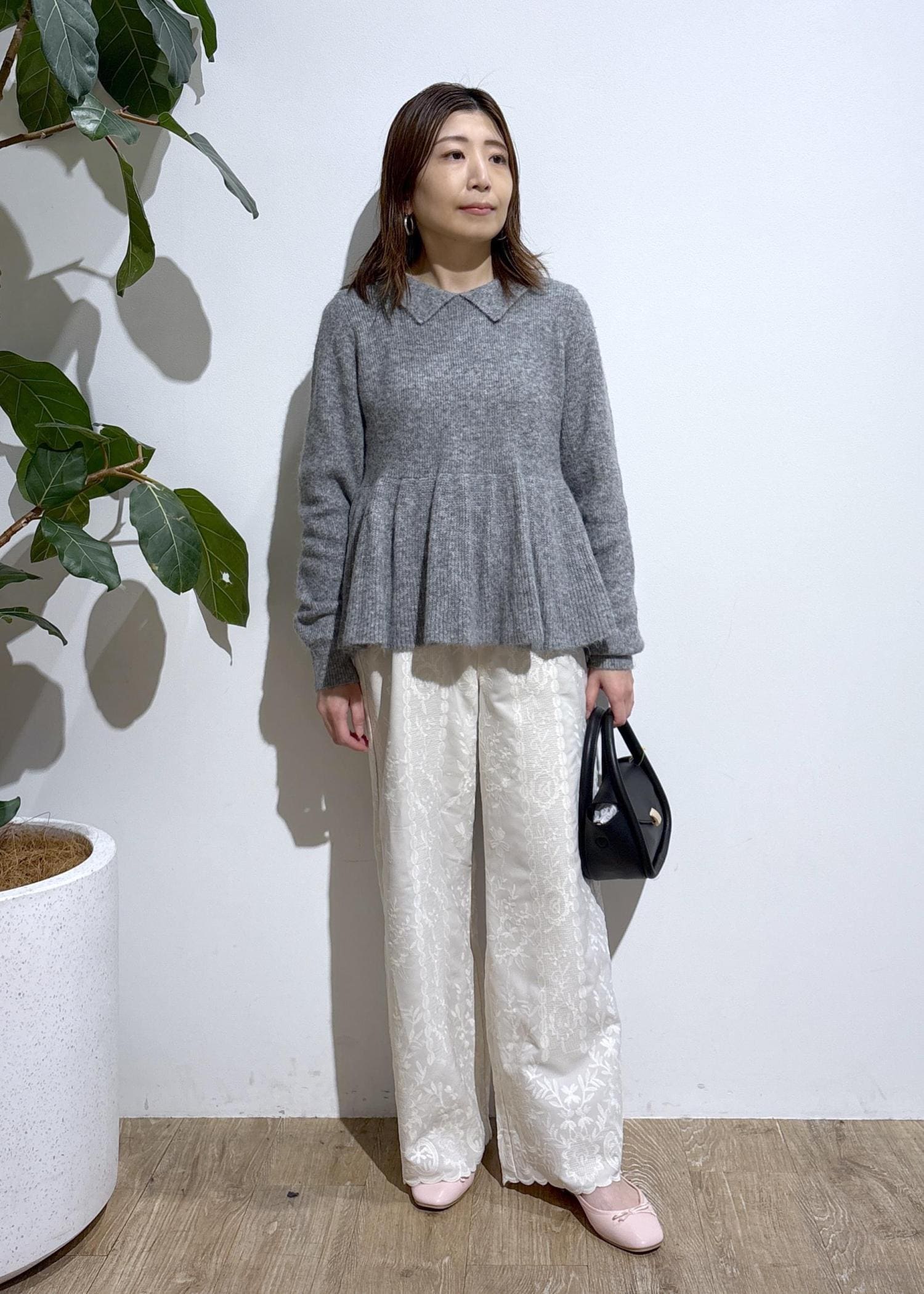 ウエストから広がるペプラムシルエットで気になる腰回りをカバーしながら、リブ編みのように縦ラインが入っていることですっきり着用できるデザイン。