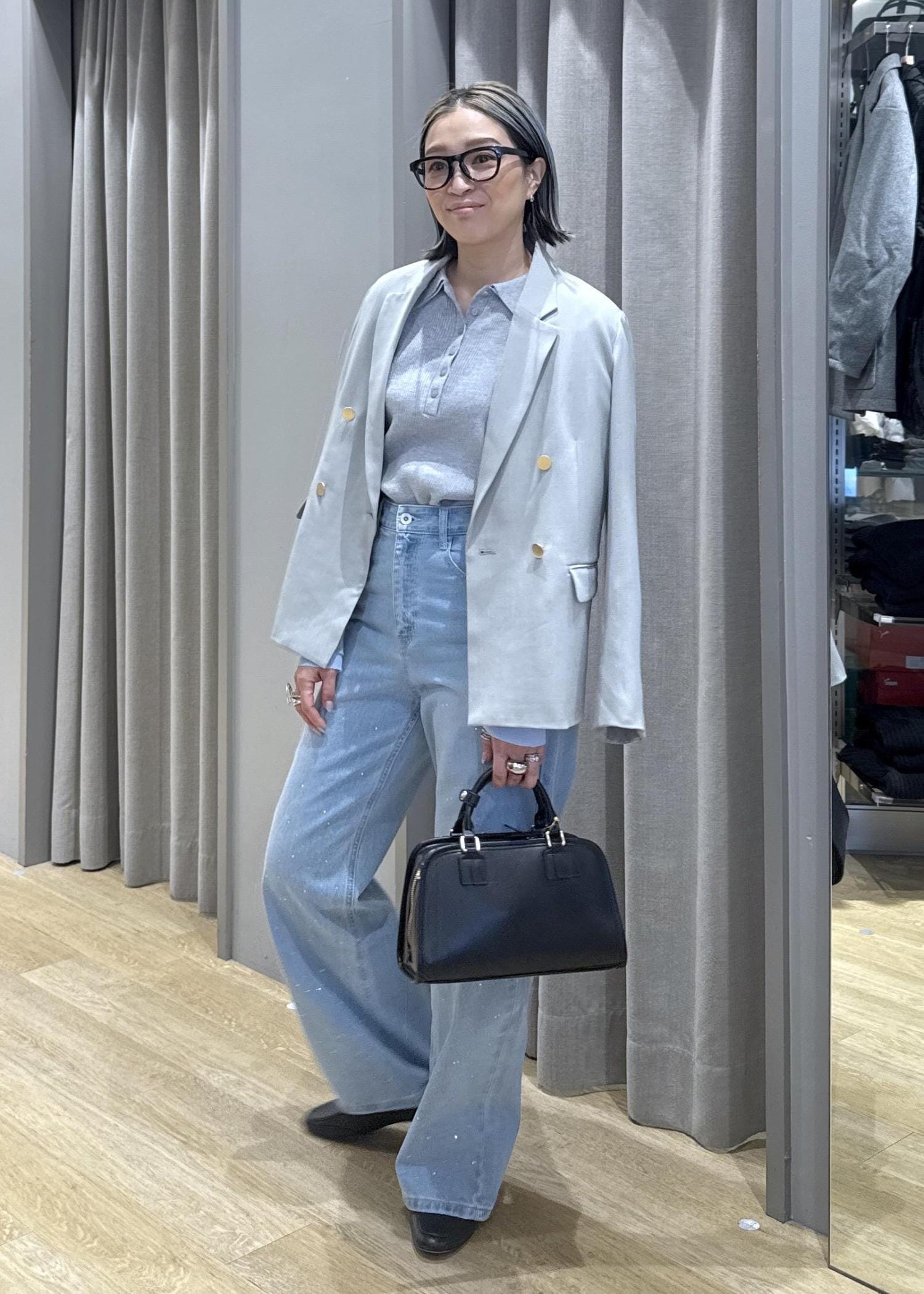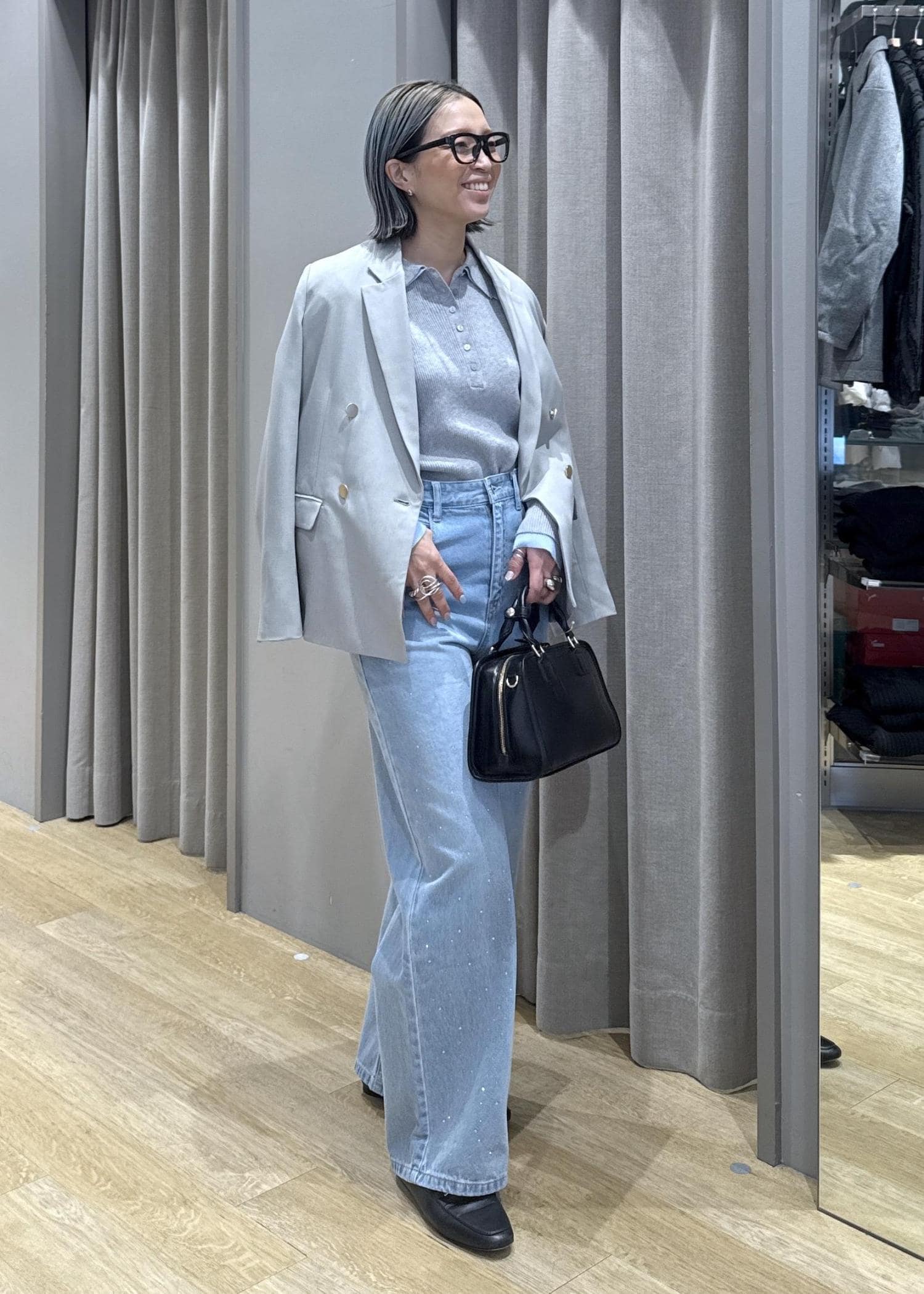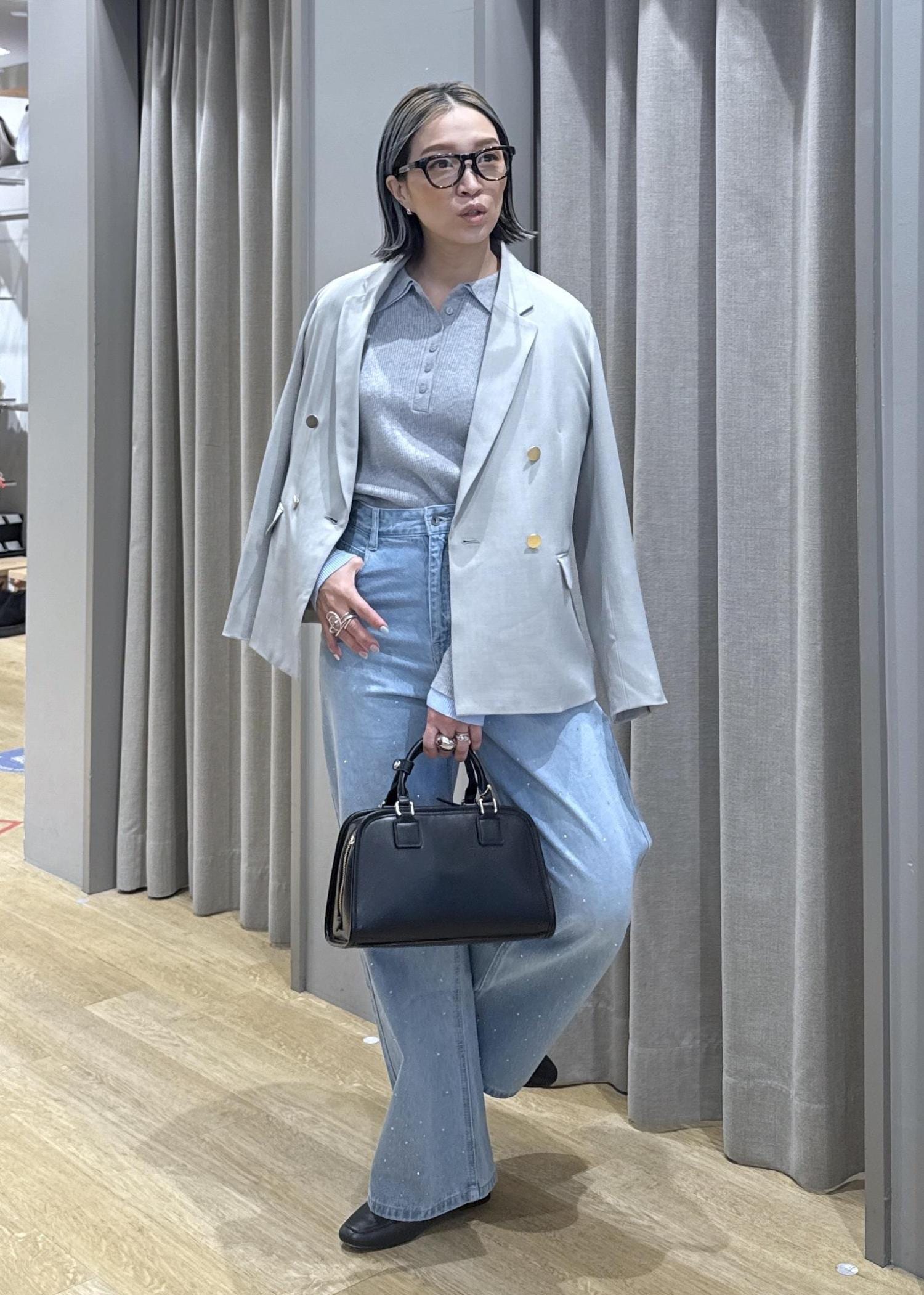 中に着ているニットポロも襟の差し色が自然にアクセントになってくれます♪