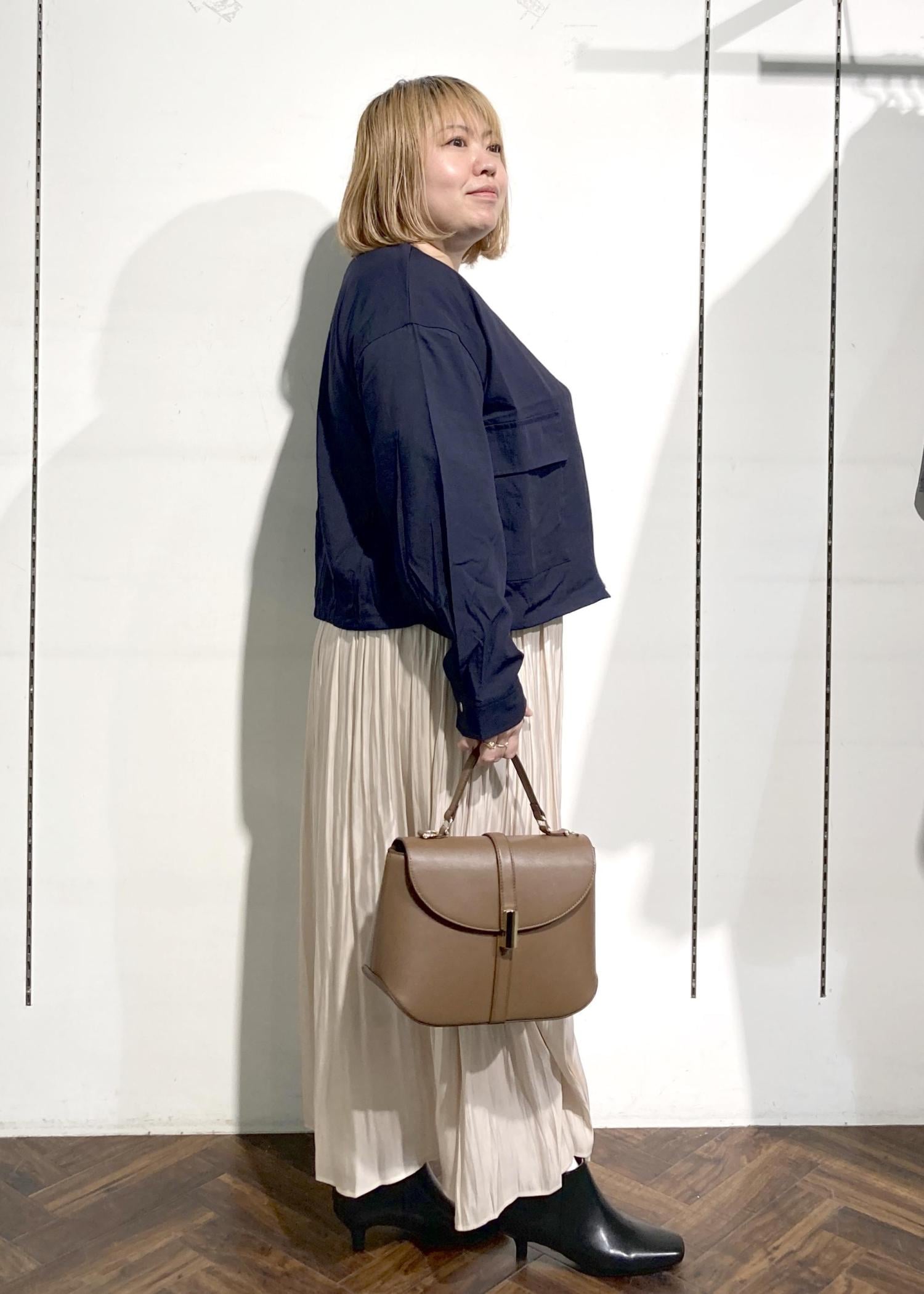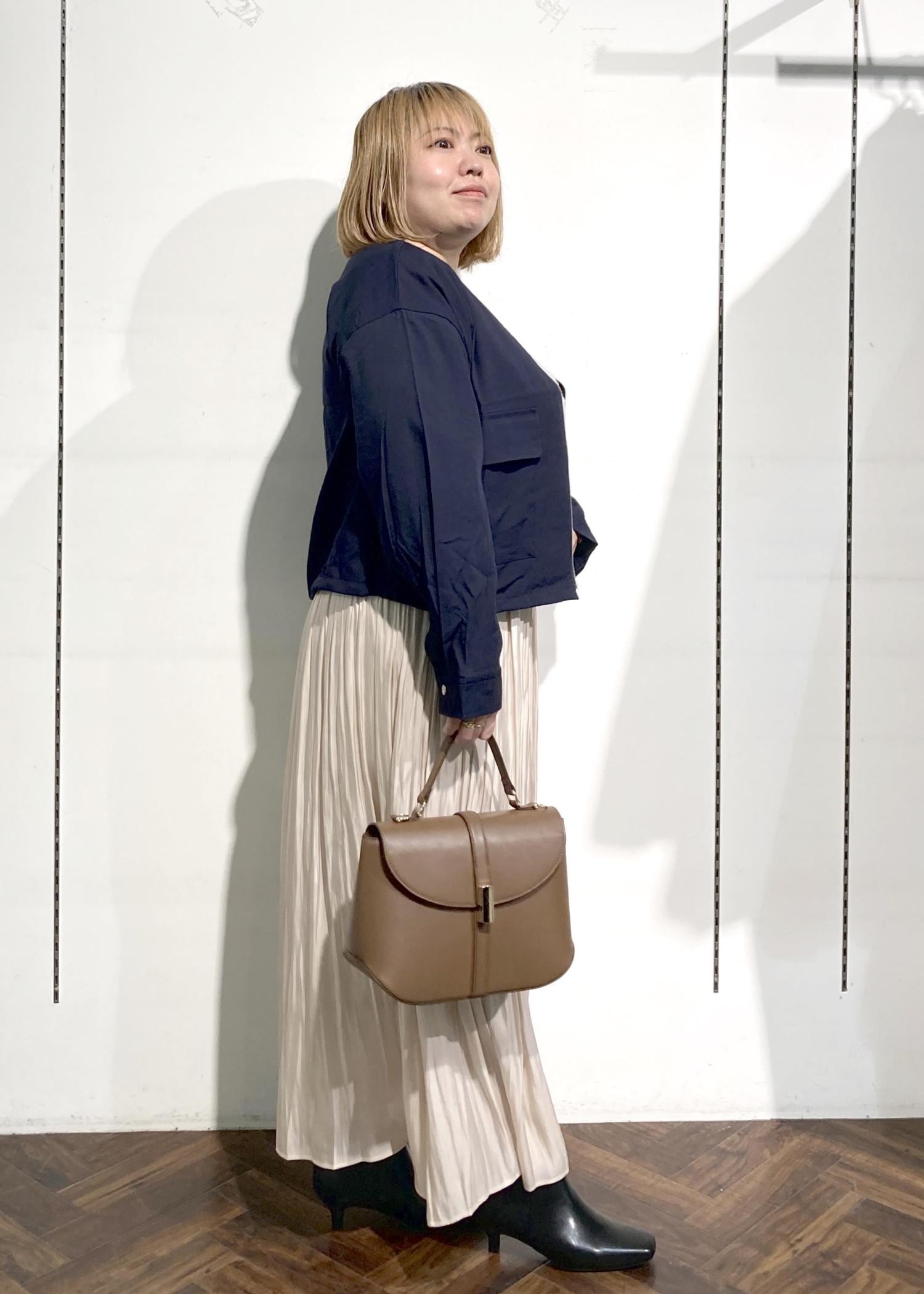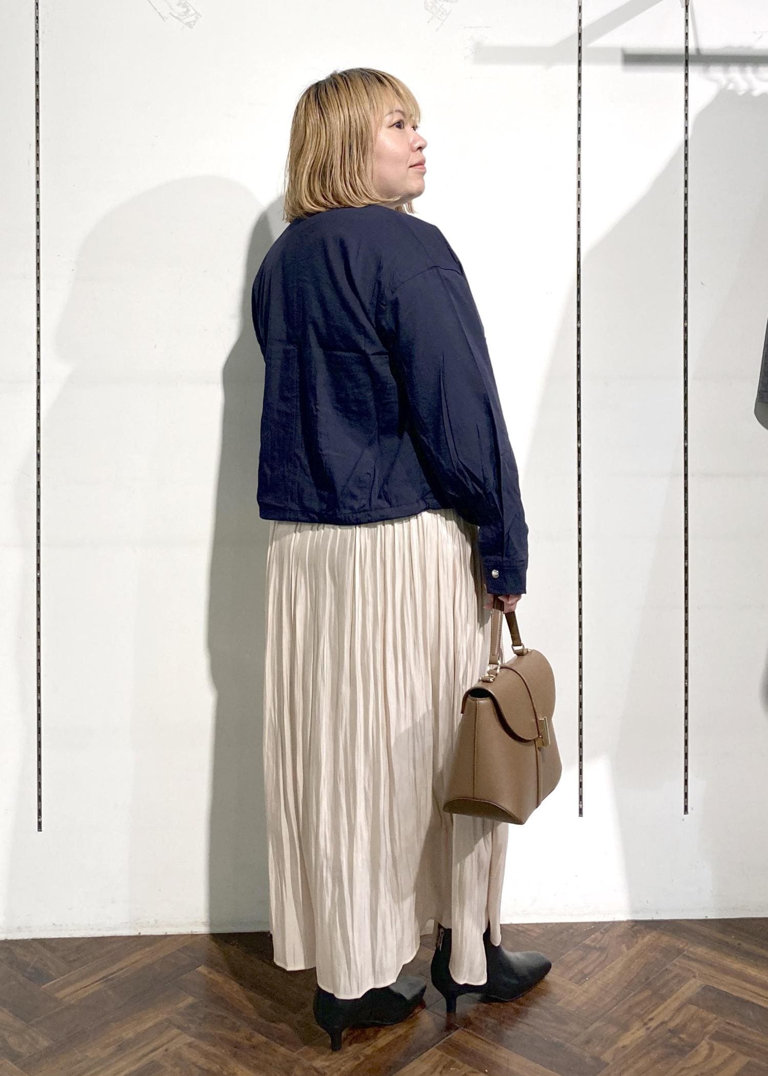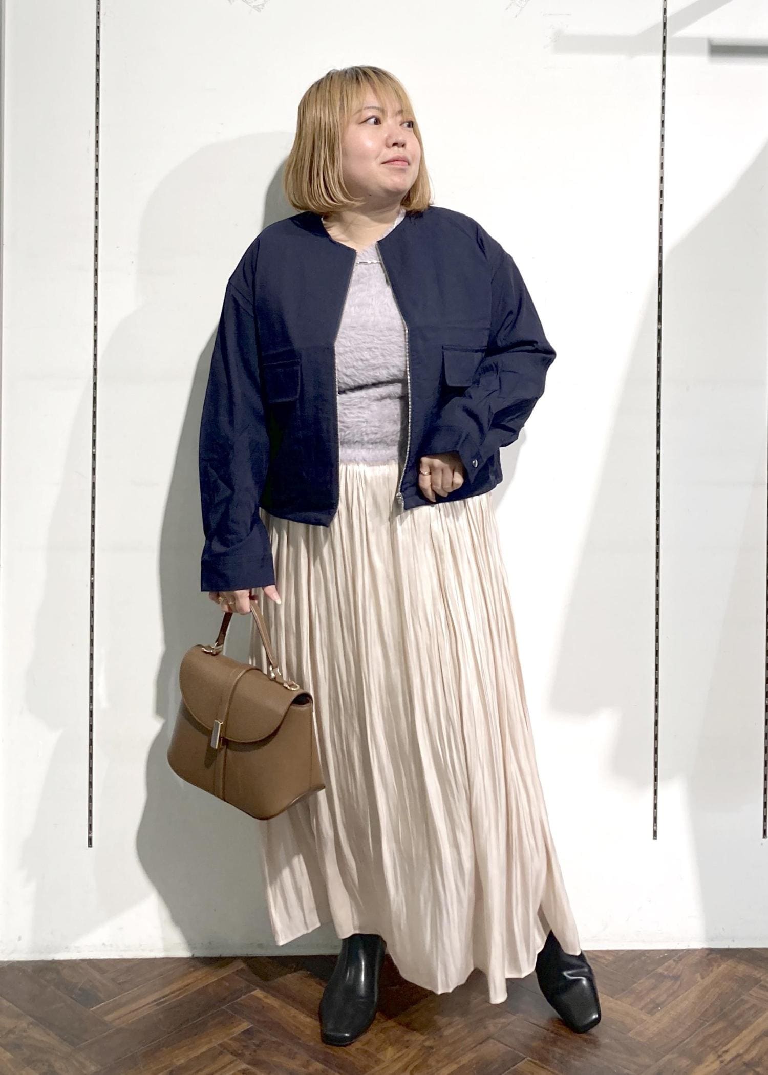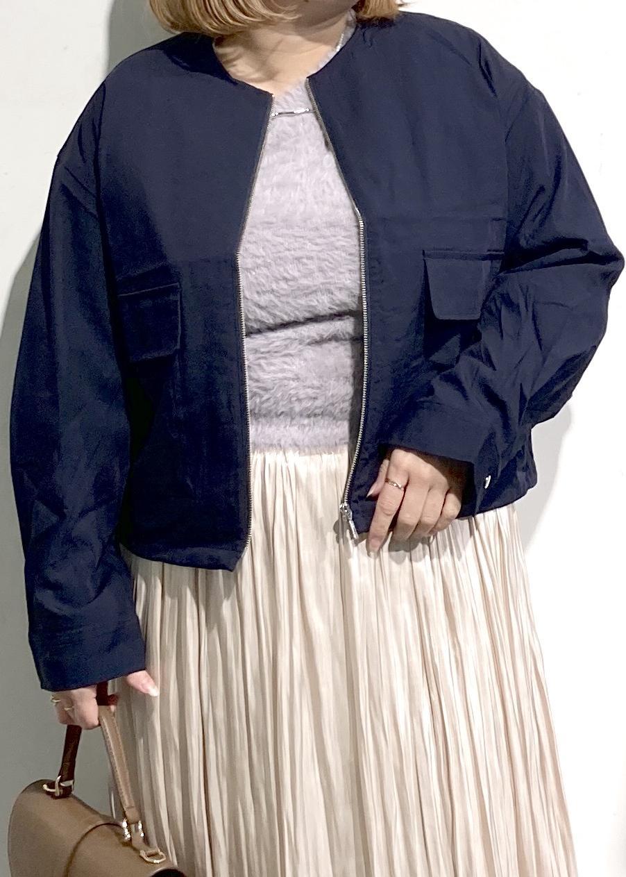 ポケットのデザインがカジュアルな印象ですが、ノーカラーなのでフェミニンスタイルにも馴染みます。