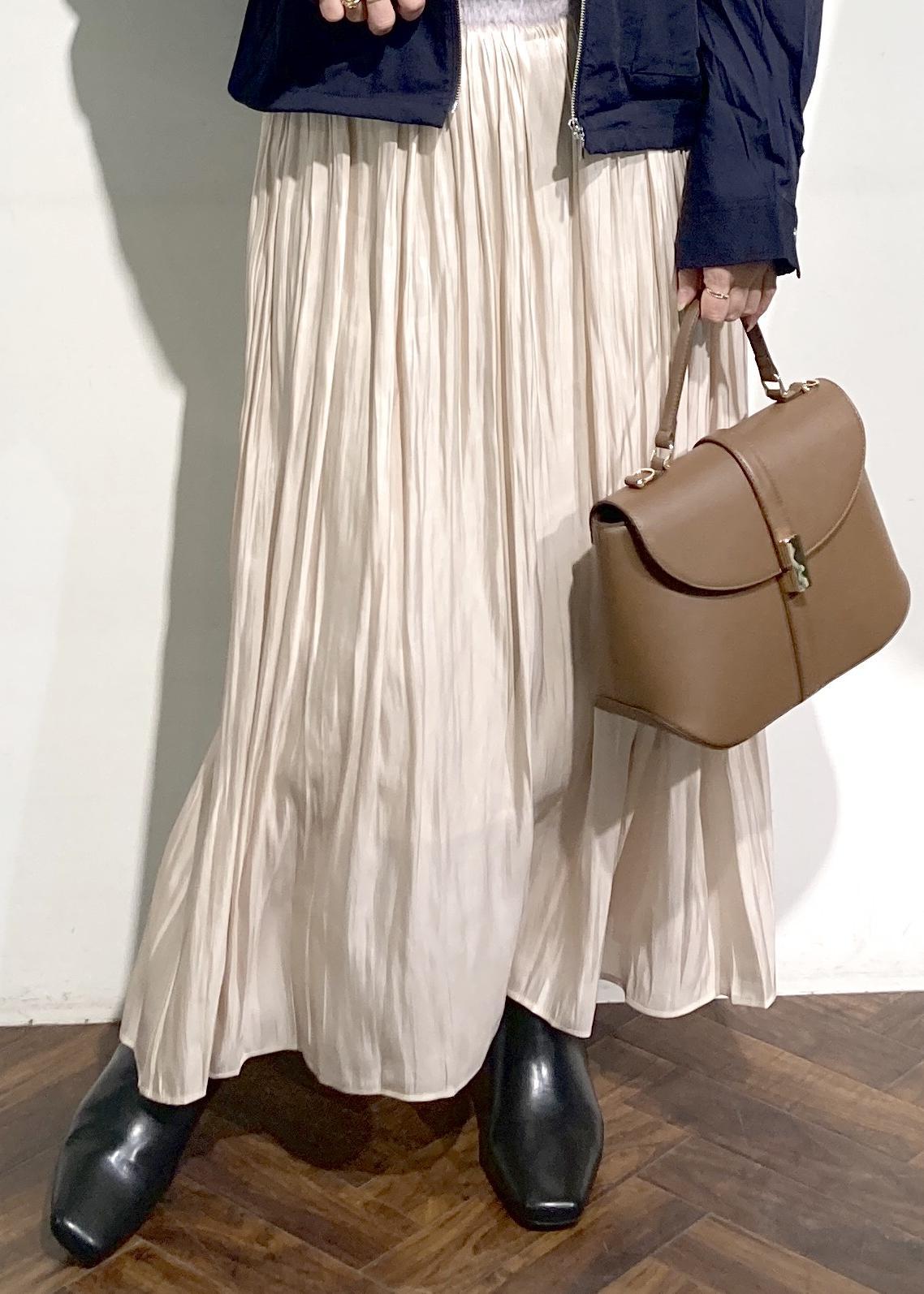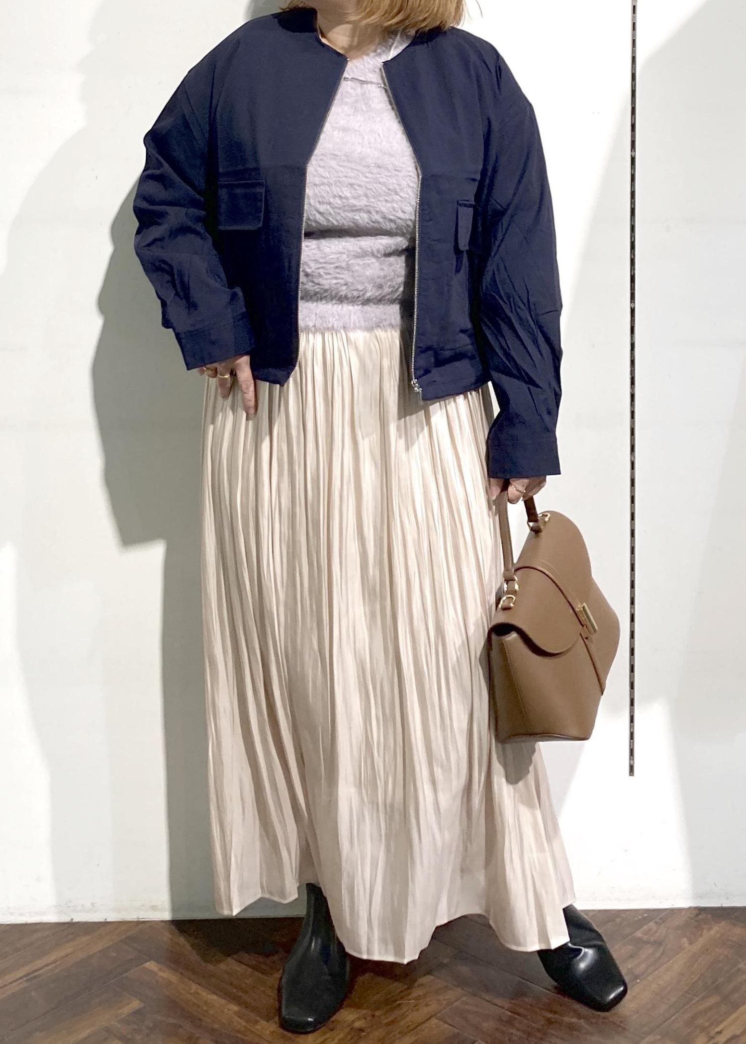 光沢感のあるスカートを合わせて大人っぽコーデにしました。