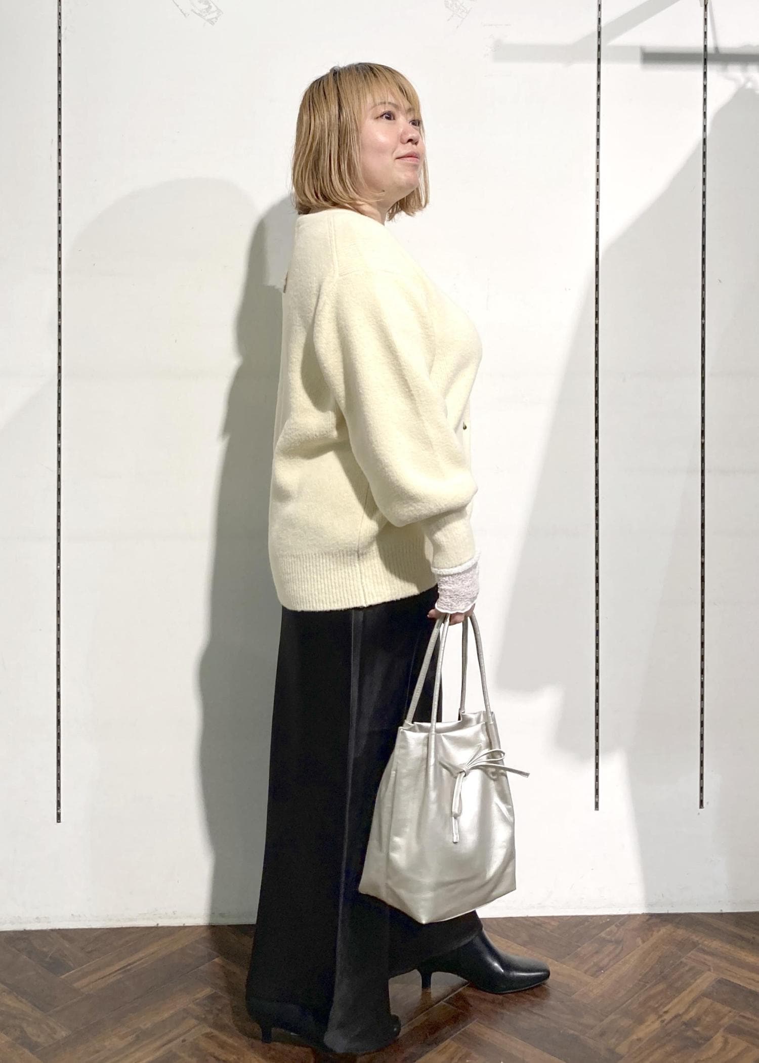 クリーム色が春っぽさの出るカーディガンのコーデです。