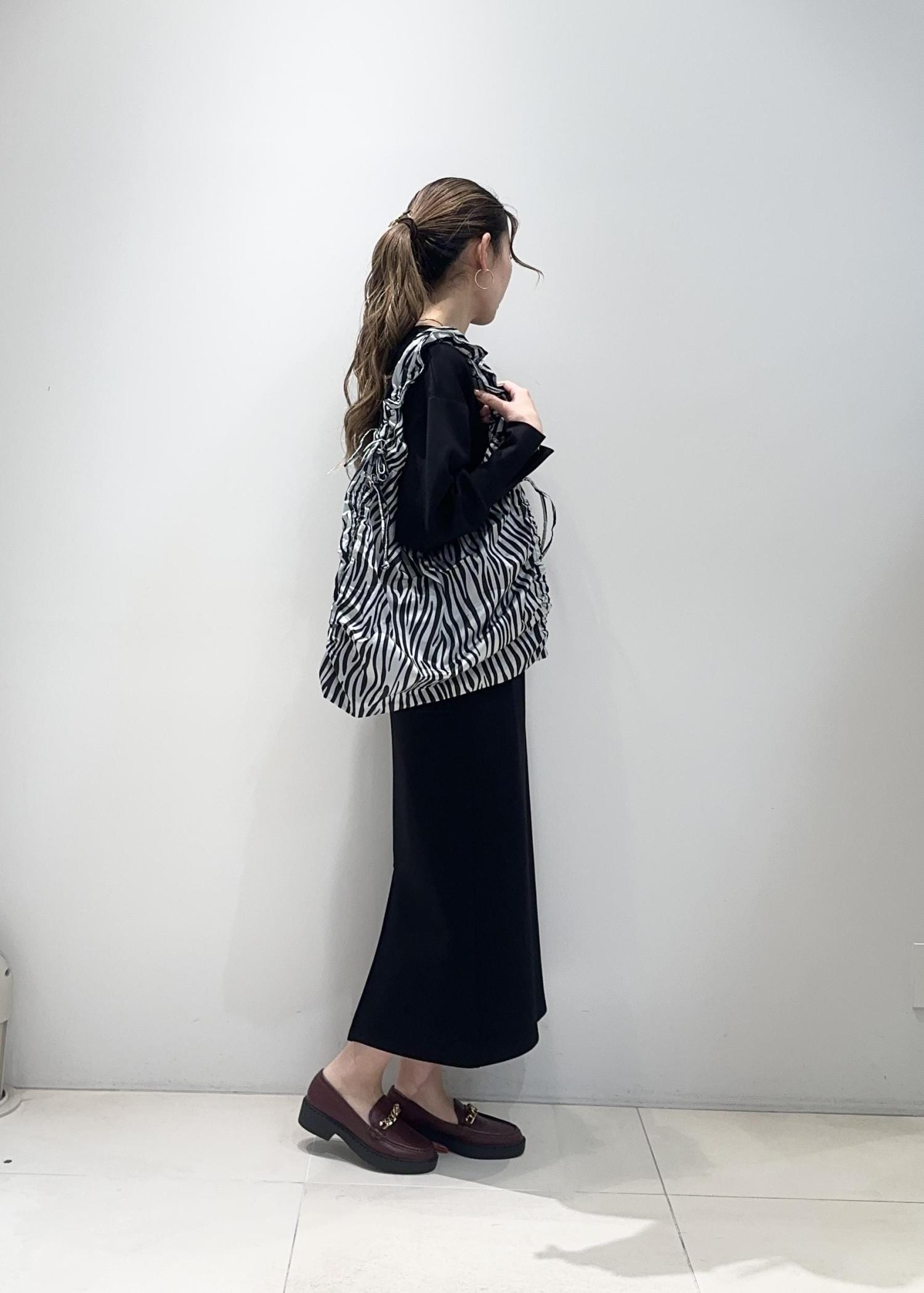 足元はローファーでまとめ、