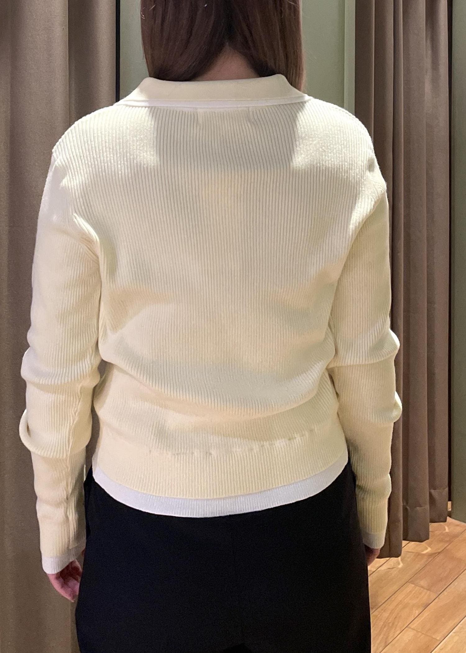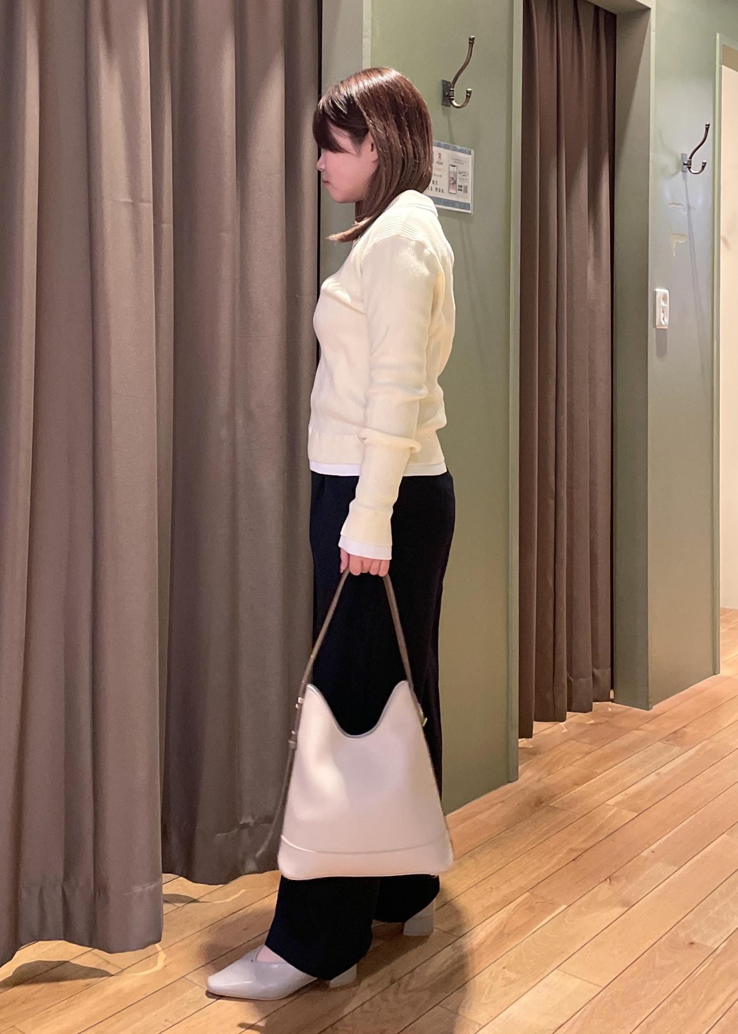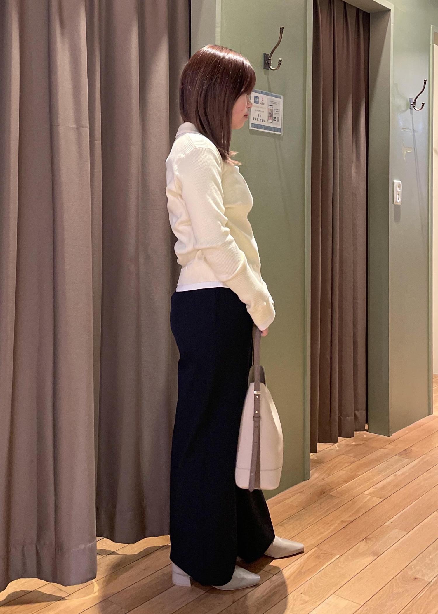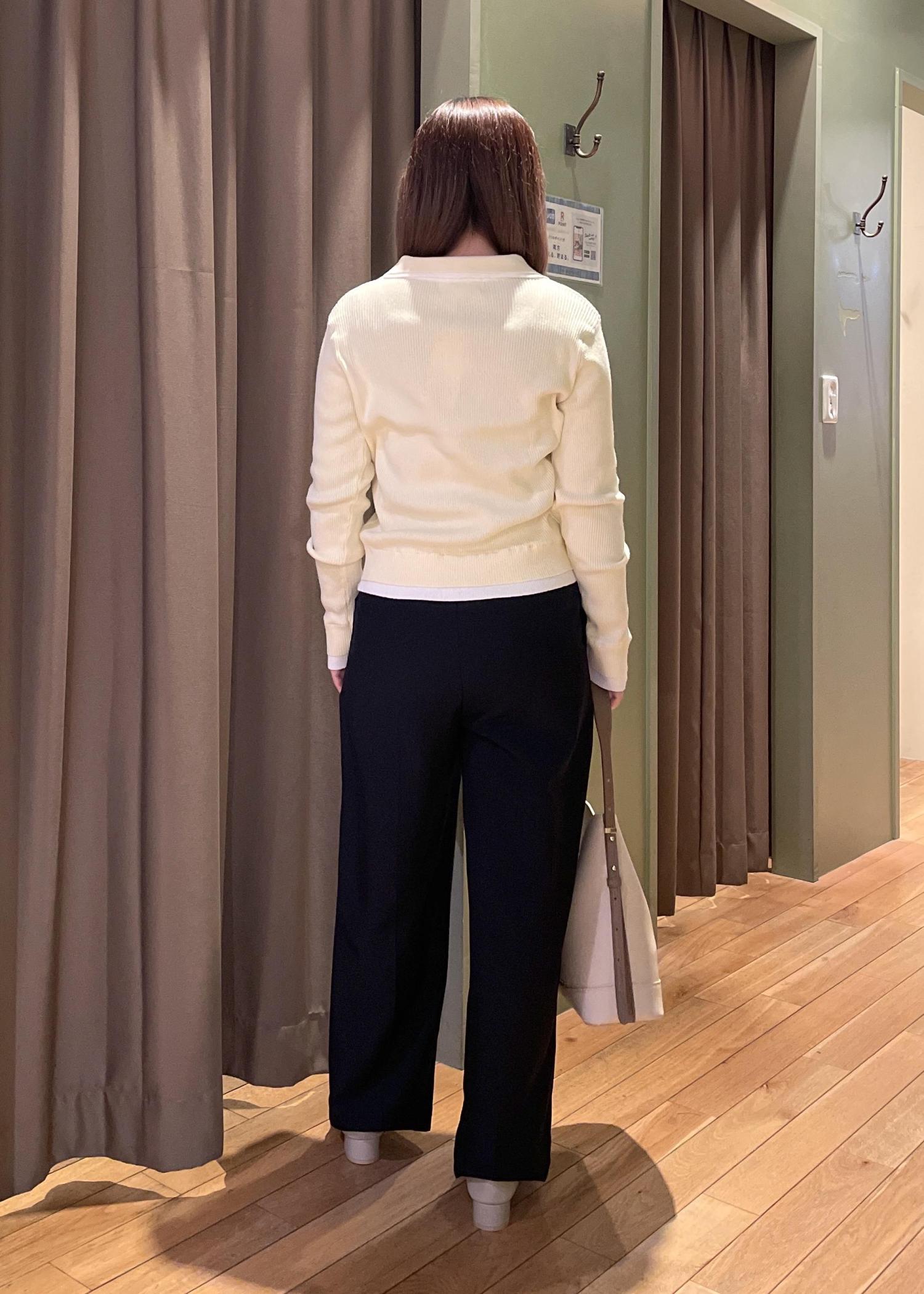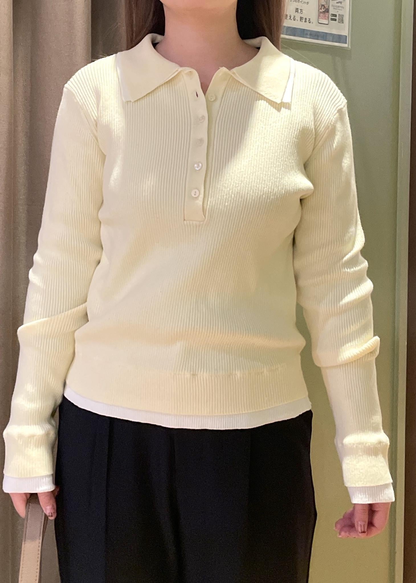 トップスの【レイヤード風リブポロニット】は、ほどよいフィット感で体のラインを拾いにくく、すっきりとした印象に見せてくれます!