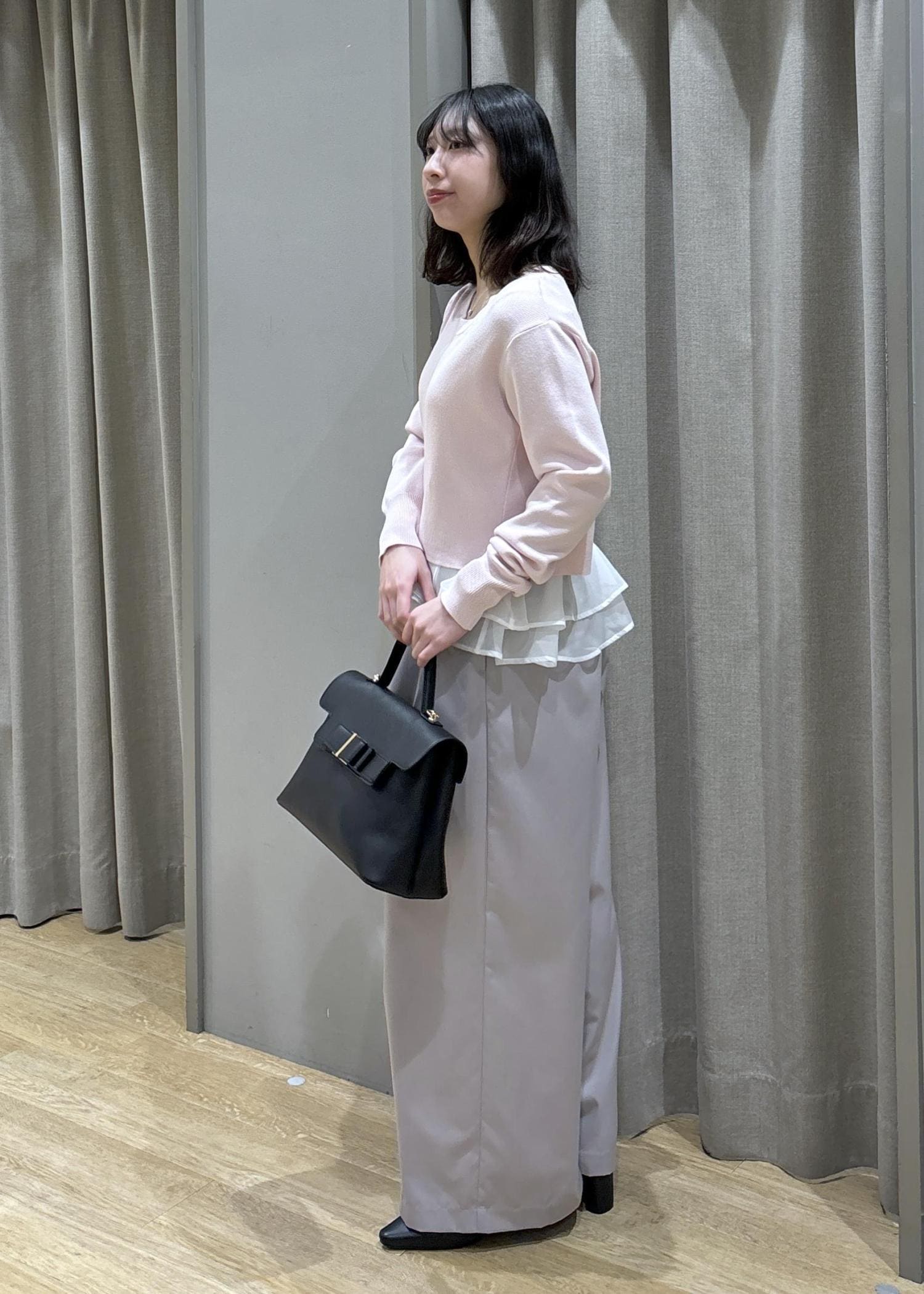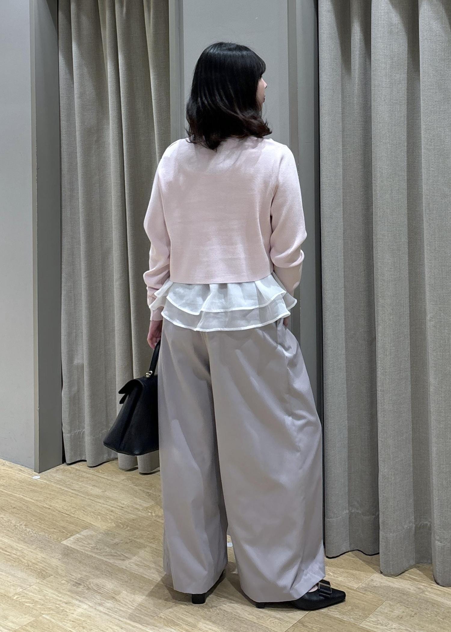 ペプラムオーガンジードッギングニット×フロントタックパンツ