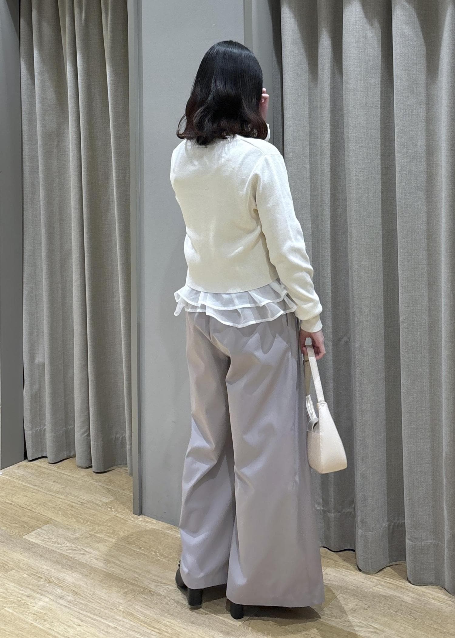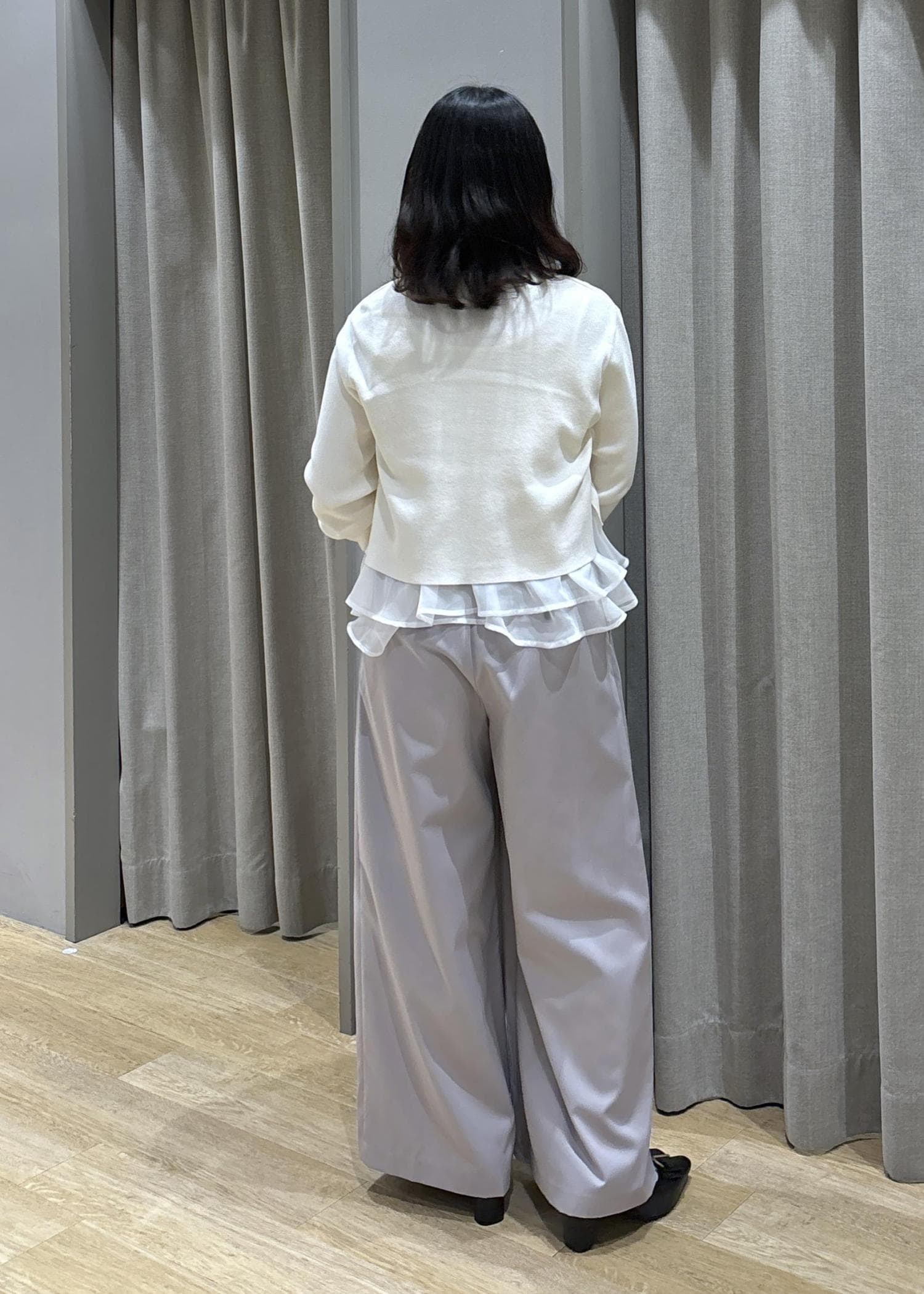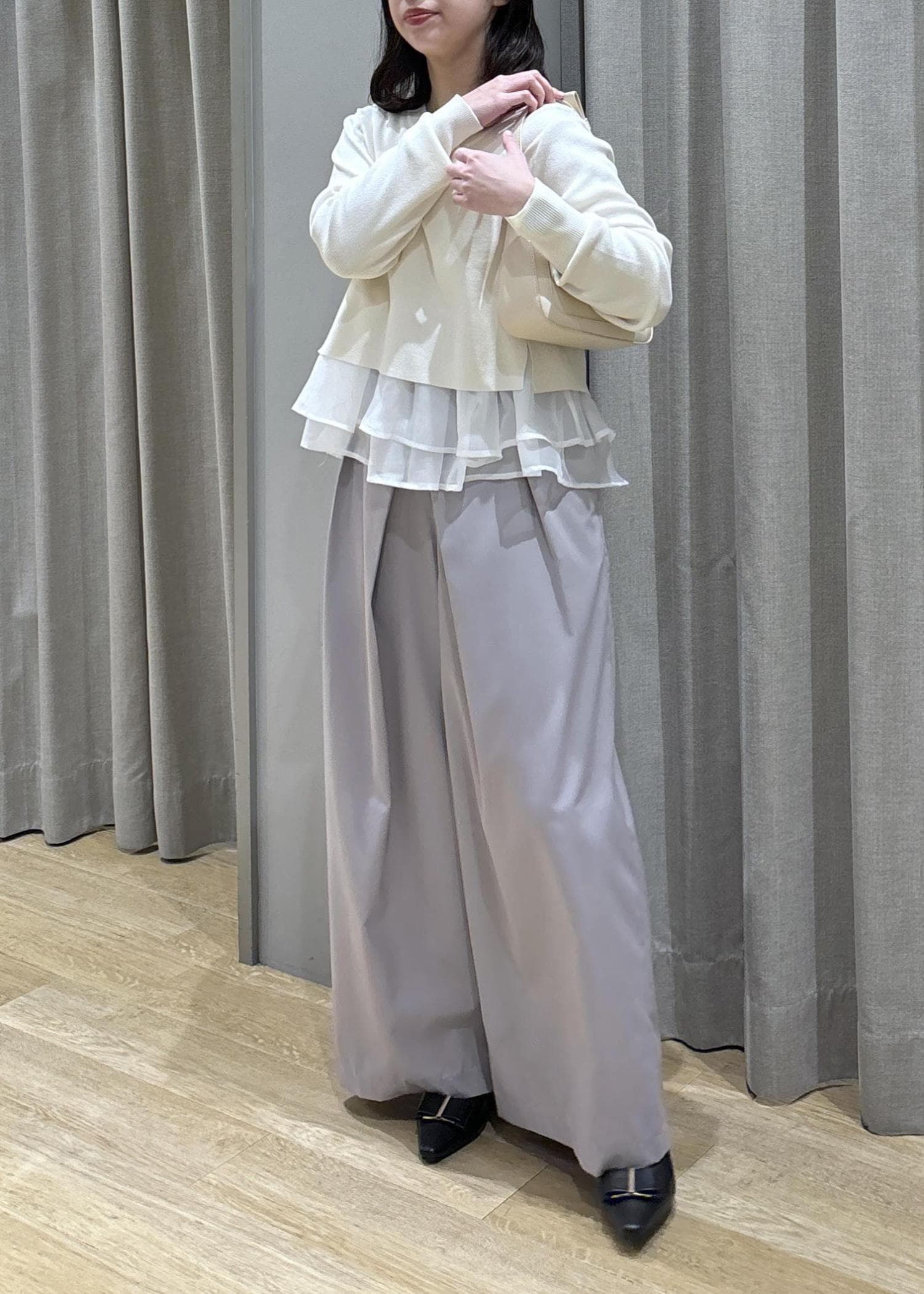 ペプラムオーガンジードッキングニット×フロントタックパンツ