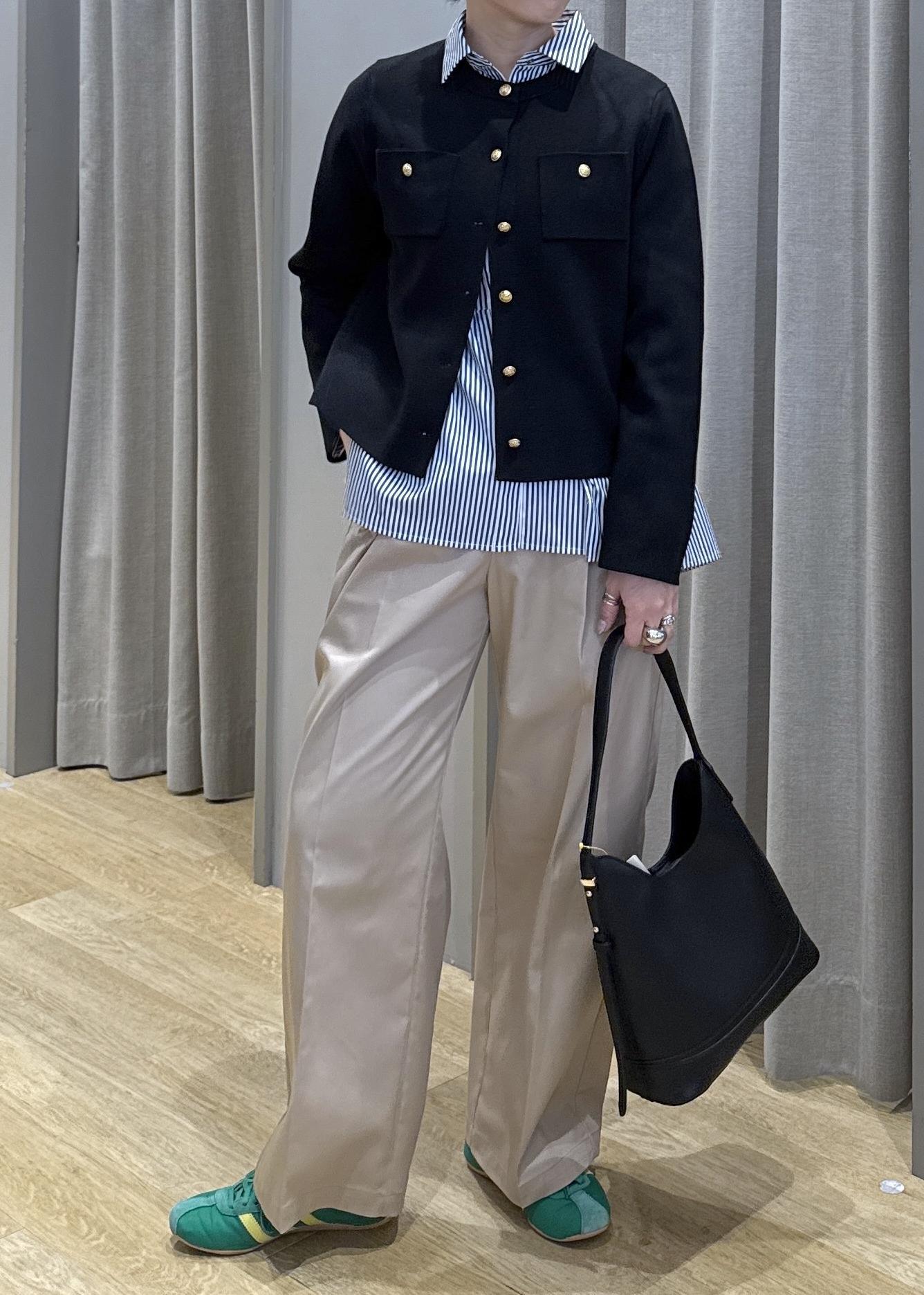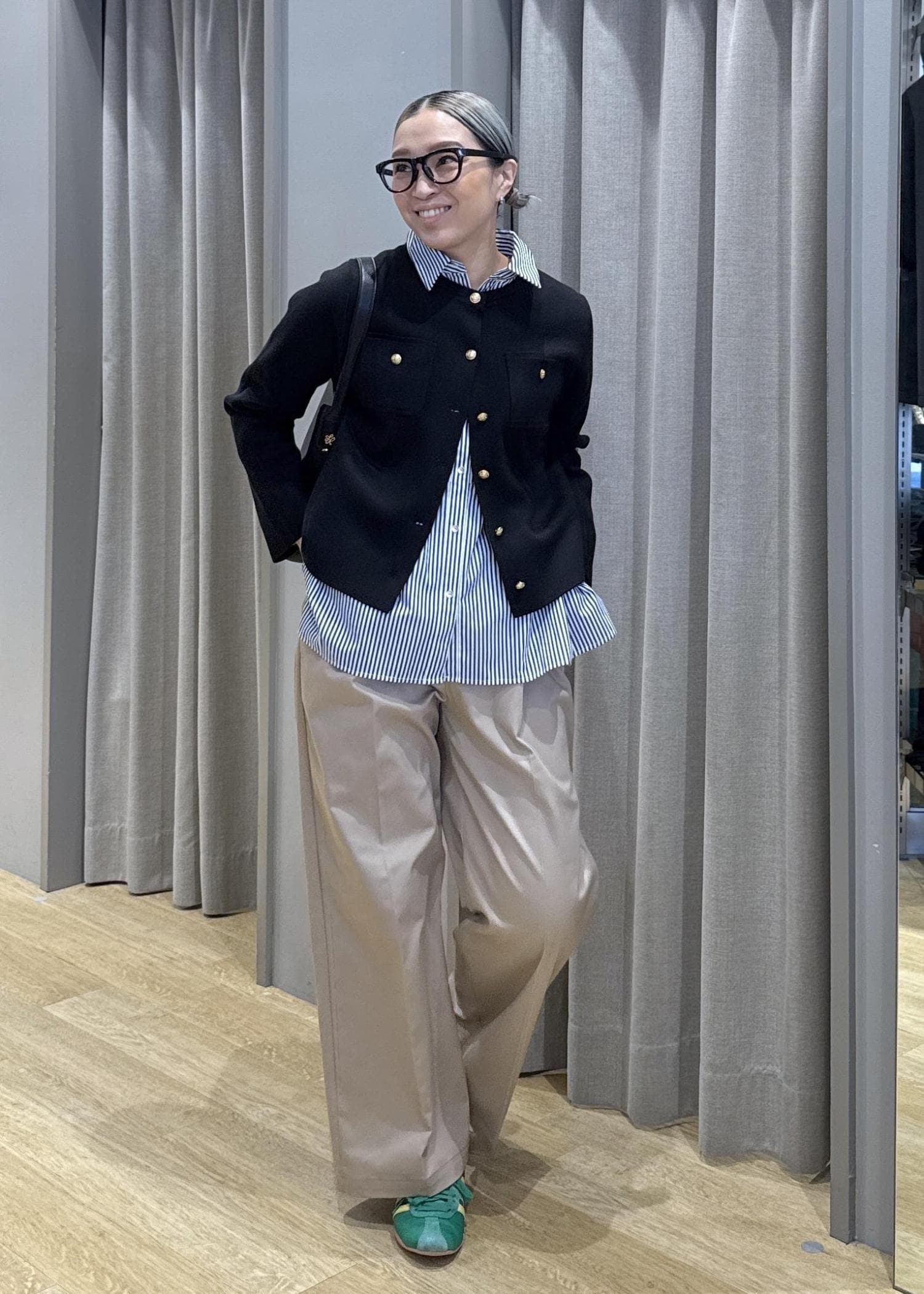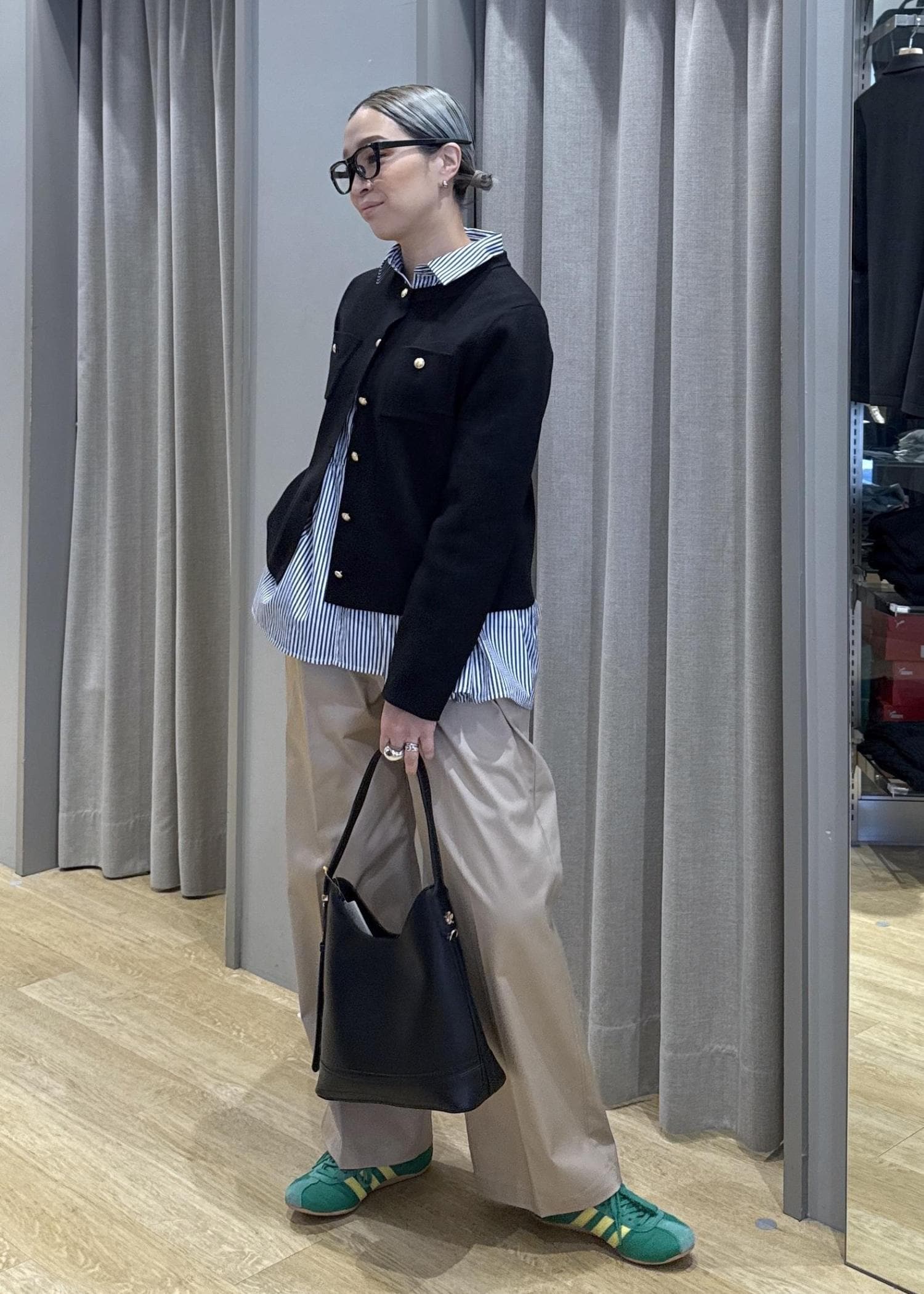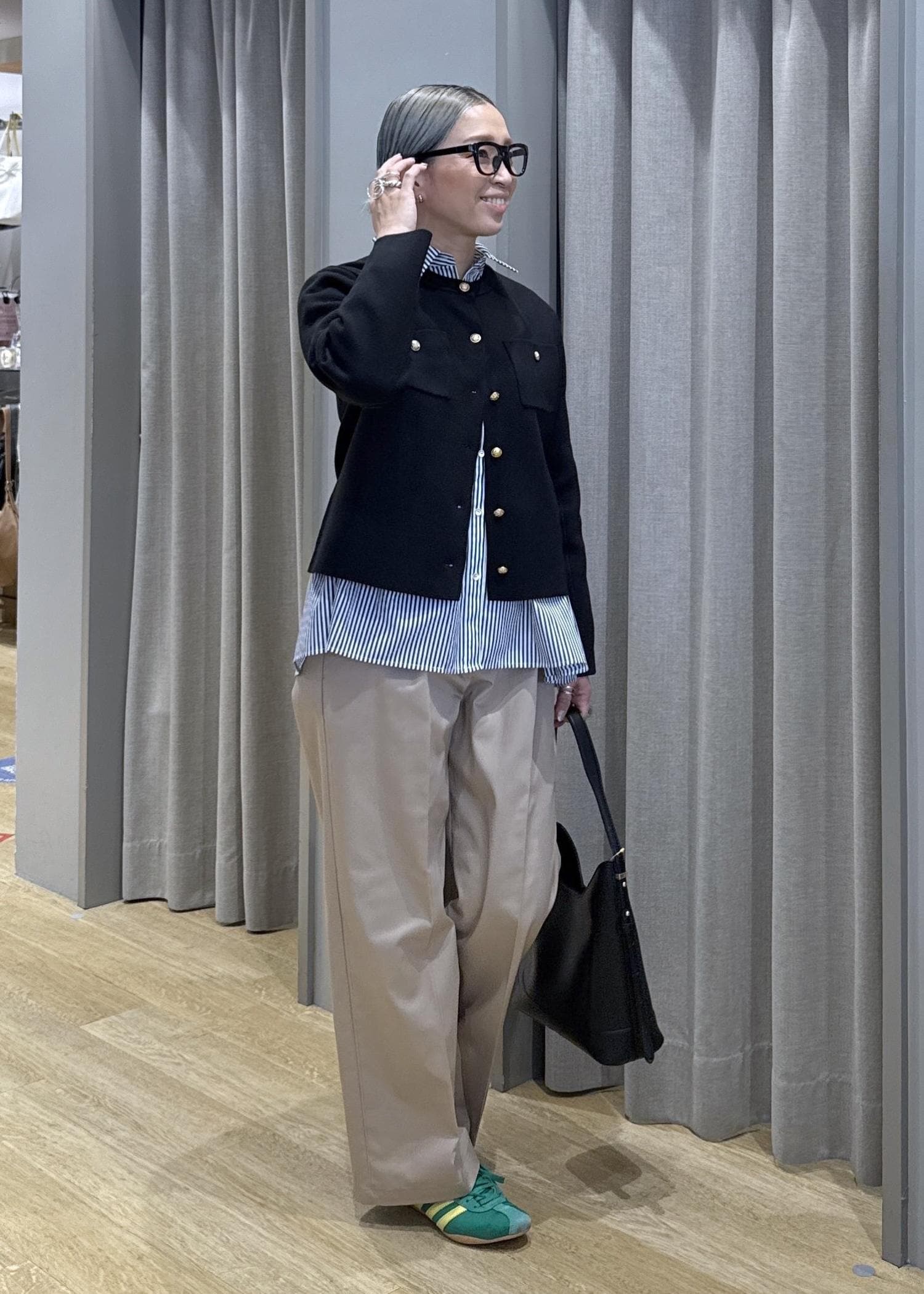 金ボタンのインパクトと中に着ているペプラムラインを崩さない為に、上だけボタンを留めて流して着ています。