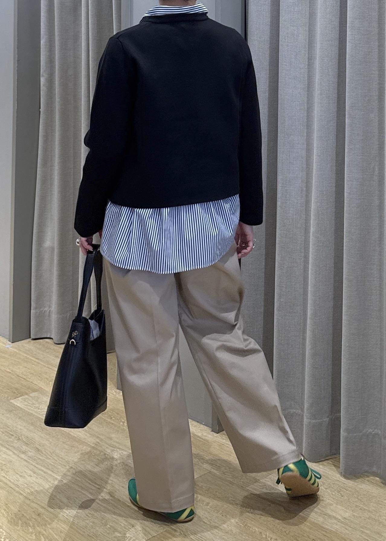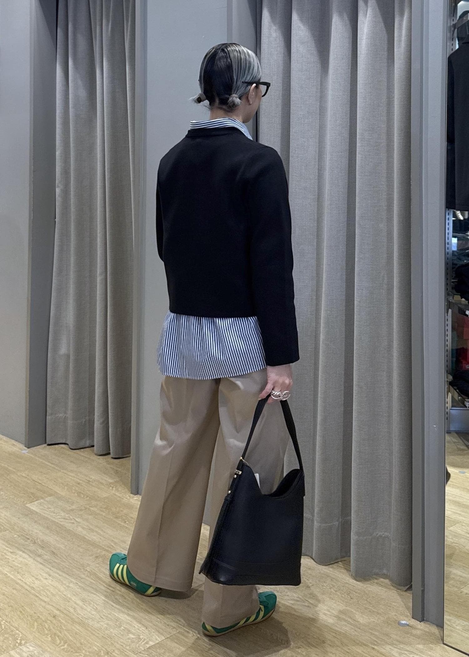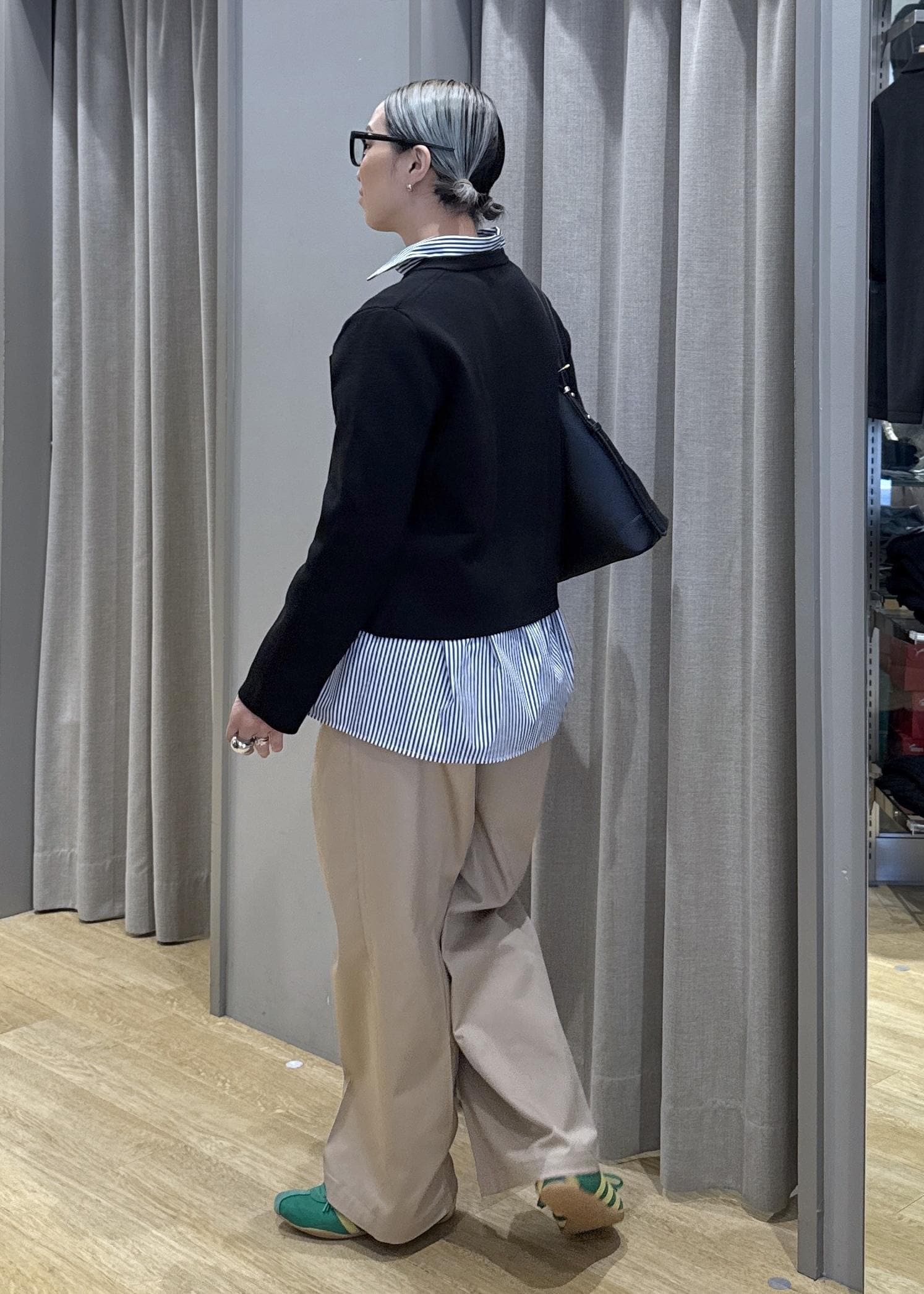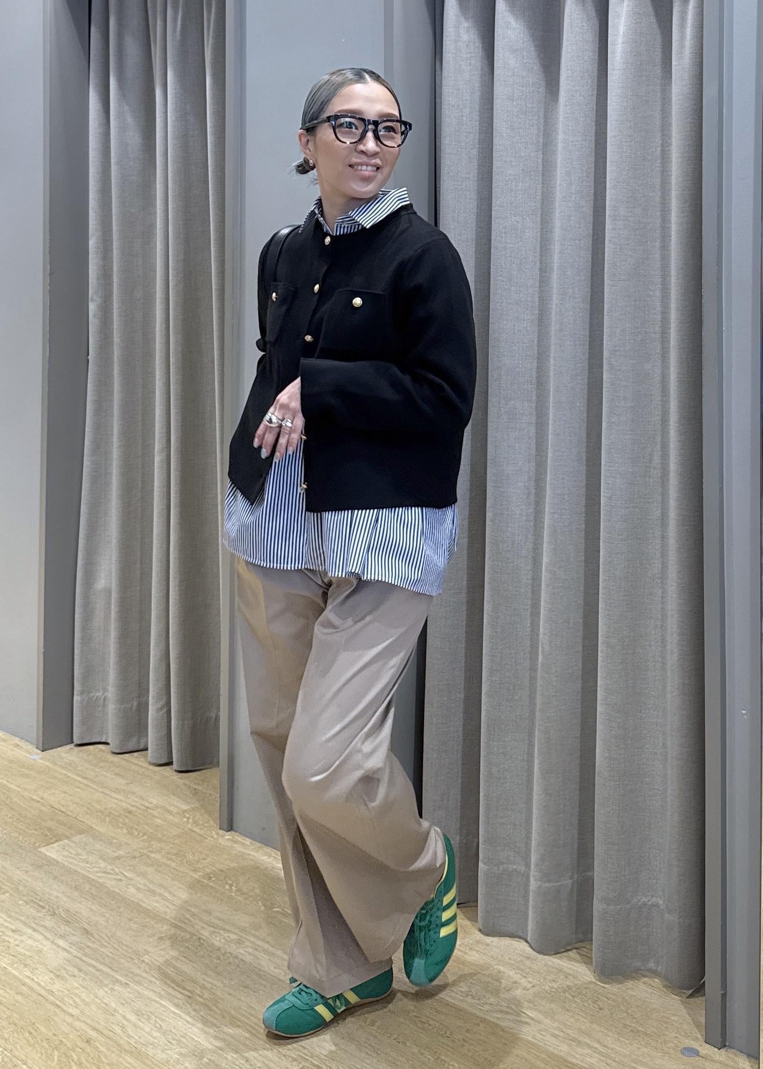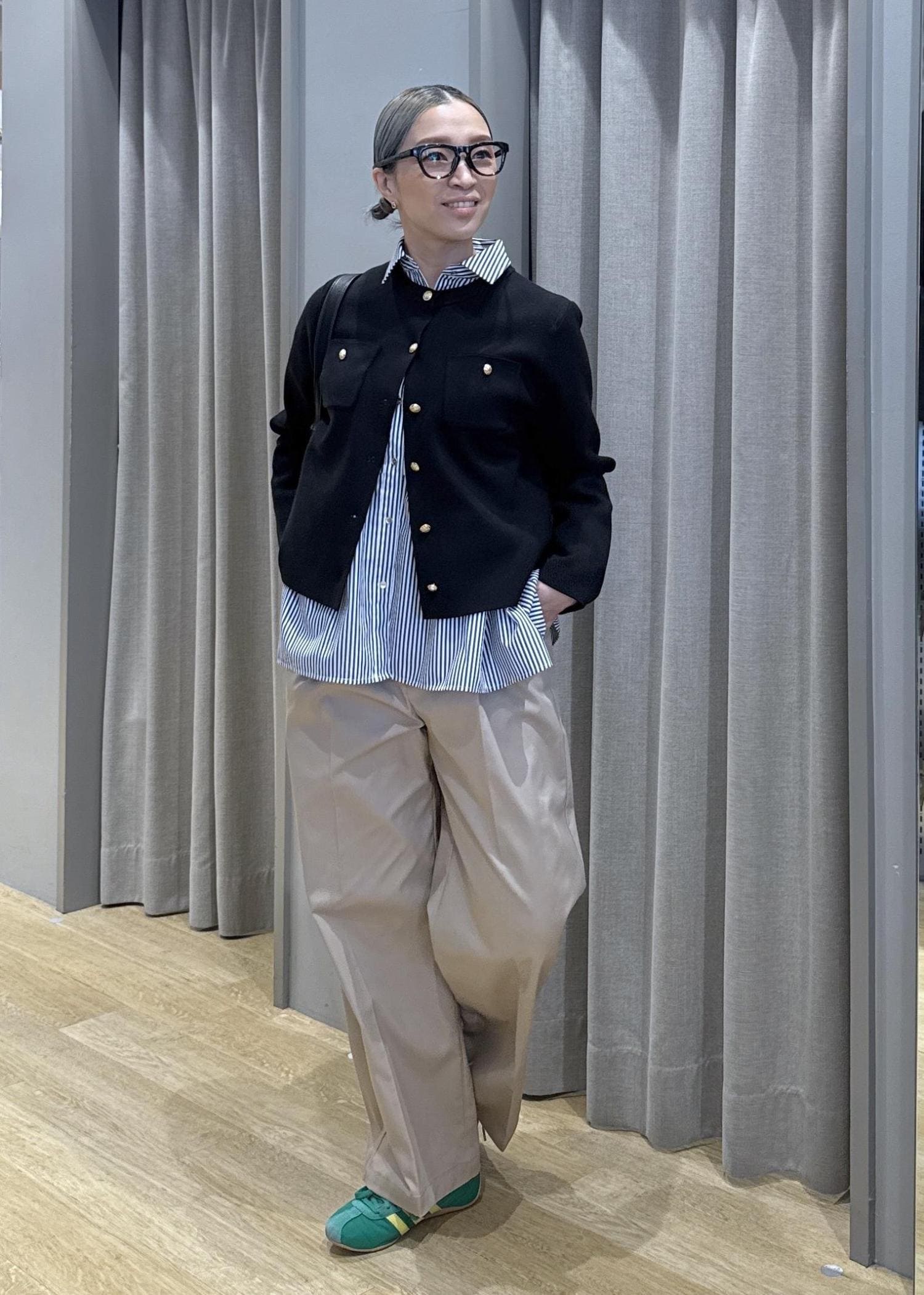 金ボタンのインパクトと中に着ているペプラムラインを崩さない為に、上だけボタンを留めて流して着ています。