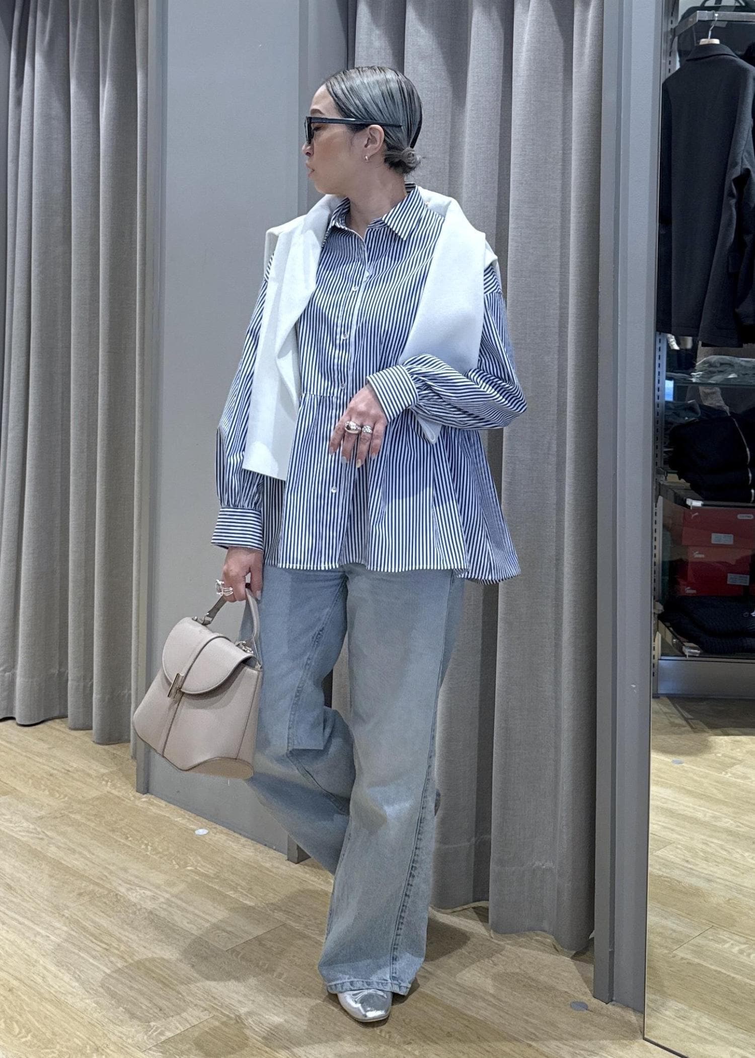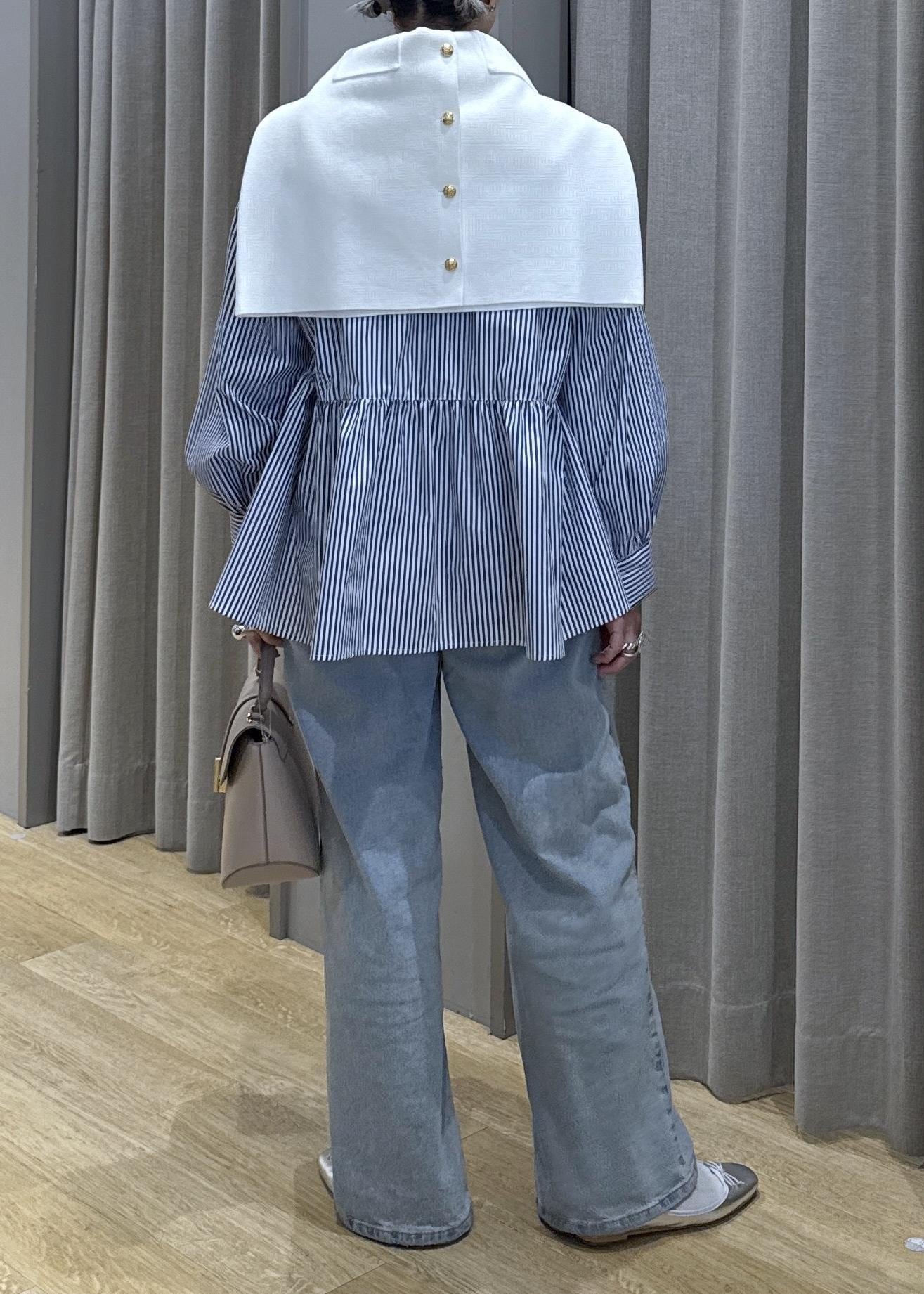 爽やかなストライプに金ボタンのレトロなカーディガンを肩掛けして、