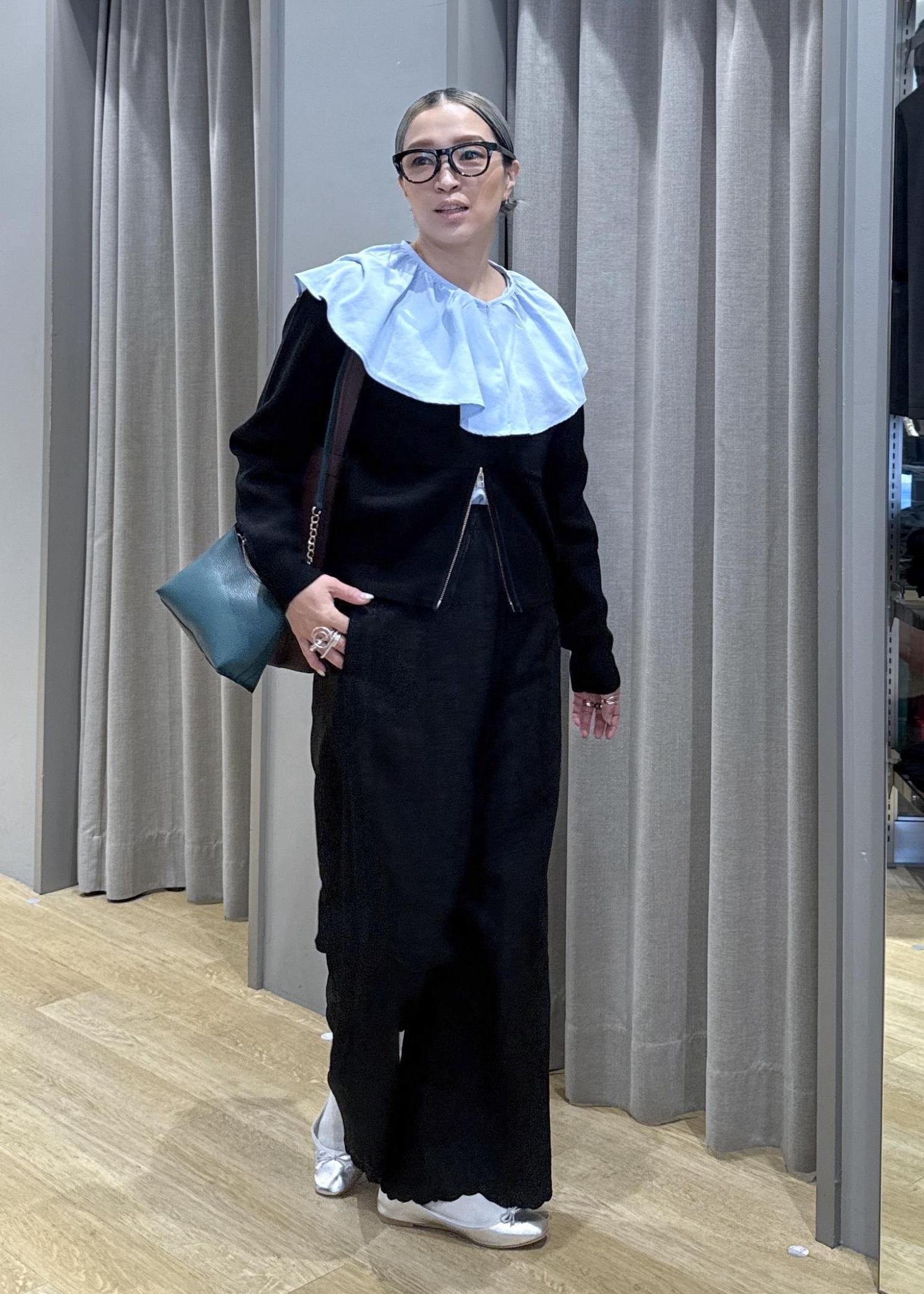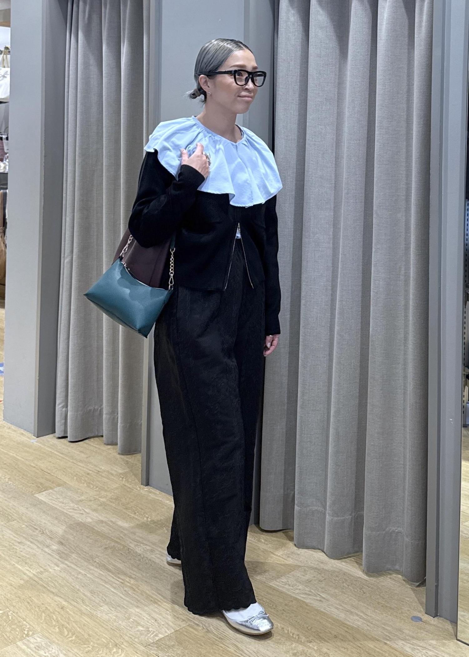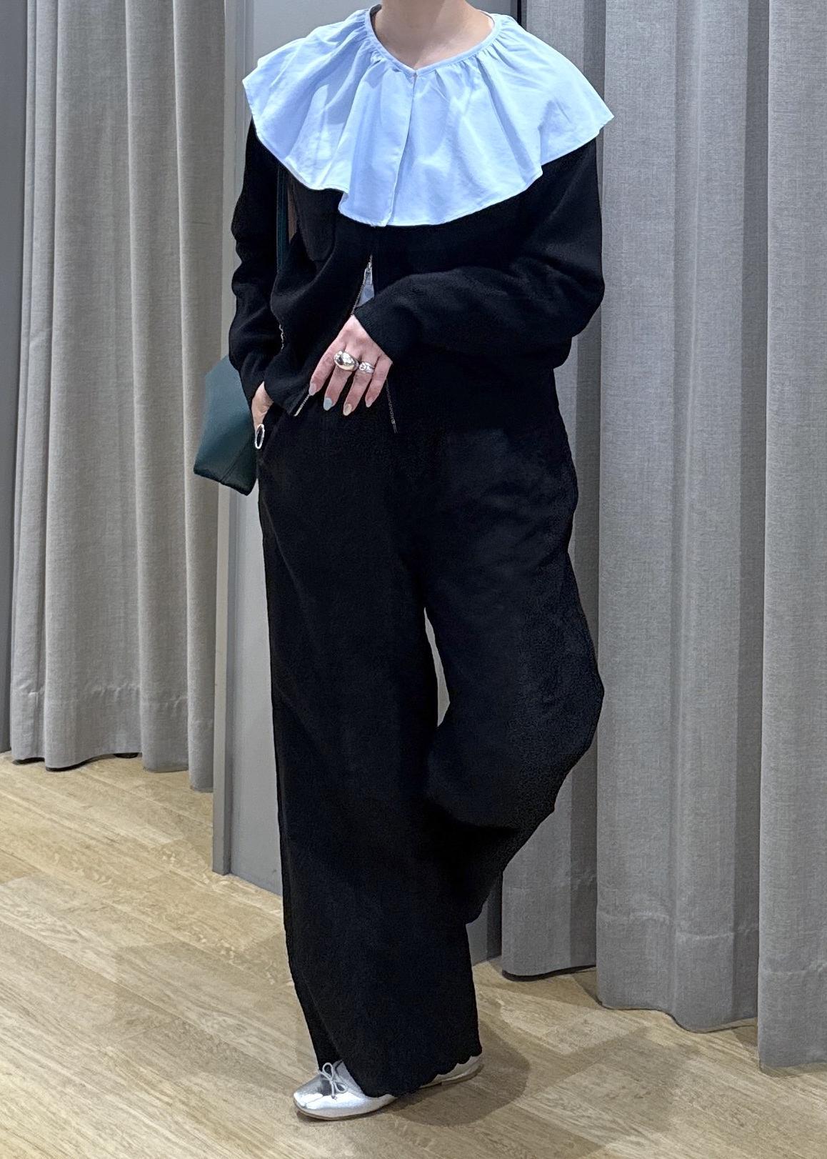 セール品のビッグカラーシャツと新作のジップアップカーディガンを合わせて、