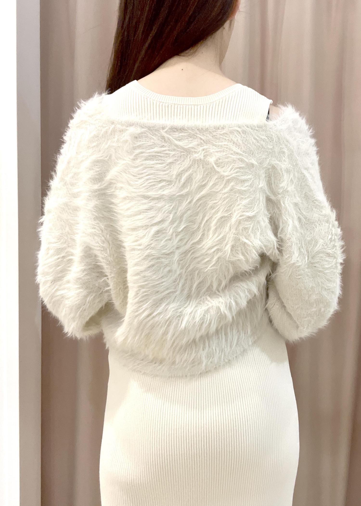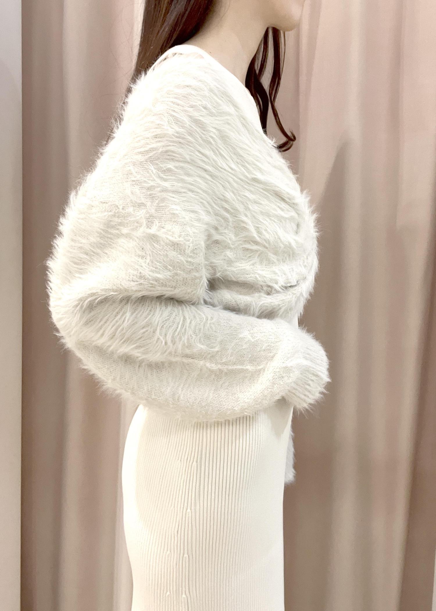 ふわふわの肌触りのいいニットは、ねじりデザインでVネックが大きめです。