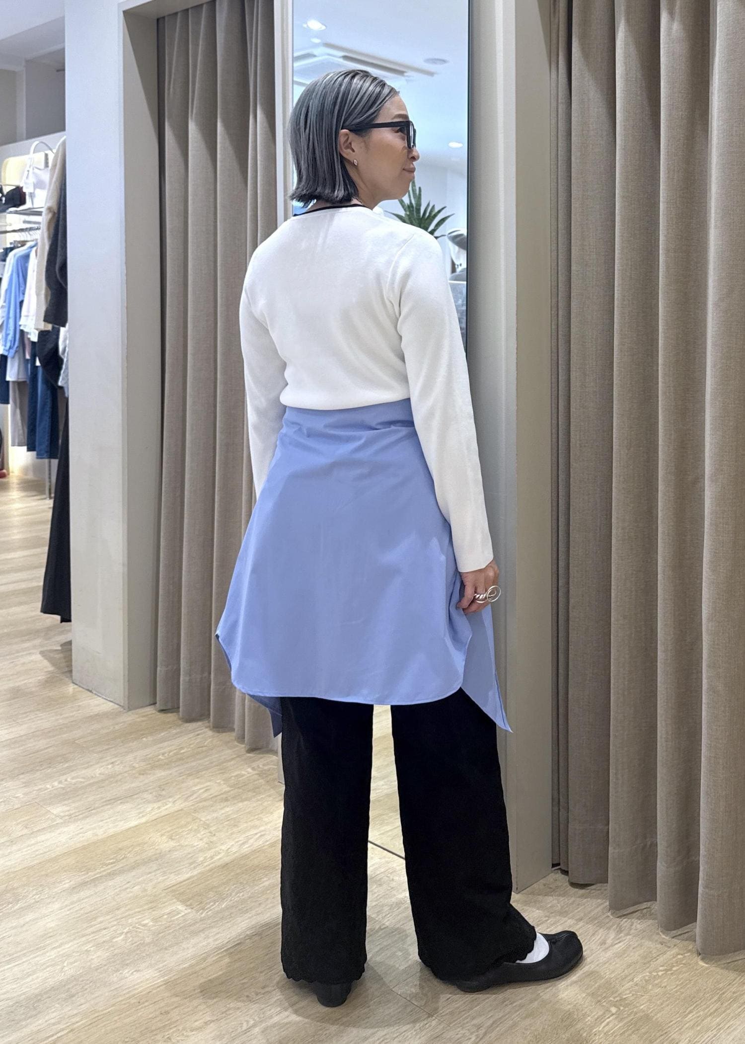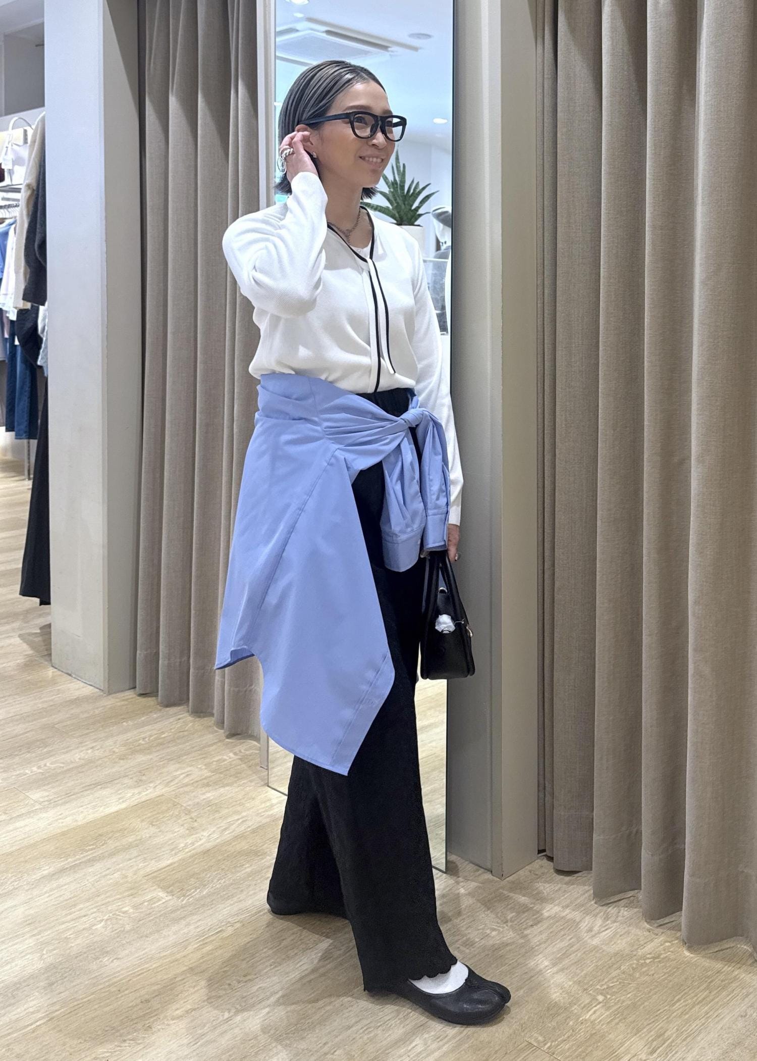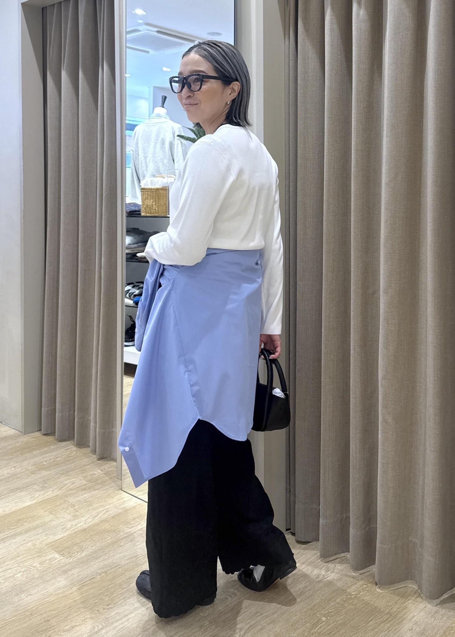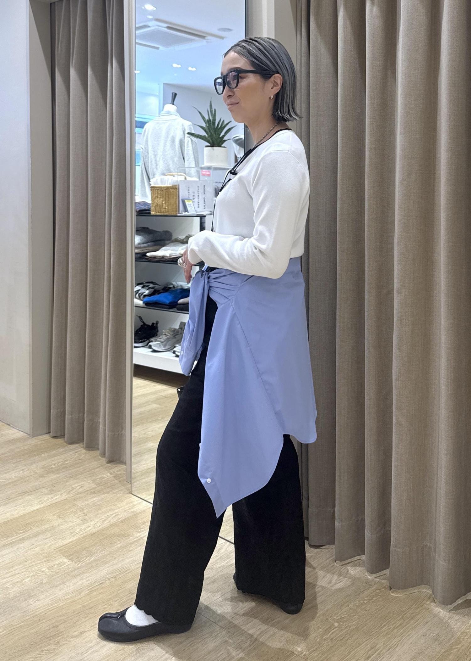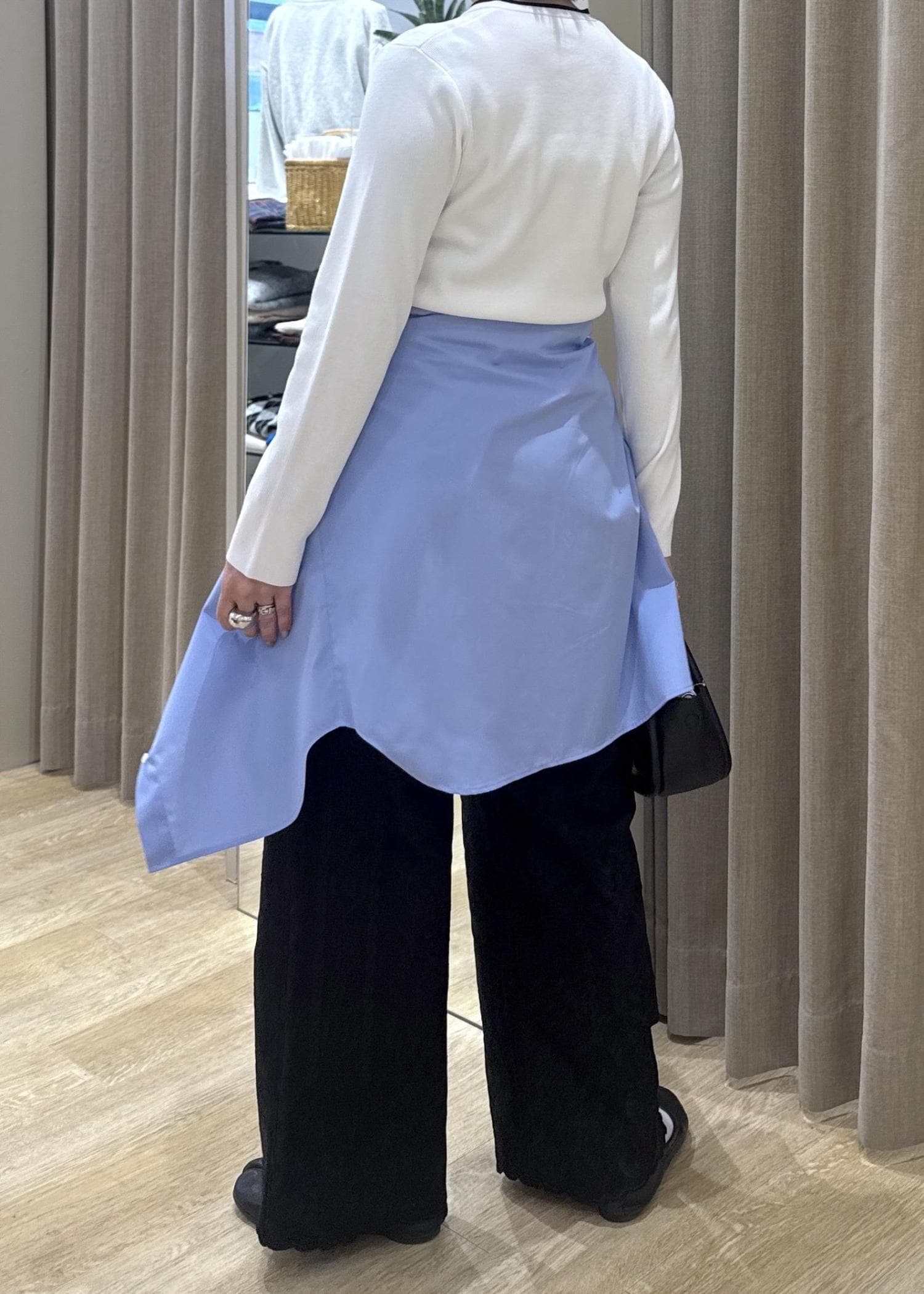 トップスがタイトなので、シャツインした時にウエストのゴム部分とヒップラインをカバーしたくてシャツを腰巻きアレンジしました。
