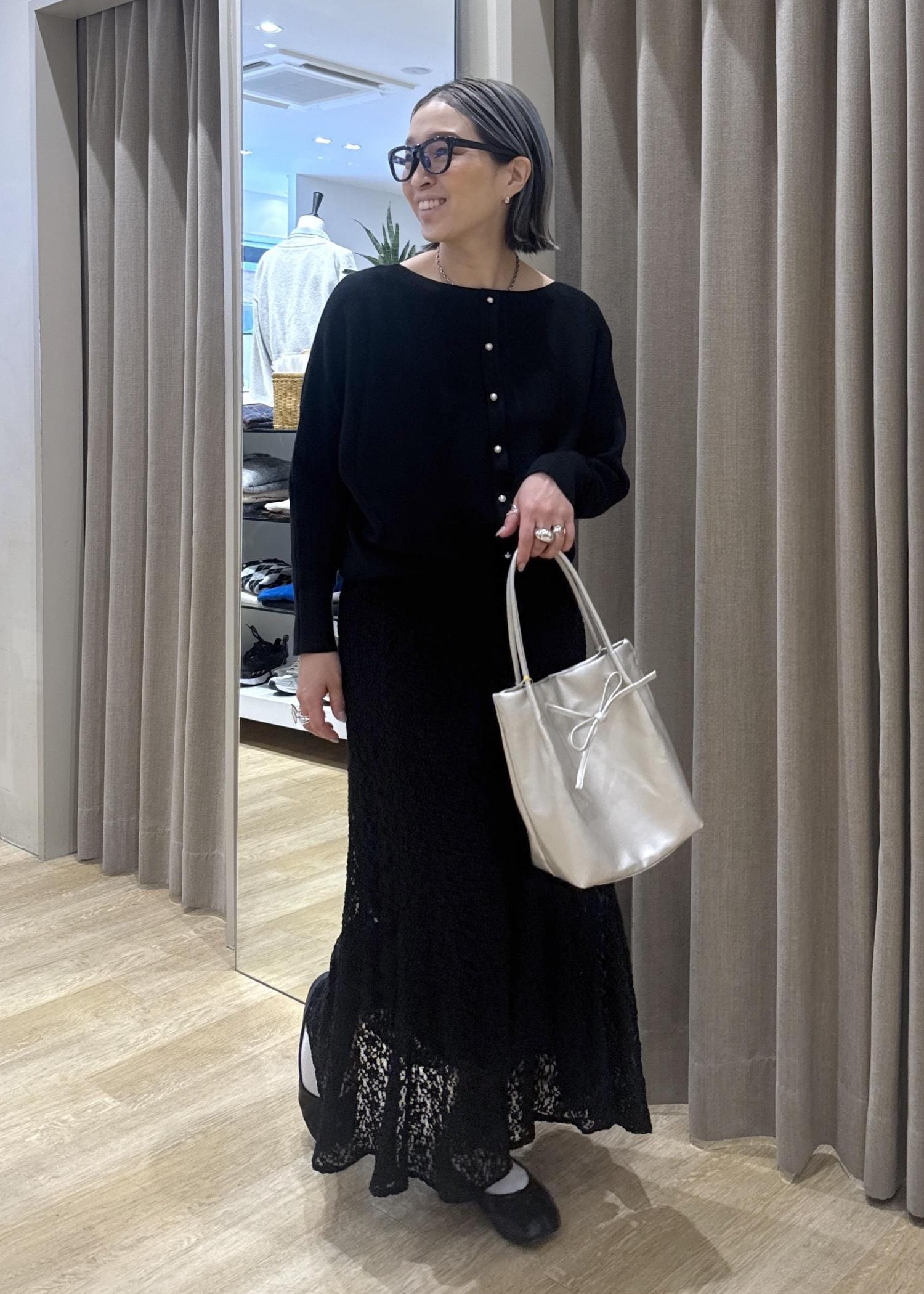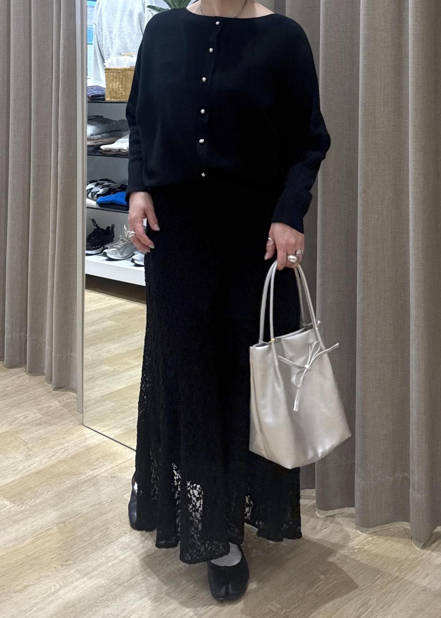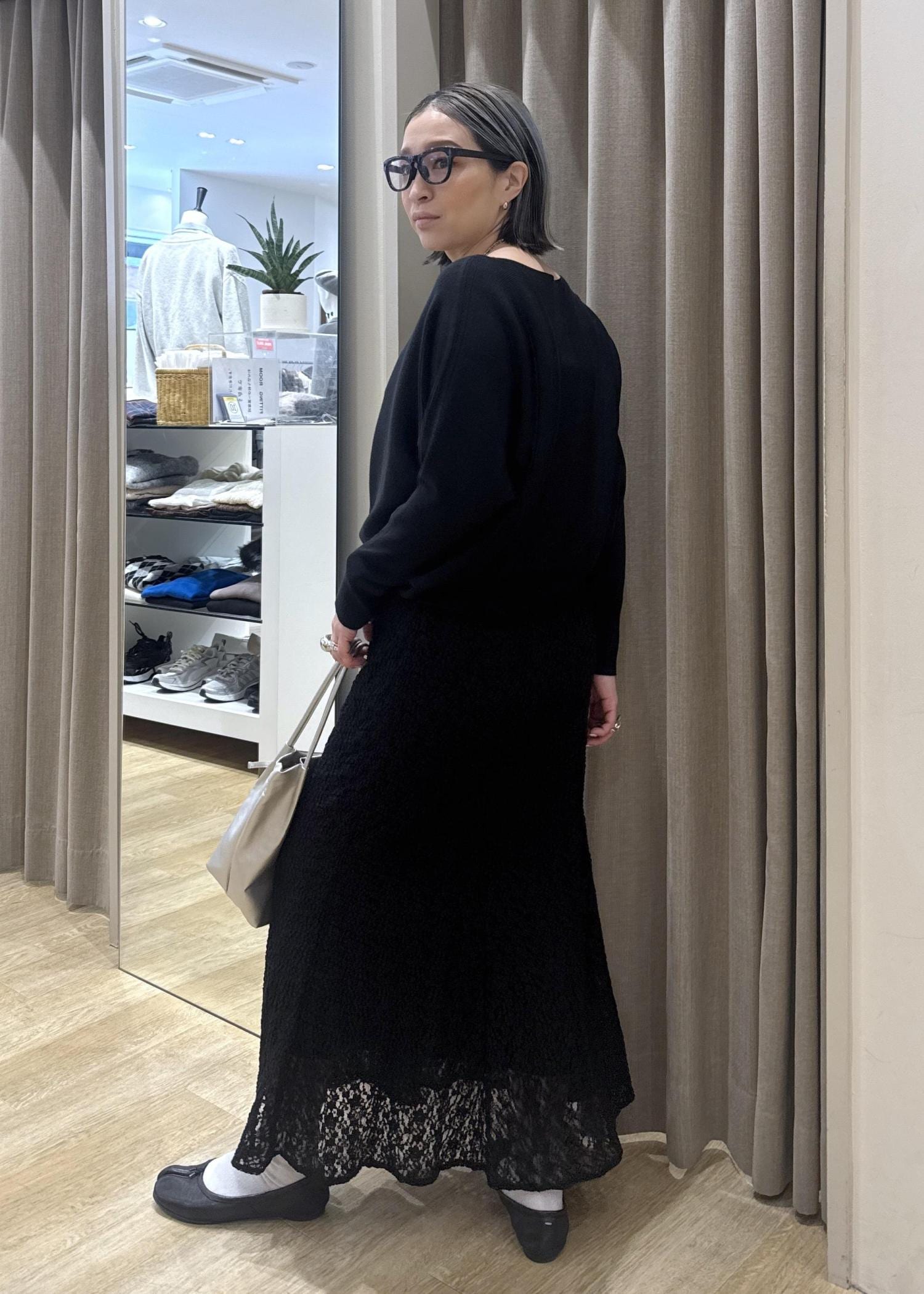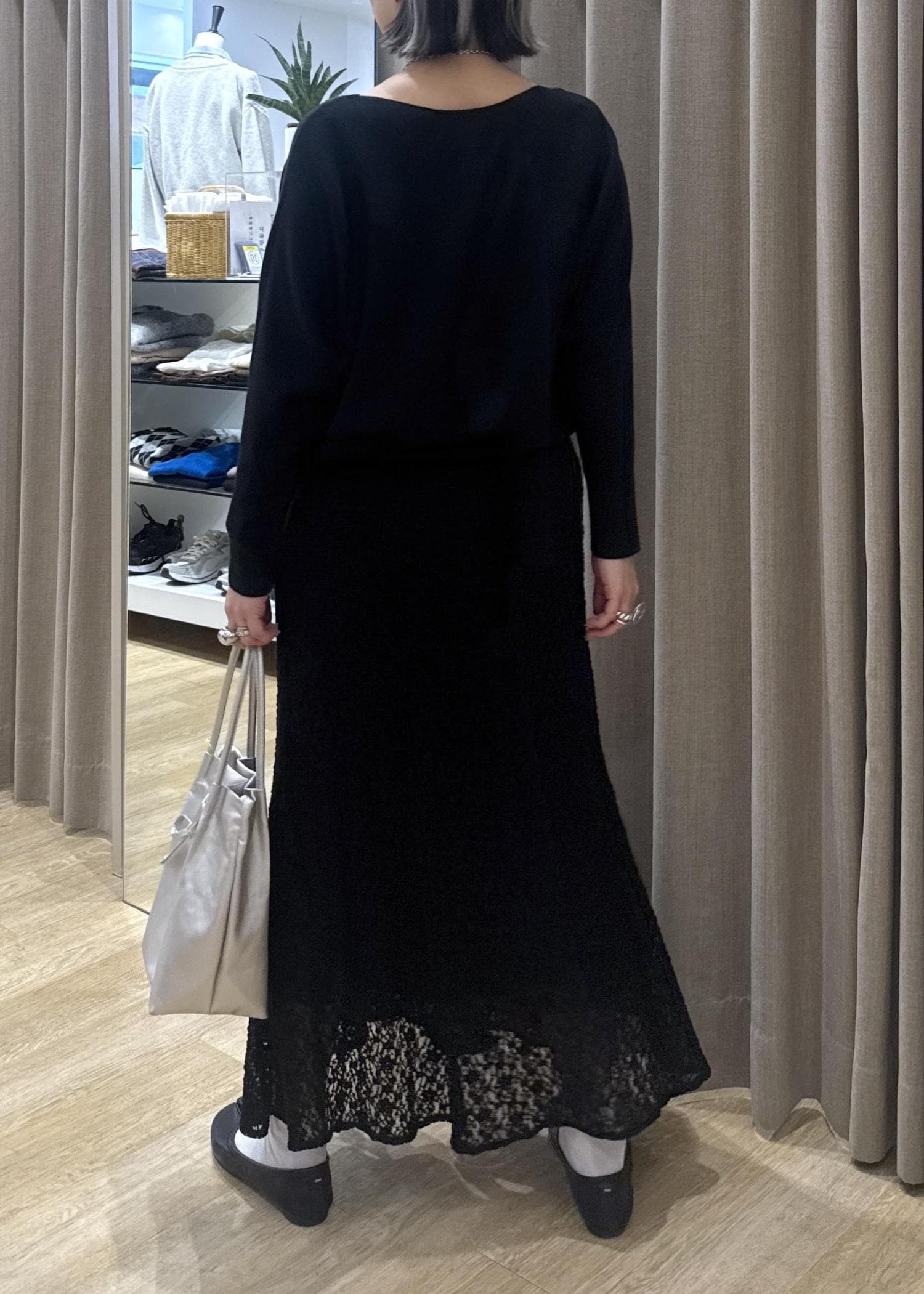 フェミニンが苦手な方は、一度このようにブラックのワントーンでレースアイテムを使ってみて下さい。