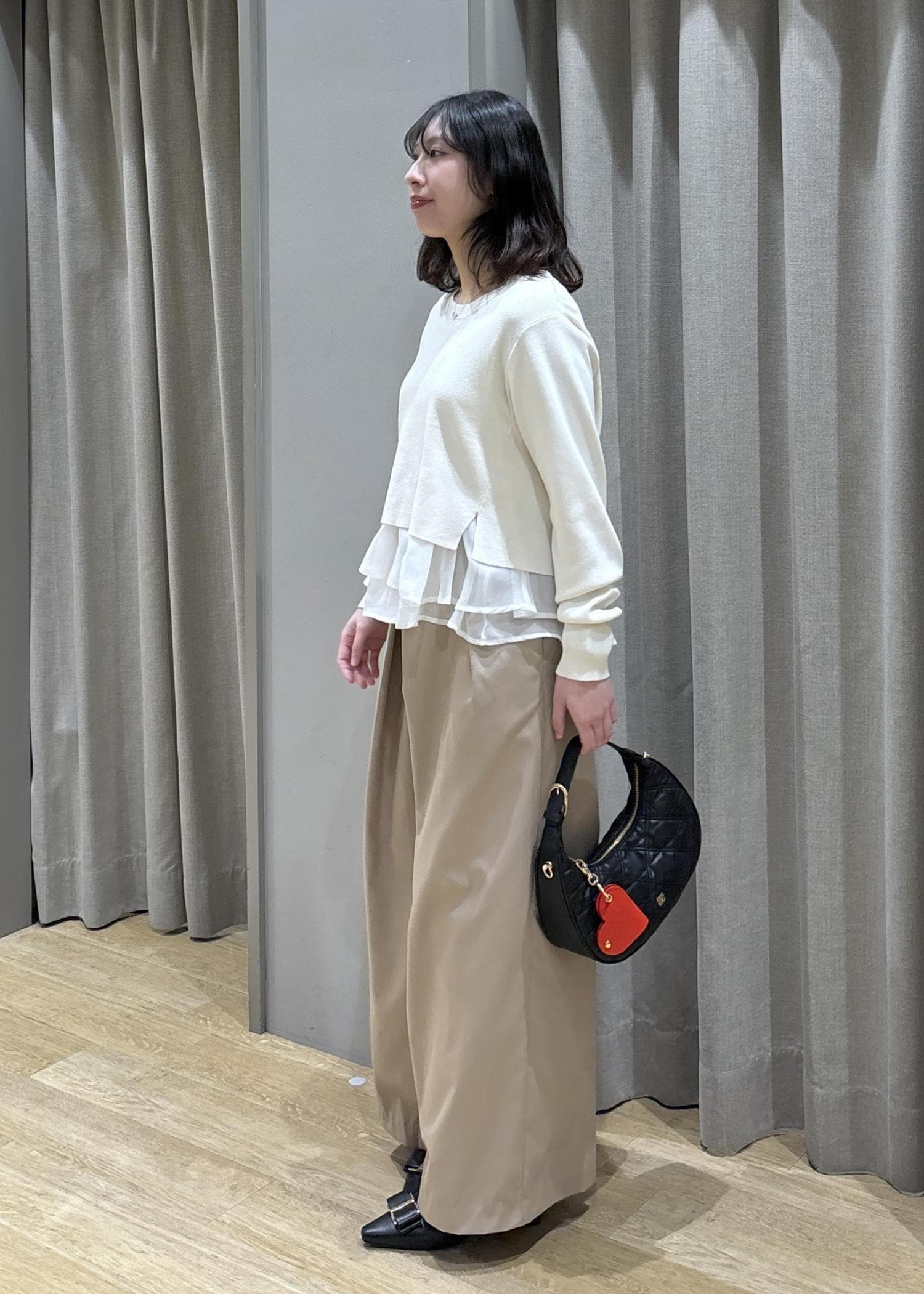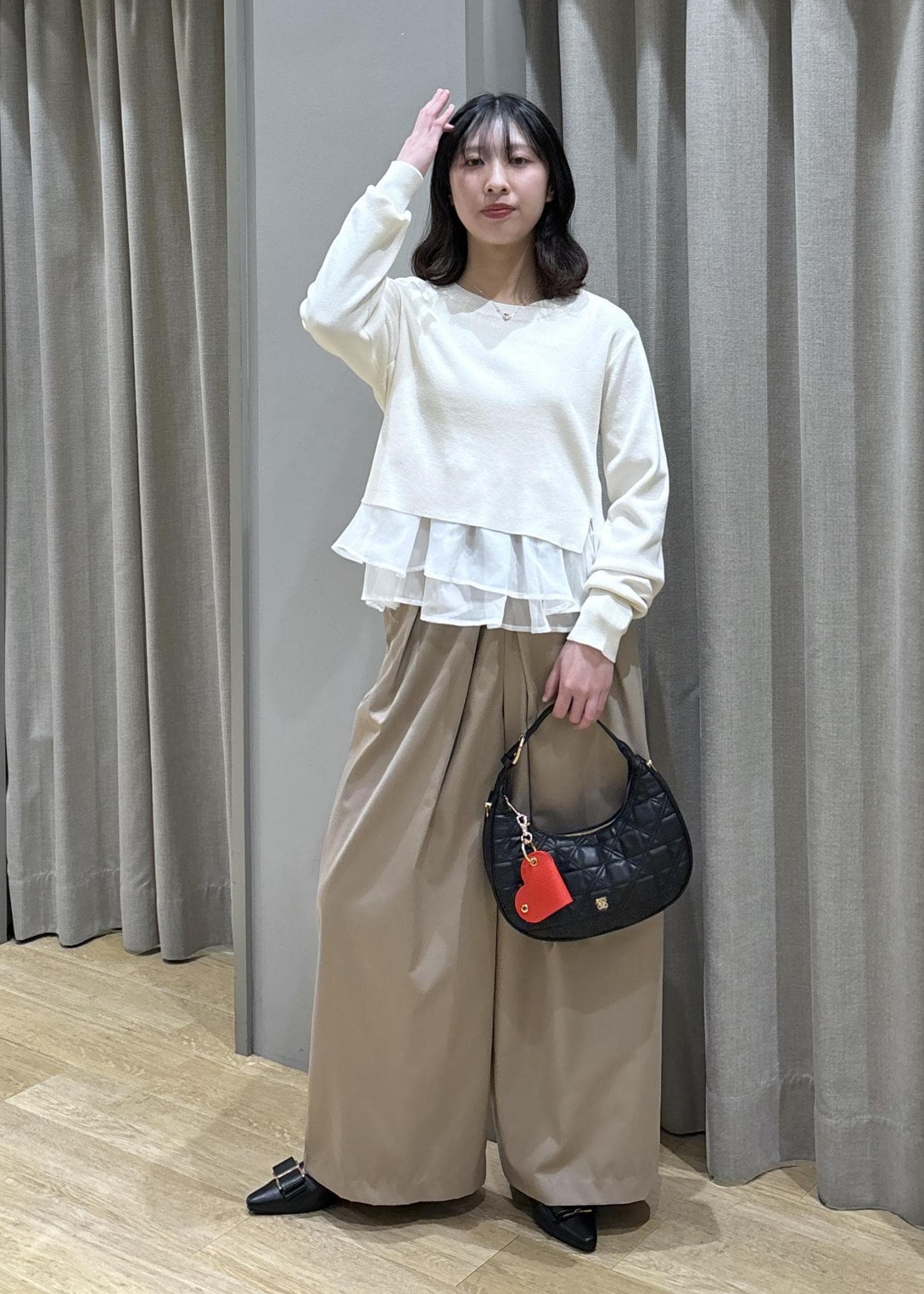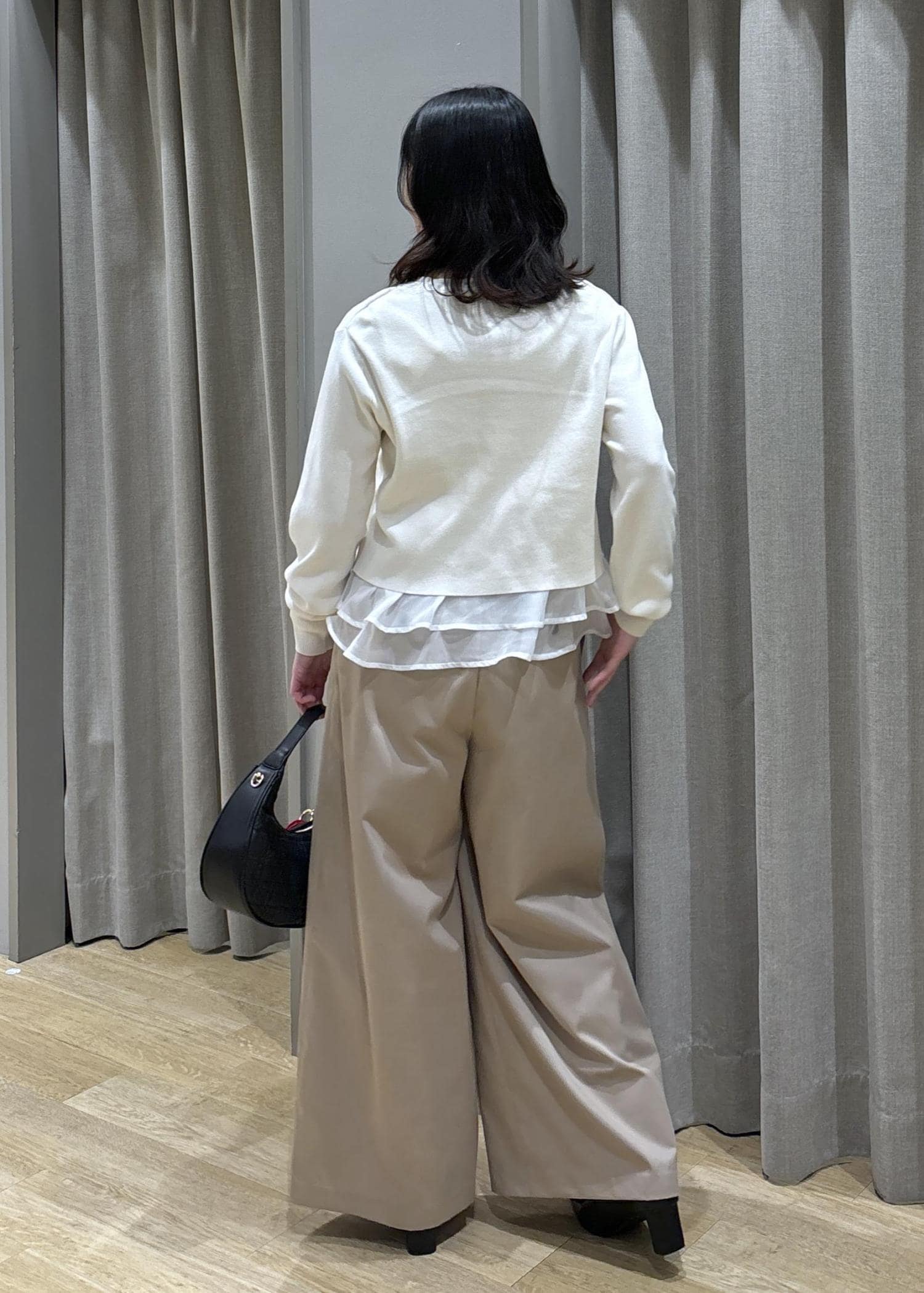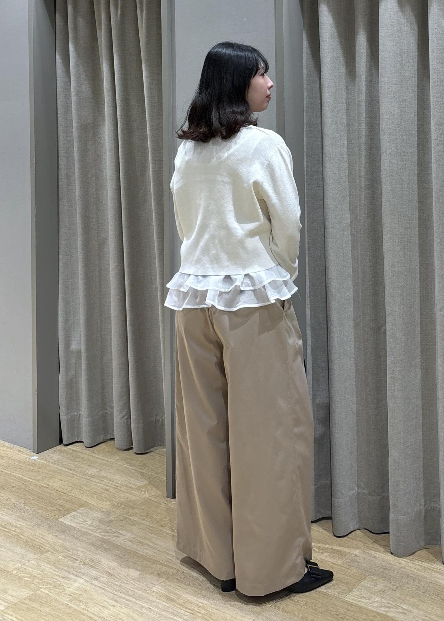 ペプラムオーガンジードッキングニット×フロントタックパンツ