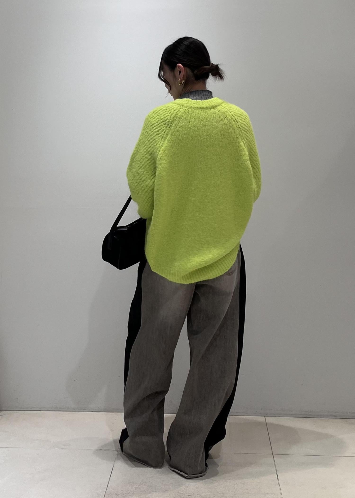 目をひくカラーのニットトップスに